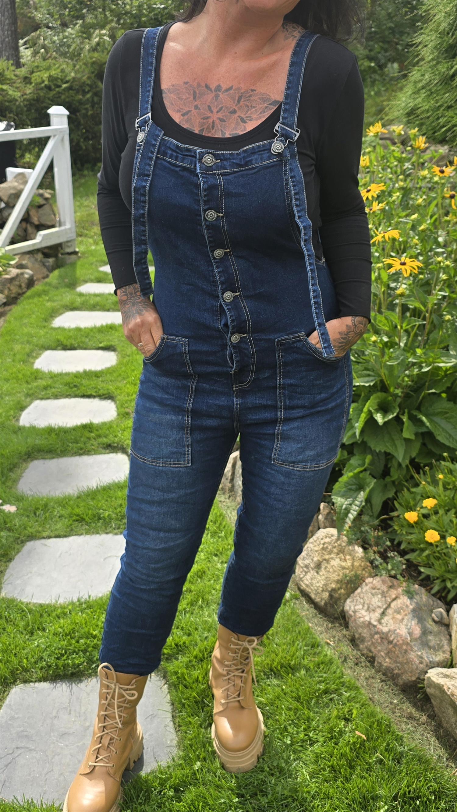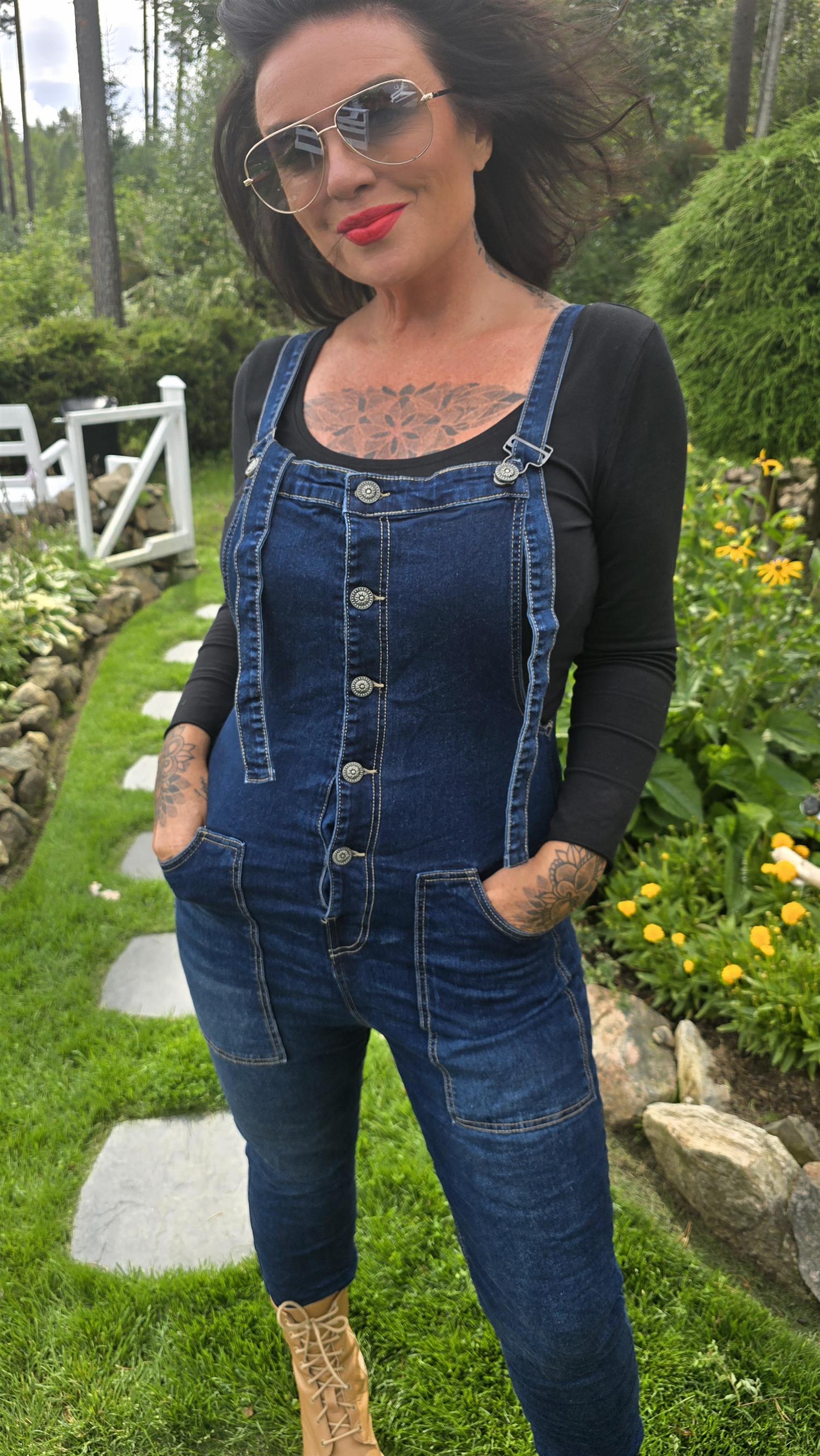 Slimmad mörk denim jumpsuit med skön stretch. Lommer I sidan och bak. Regulerbara skulderremmar. Litt liten I str så här kan man gå upp en size