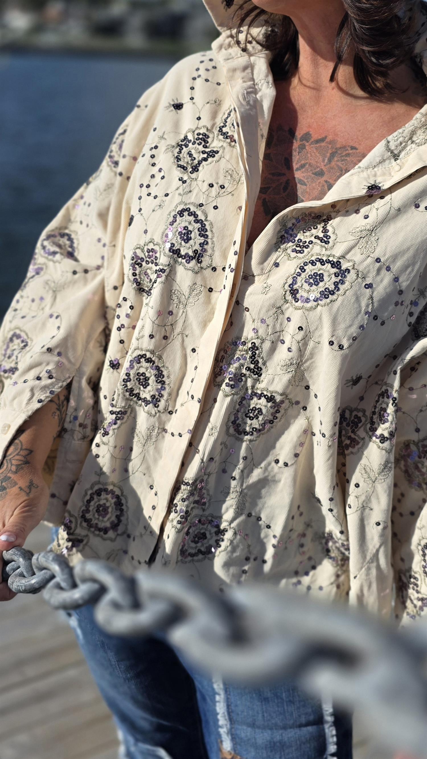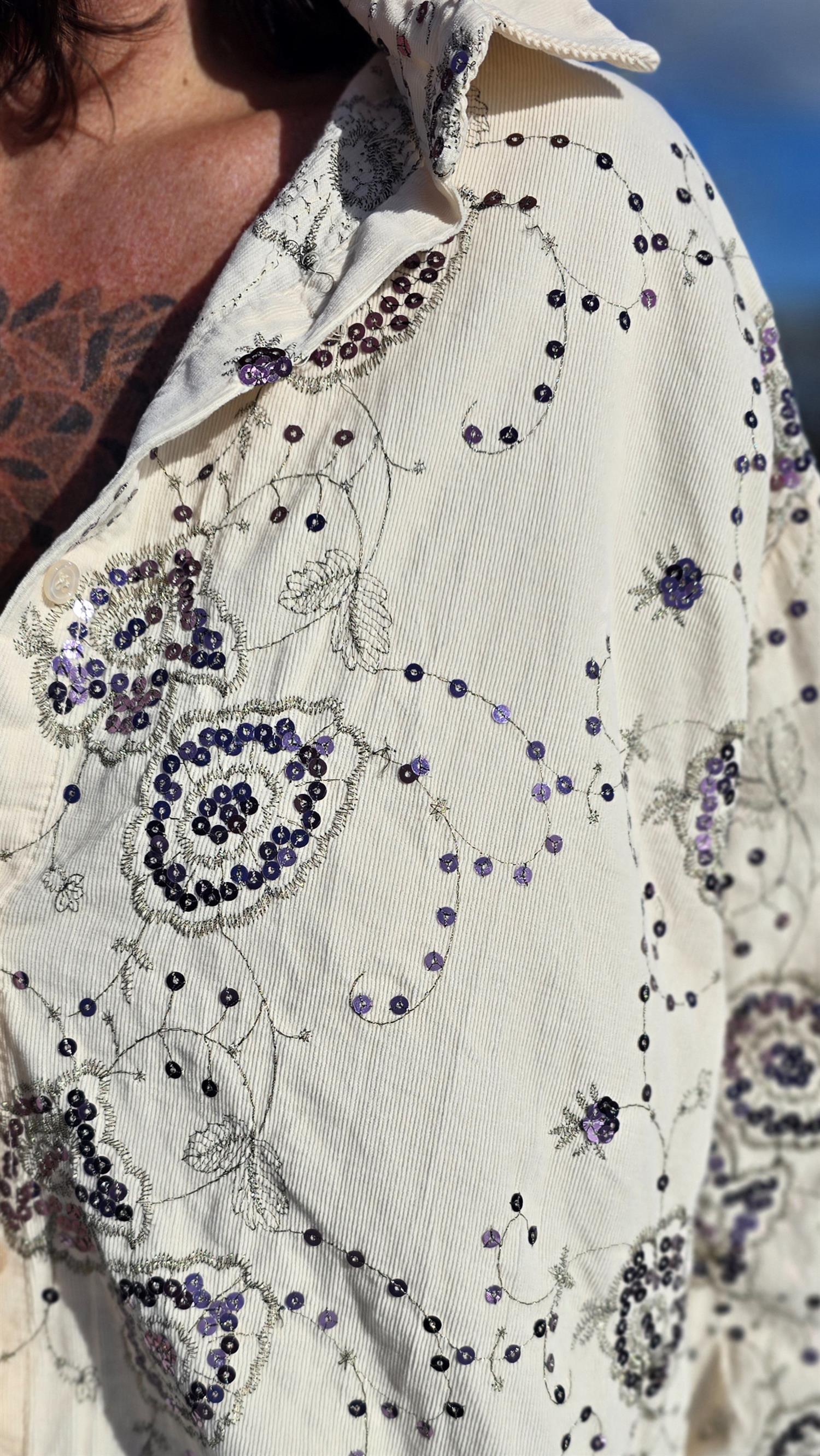 En skjorte i beige minicord-kvalitet med lange ermer og bred mansjett nederst. Den er perfekt å brette opp, siden samme mønster fra utsiden også kommer fram på innsiden av ermene – en gjennomført og stilig detalj. Skjorten har krage, knapper hele veien med en skjult knappestolpe, og et avrundet splitt i sidene. Den er litt lengre bak enn foran og har påsydde blomsterdetaljer med paljetter i lilla nyanser som gir et unikt og elegant preg.