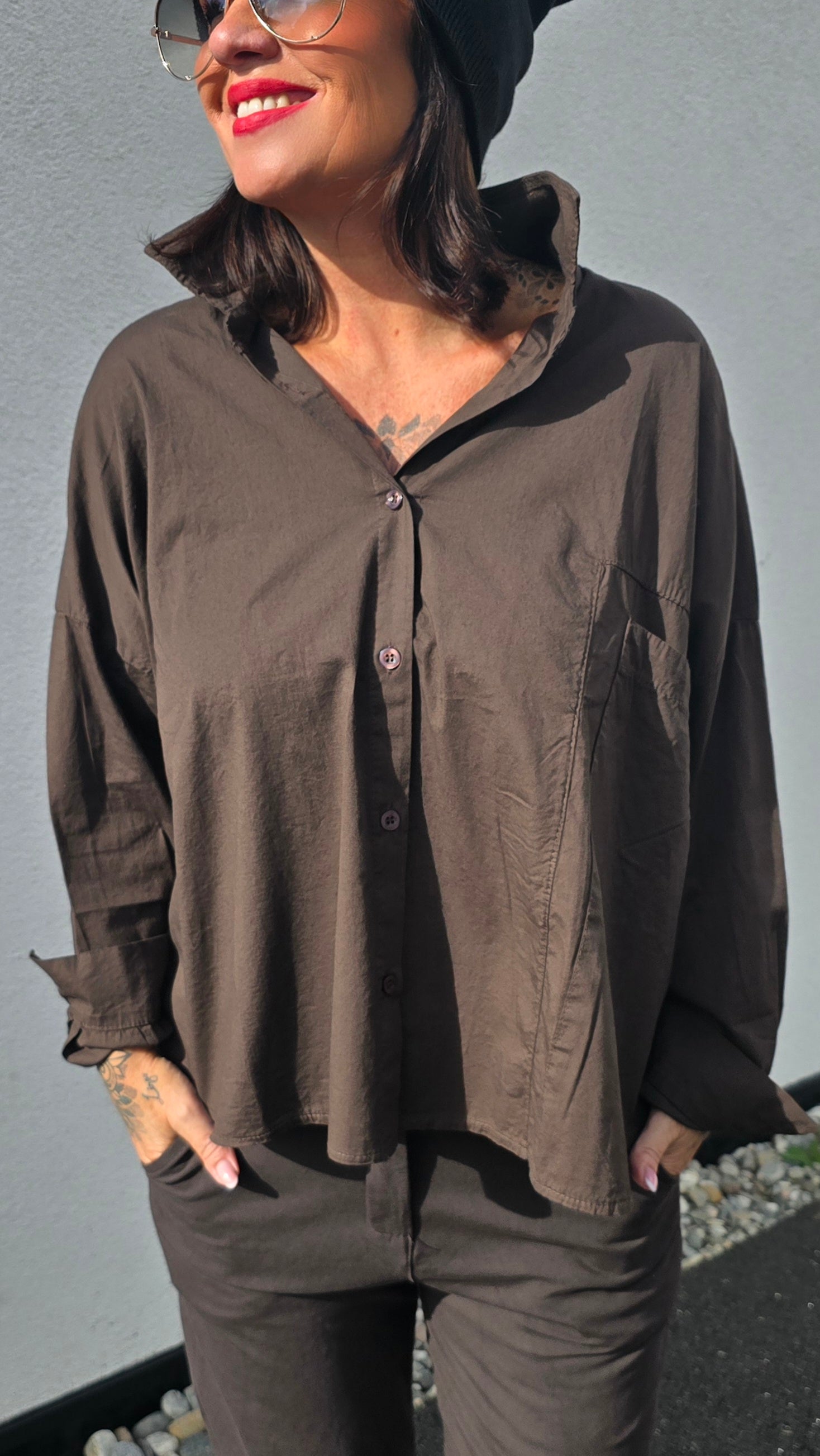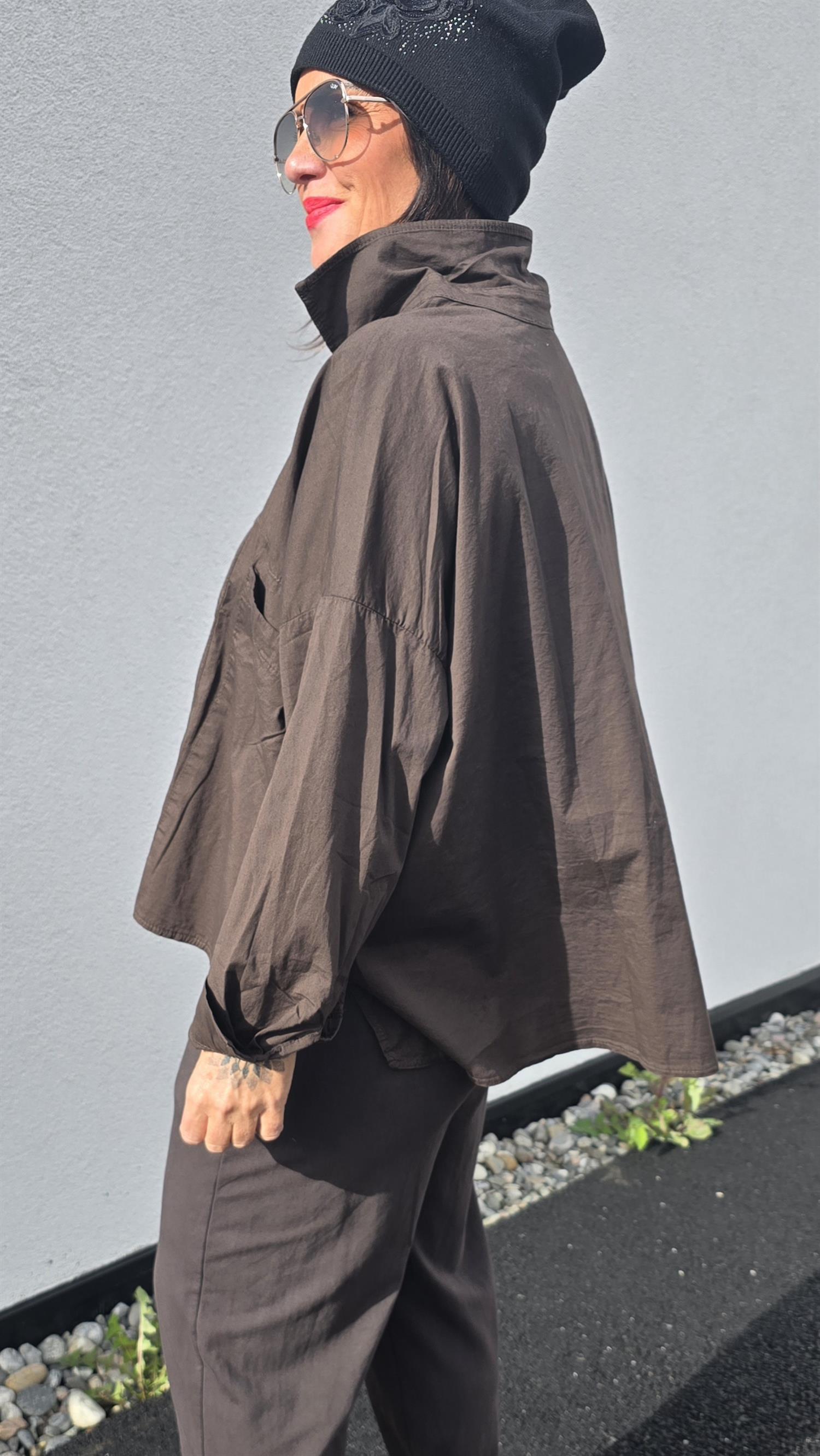 Skjorta I crispy cotton stil. Den har extra god vidde och långa armar. Stor lomme på ena sidan I front. Superkul på. Litt längre bak.