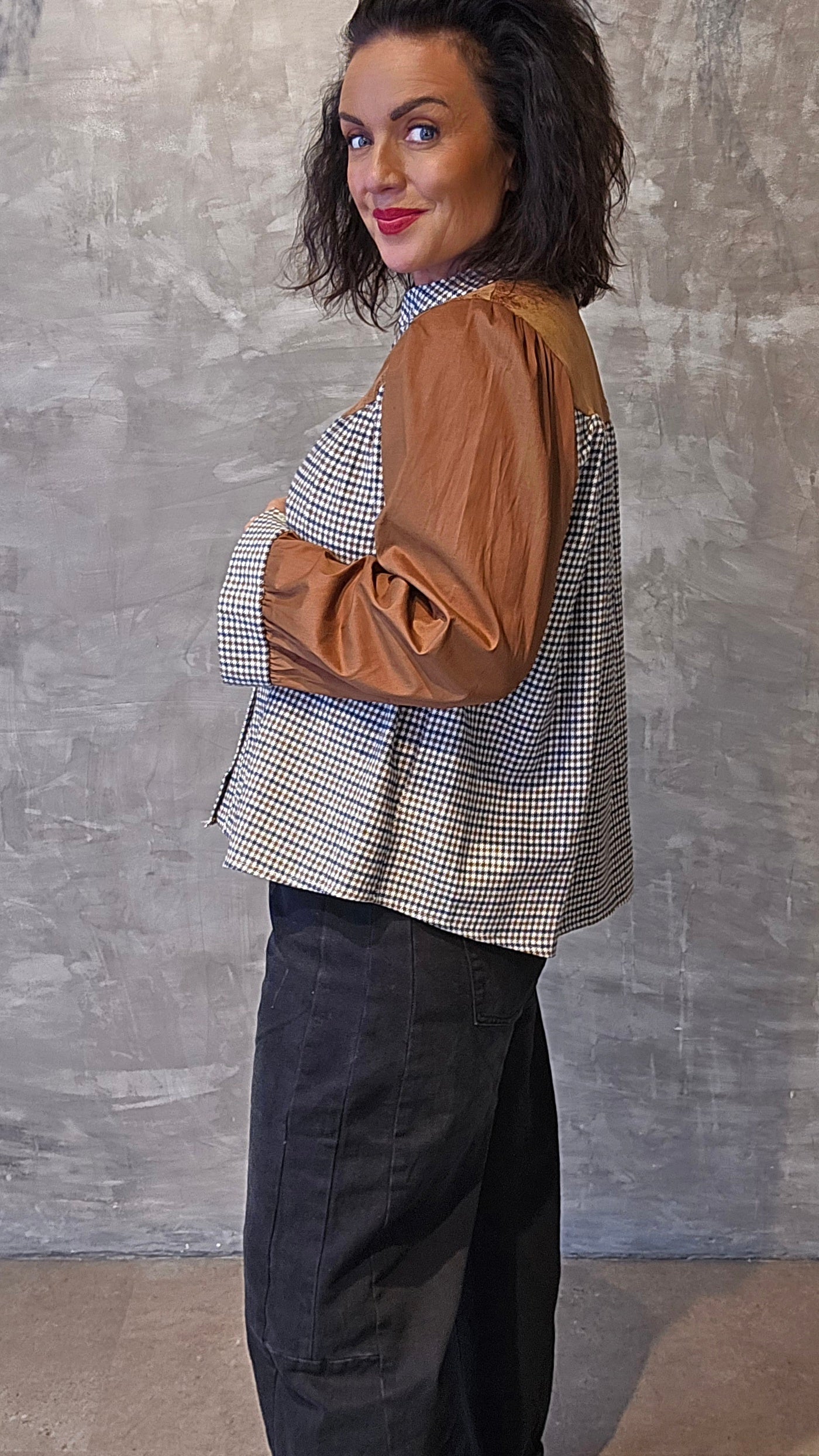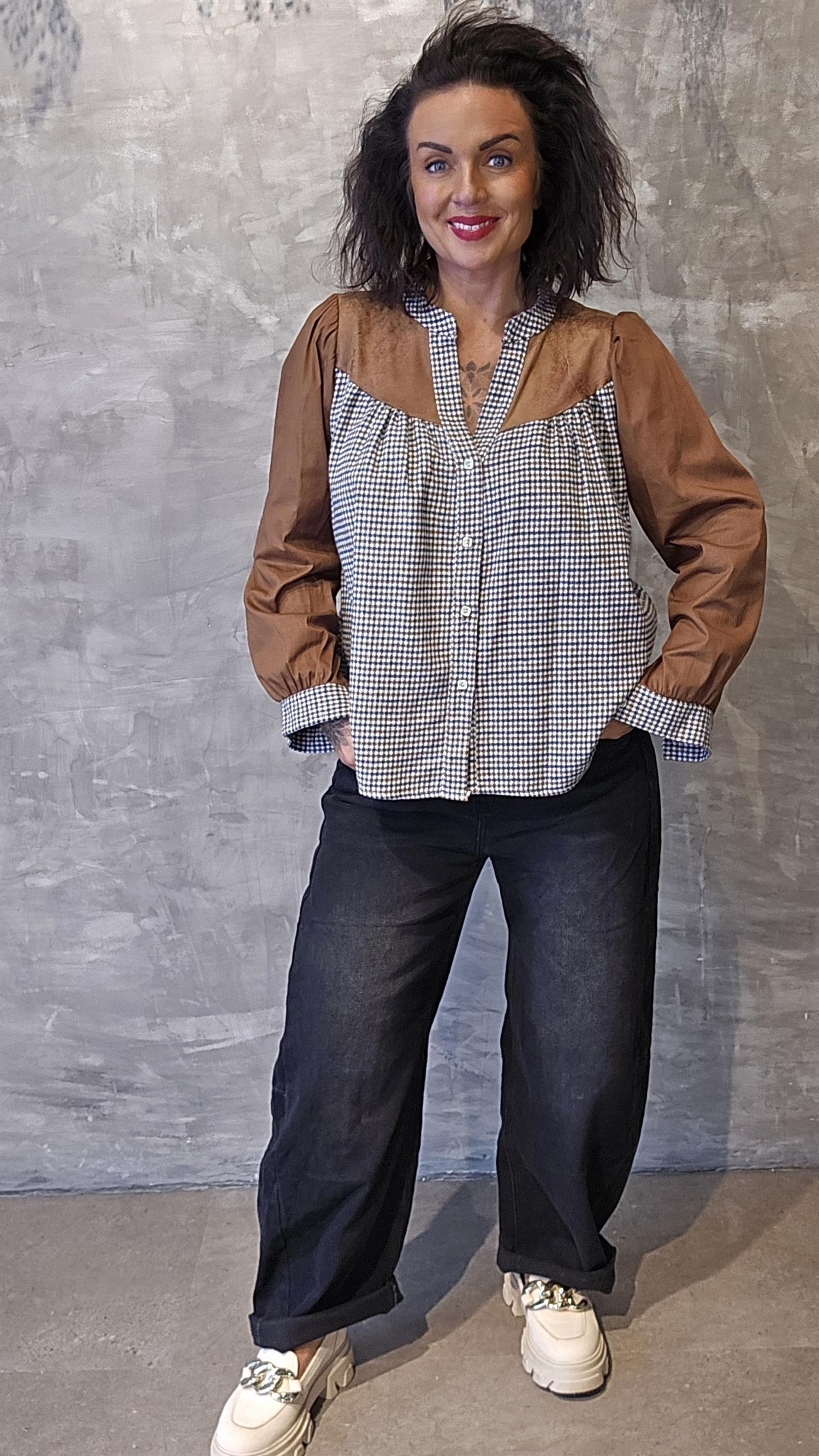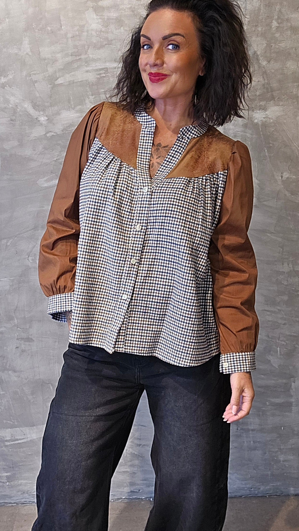 Fin skjorte bluse med små ruter. Fin puffig arm. Läcker I ryggen. Velour matrial på skulder.