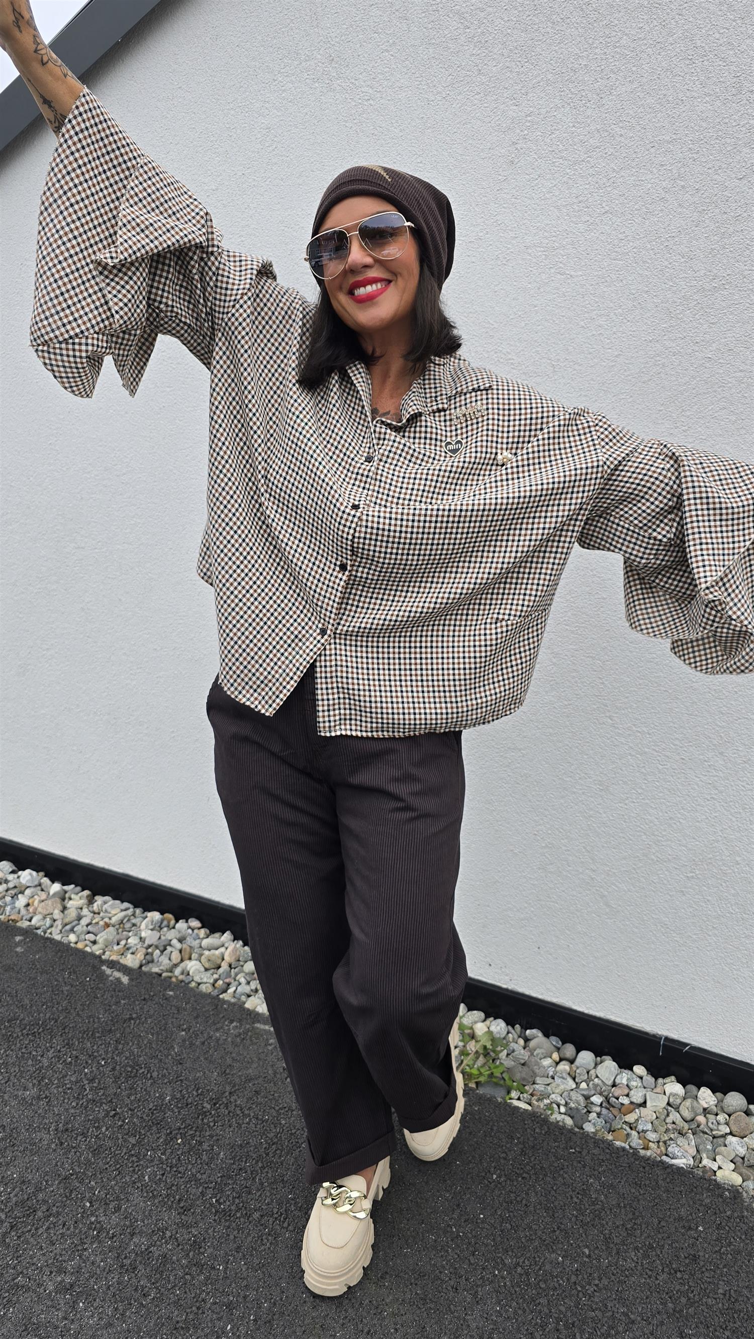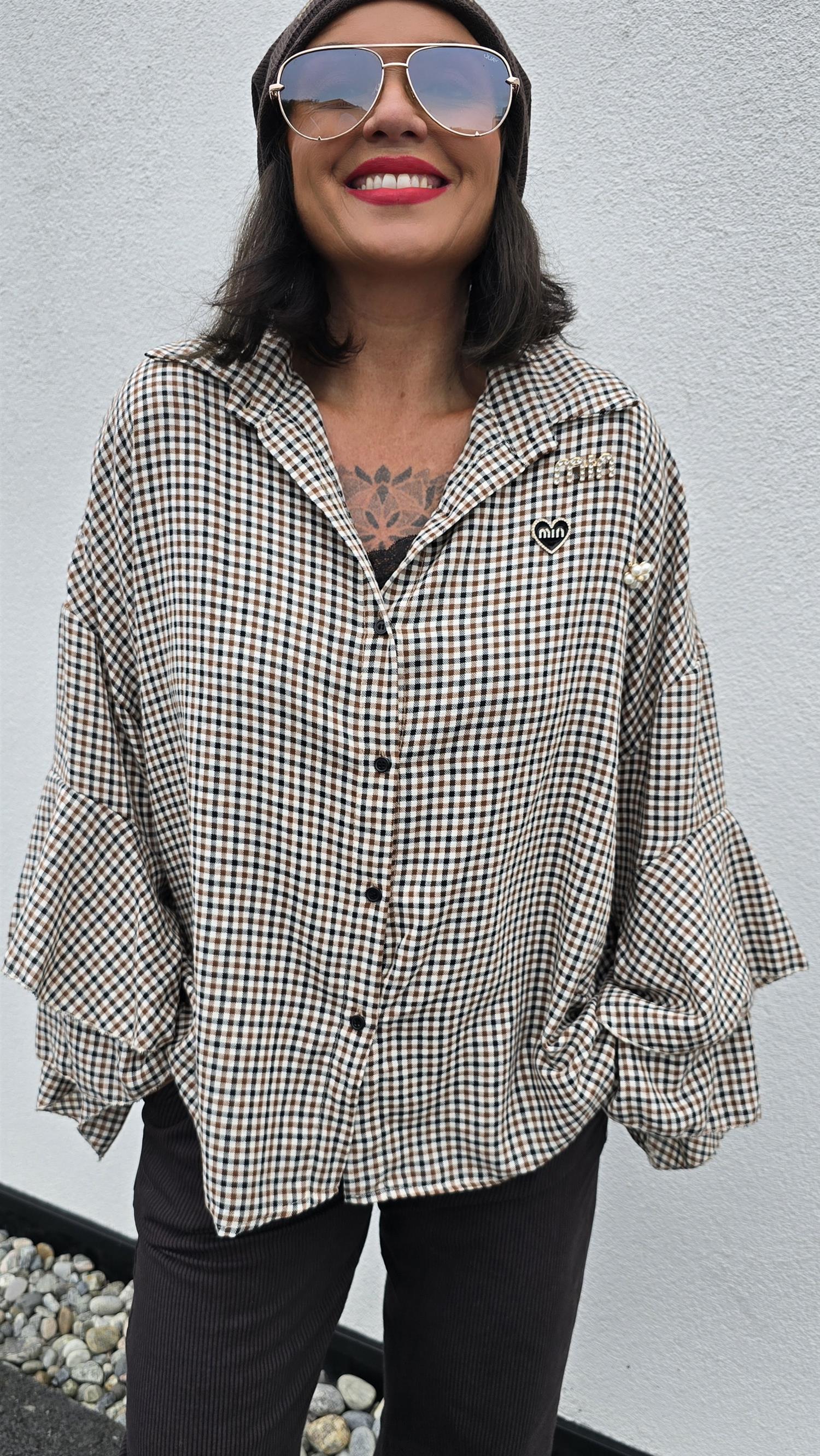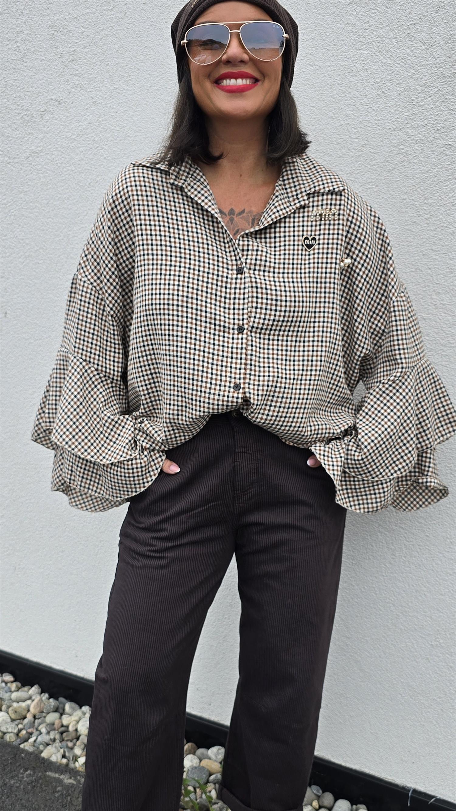 Rutig skjorta med superfina armar. Extra volanger på armen. God vidde. Fina broscher på ena sidan.