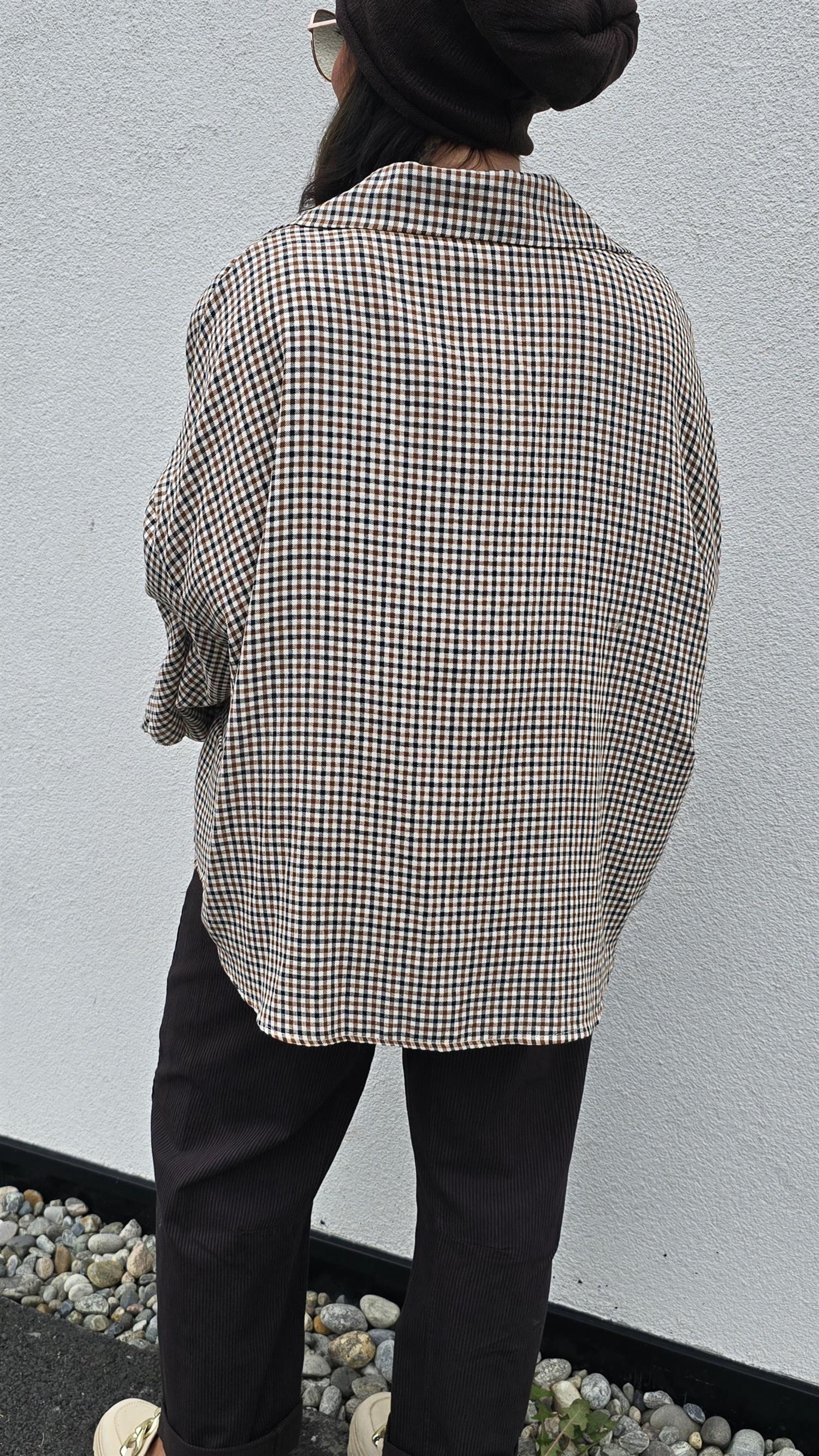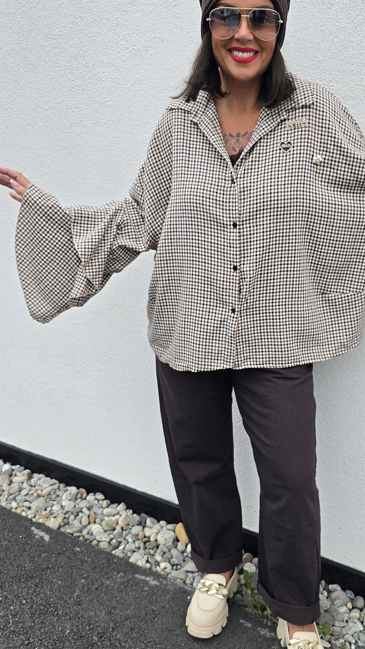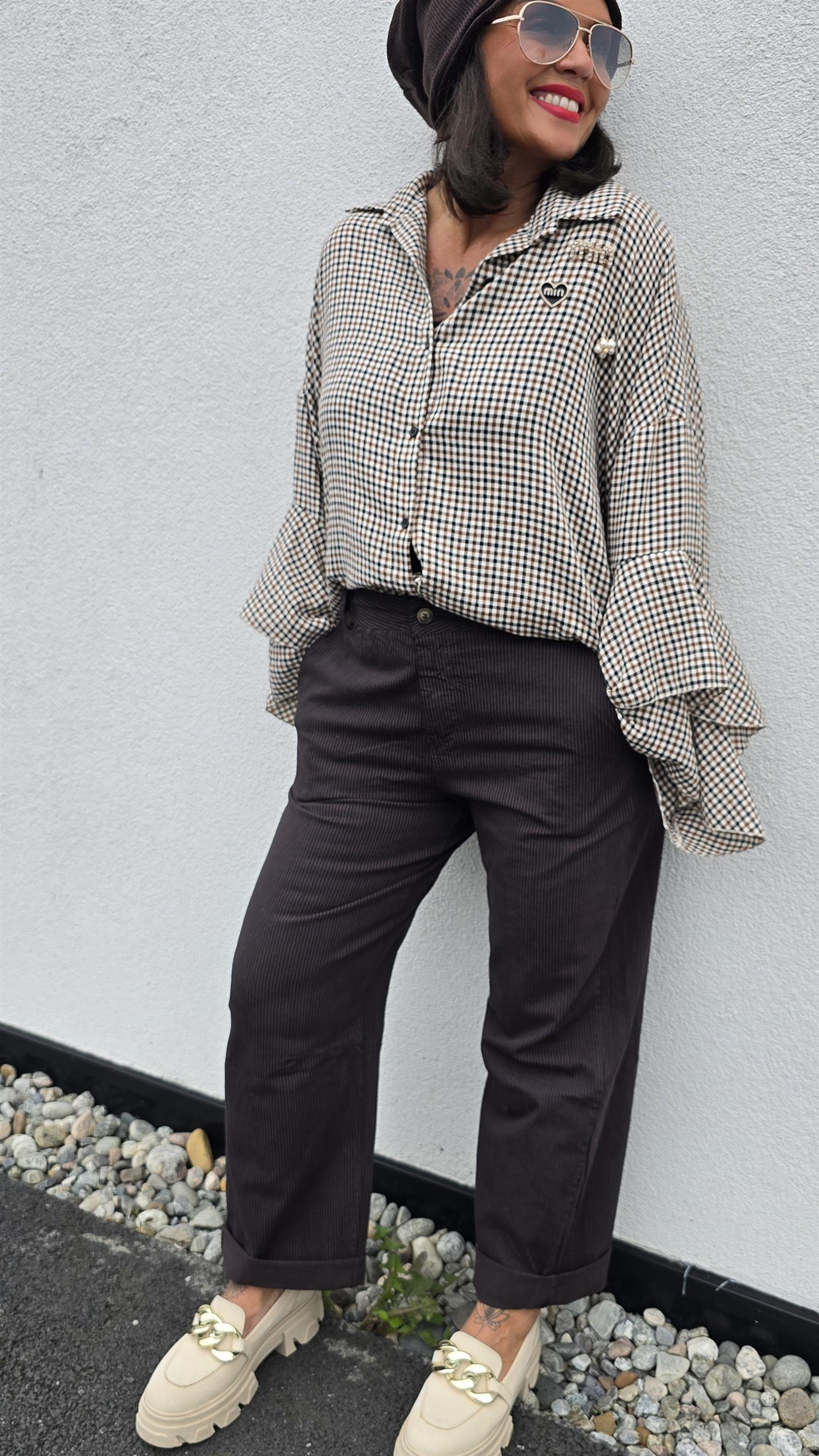 Rutig skjorta med superfina armar. Extra volanger på armen. God vidde. Fina broscher på ena sidan.