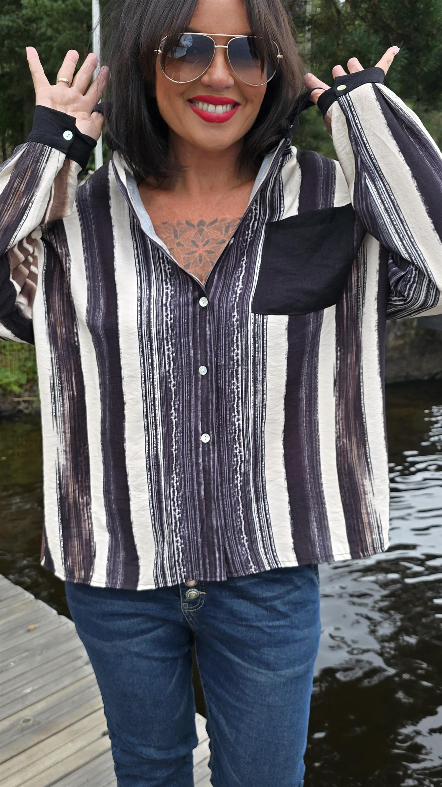 Snygg skjorta med striper . Lös och ledig modell En bröst lomme I svart. Långa armar. Längre bak.