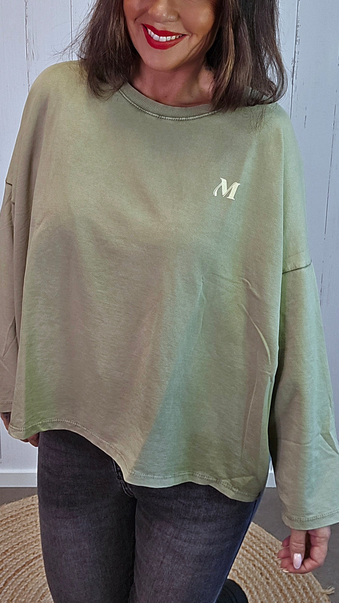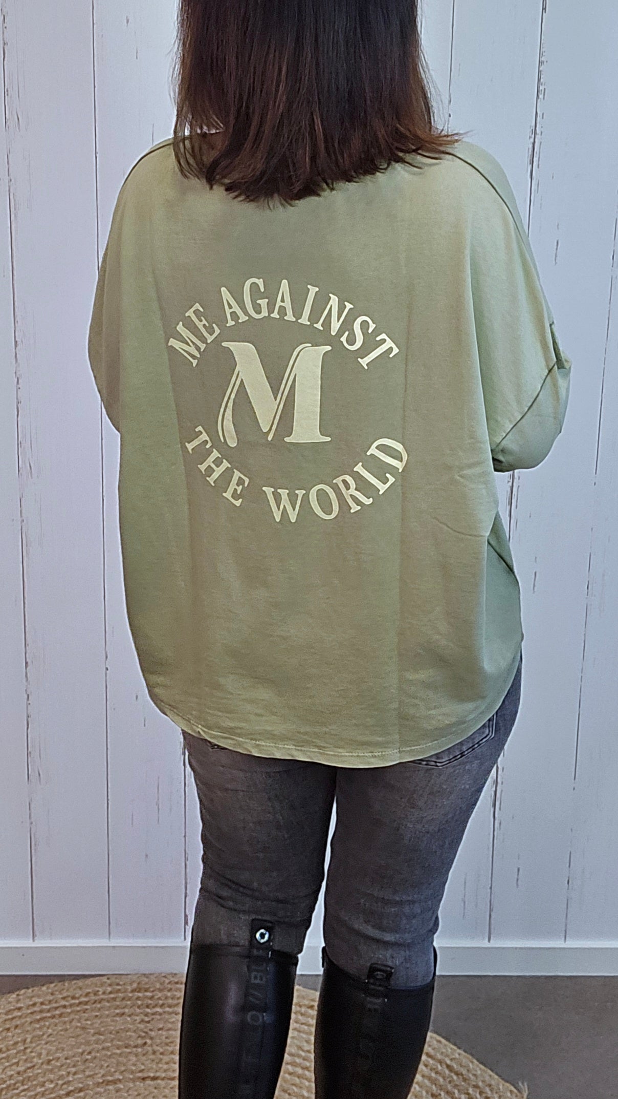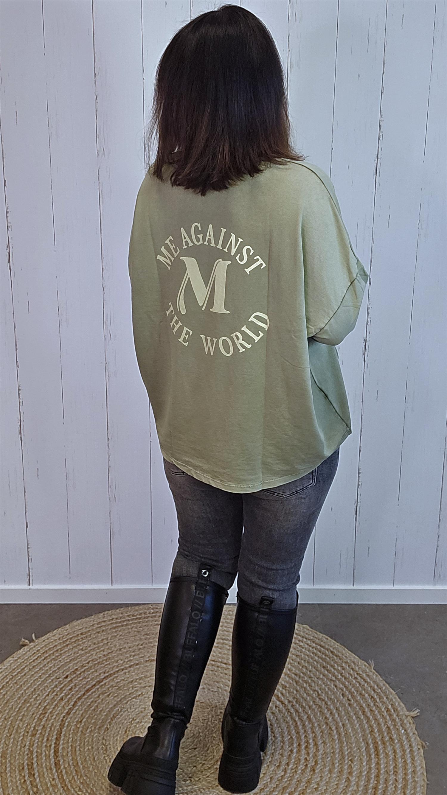 En myk og deilig topp med lange ermer og båthals med ribbet kant. Modellen har et enkelt og tidløst design i front, mens baksiden er dekorert med teksten Me Against The World og en stor M i midten – en tøff detalj som gir plagget et unikt preg. Laget i en god kvalitet med høy andel bomull som gjør den behagelig å bruke hele dagen.
