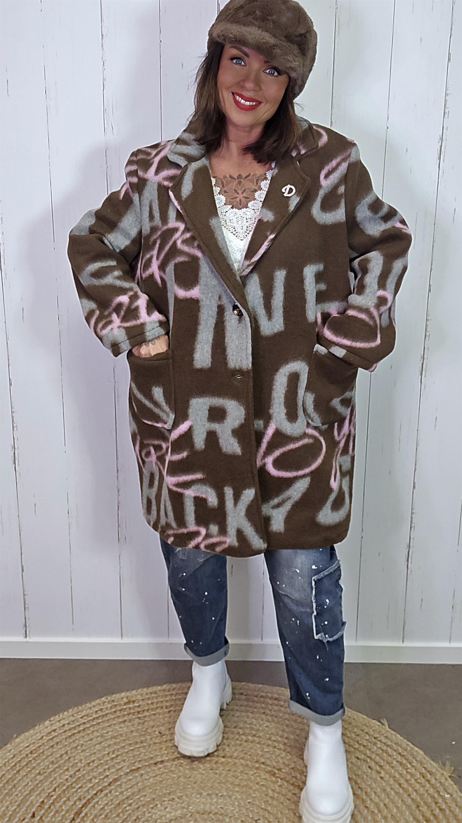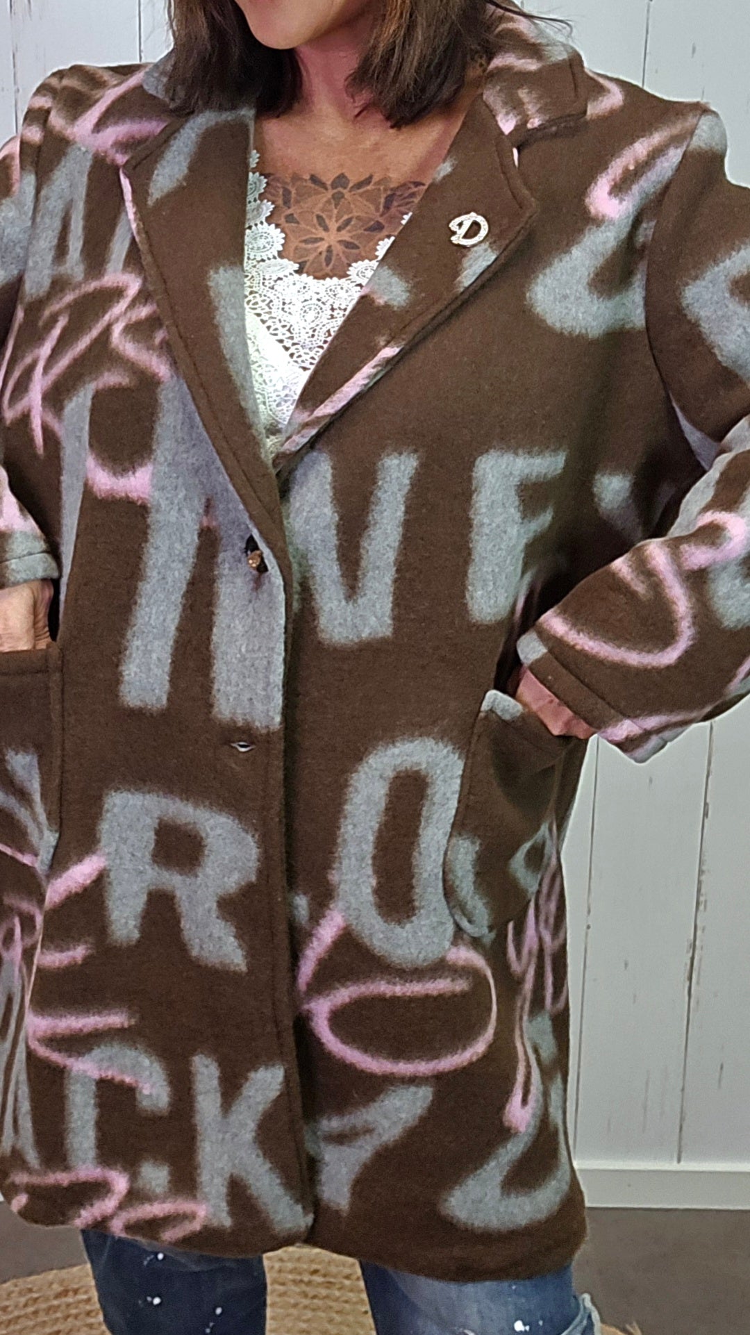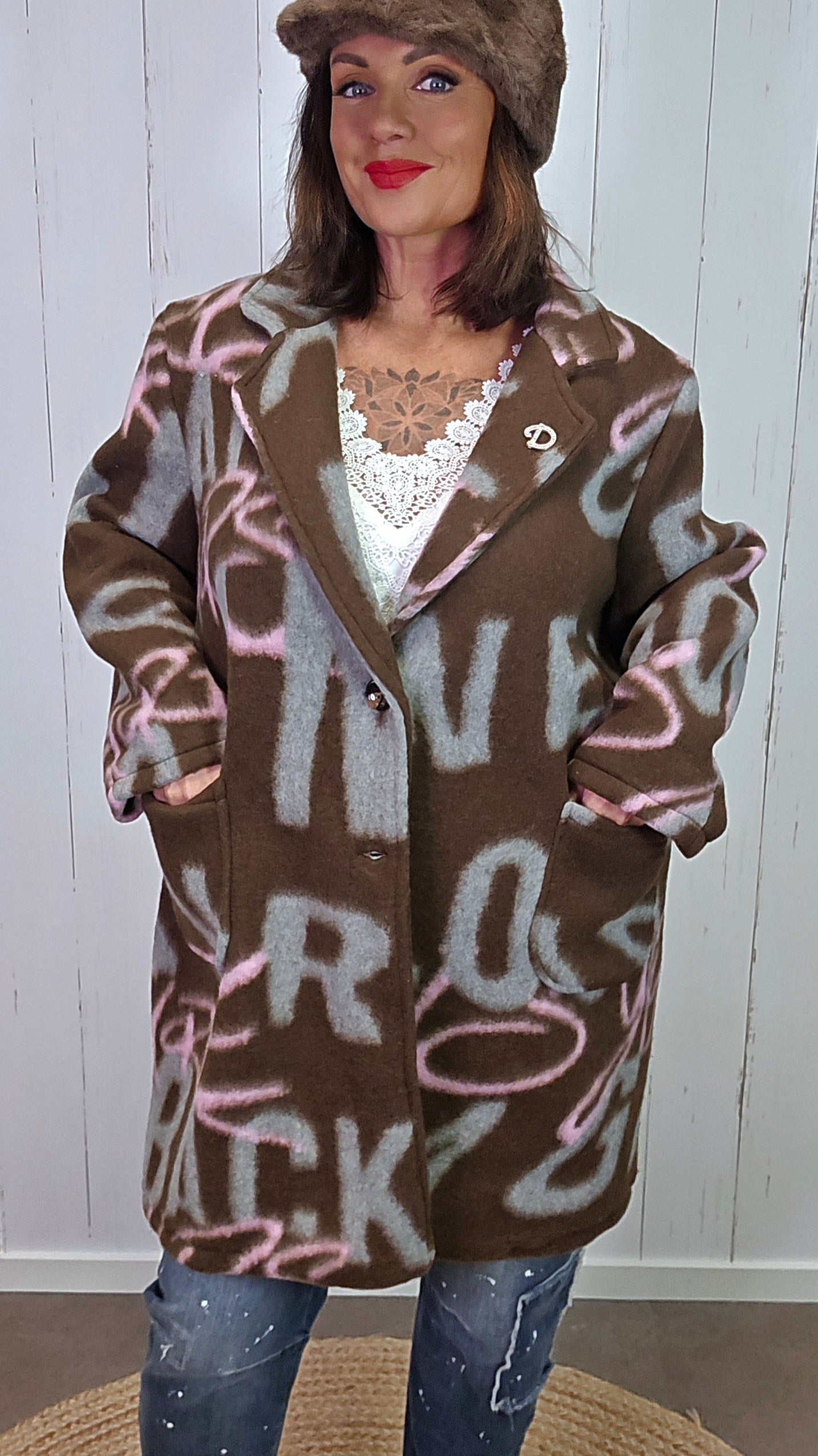 En kul og unik jakke i et filtaktig materiale med grafittiinspirert mønster og tekst i grått og rosa. Bunnfargen er brun, og jakken har knapper og lommer i front, samt fôr på innsiden for ekstra komfort. Kragen har et klassisk snitt som minner om en blazerkrage, og som en ekstra detalj følger det med en liten brosje – bokstaven D med glitrende bling.