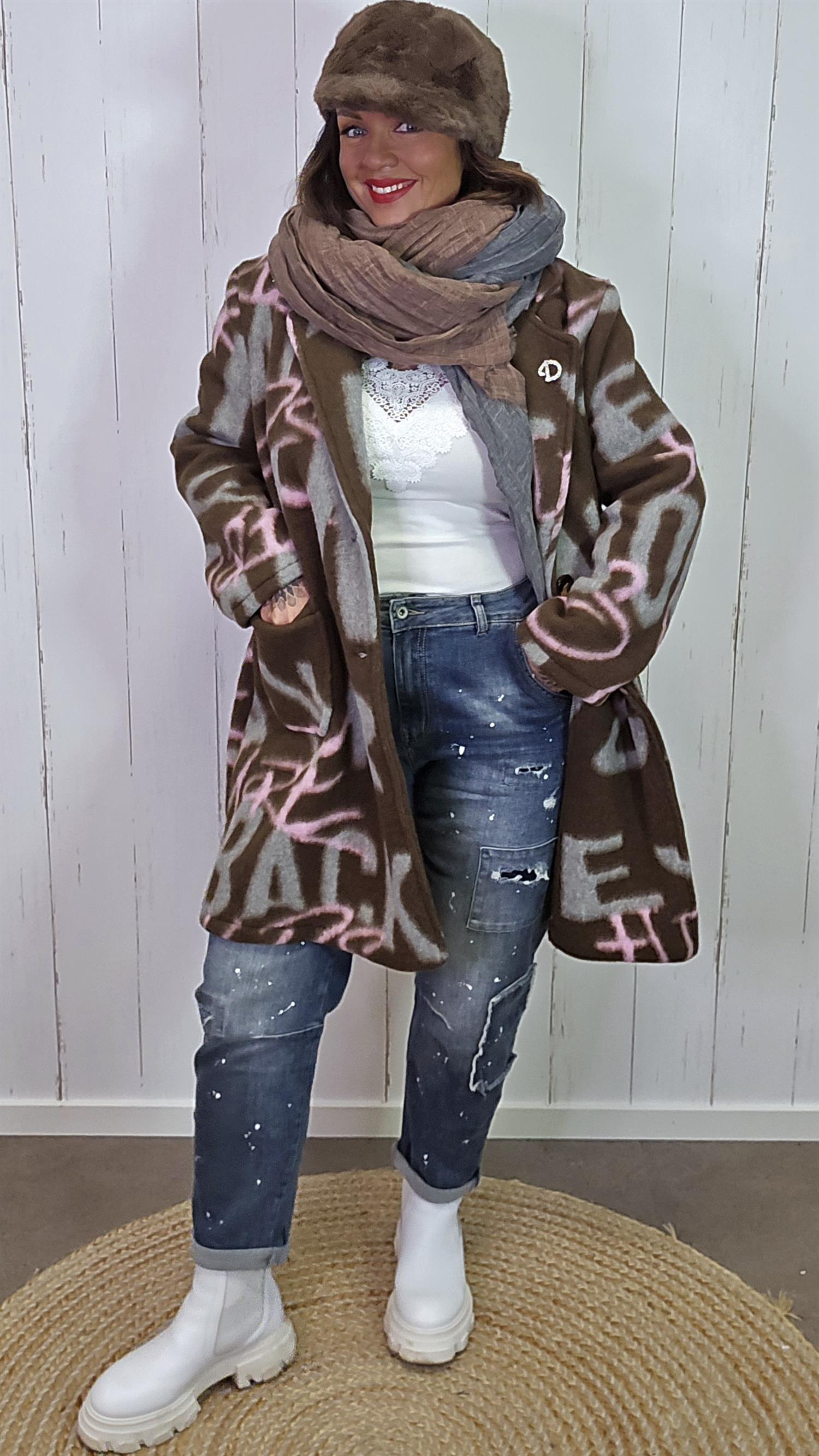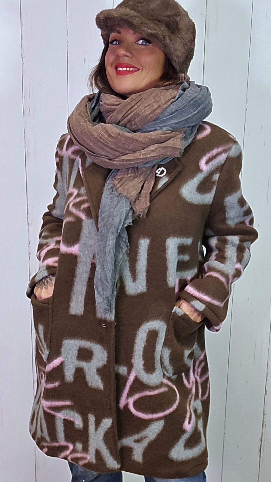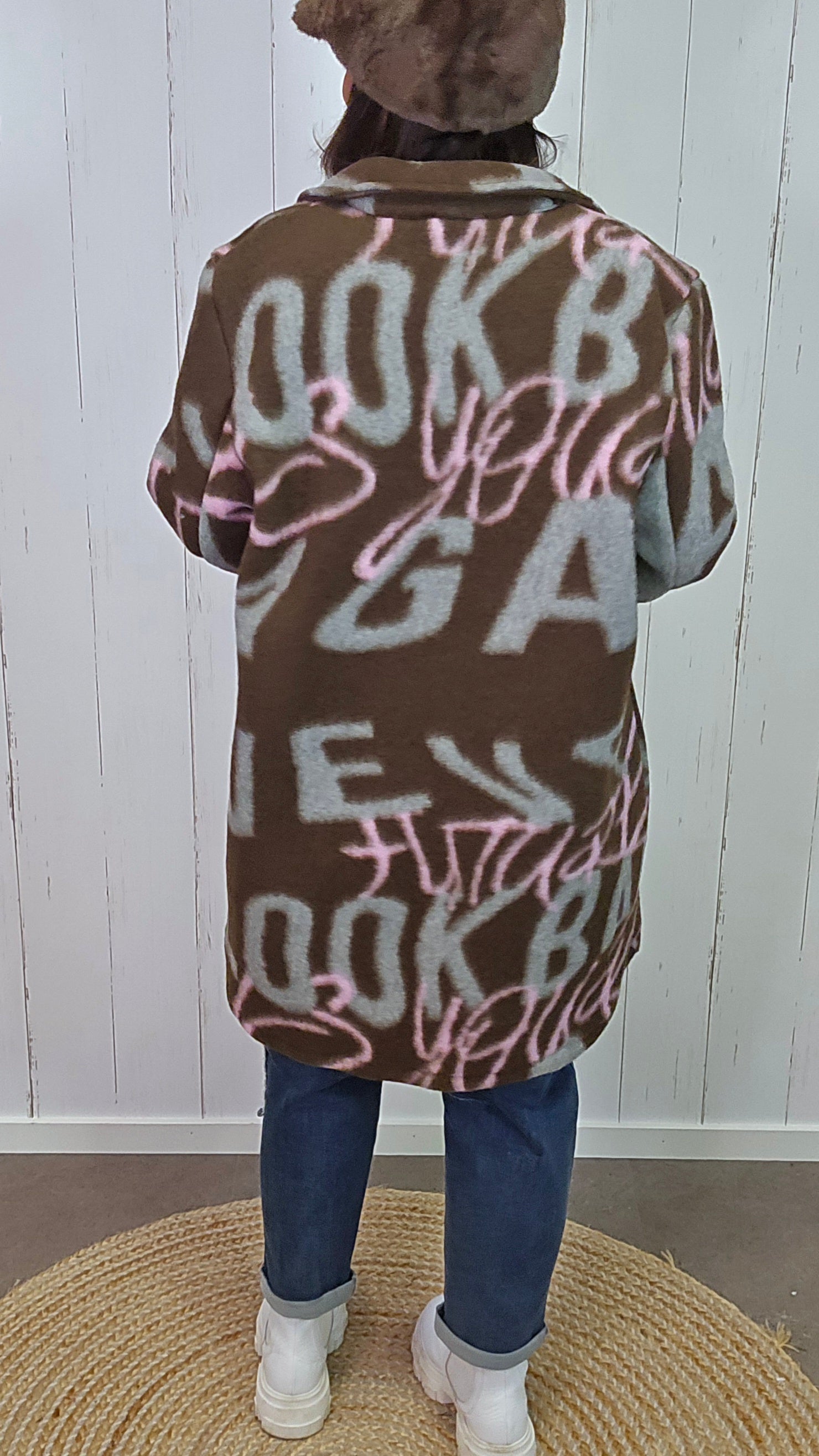 En kul og unik jakke i et filtaktig materiale med grafittiinspirert mønster og tekst i grått og rosa. Bunnfargen er brun, og jakken har knapper og lommer i front, samt fôr på innsiden for ekstra komfort. Kragen har et klassisk snitt som minner om en blazerkrage, og som en ekstra detalj følger det med en liten brosje – bokstaven D med glitrende bling.