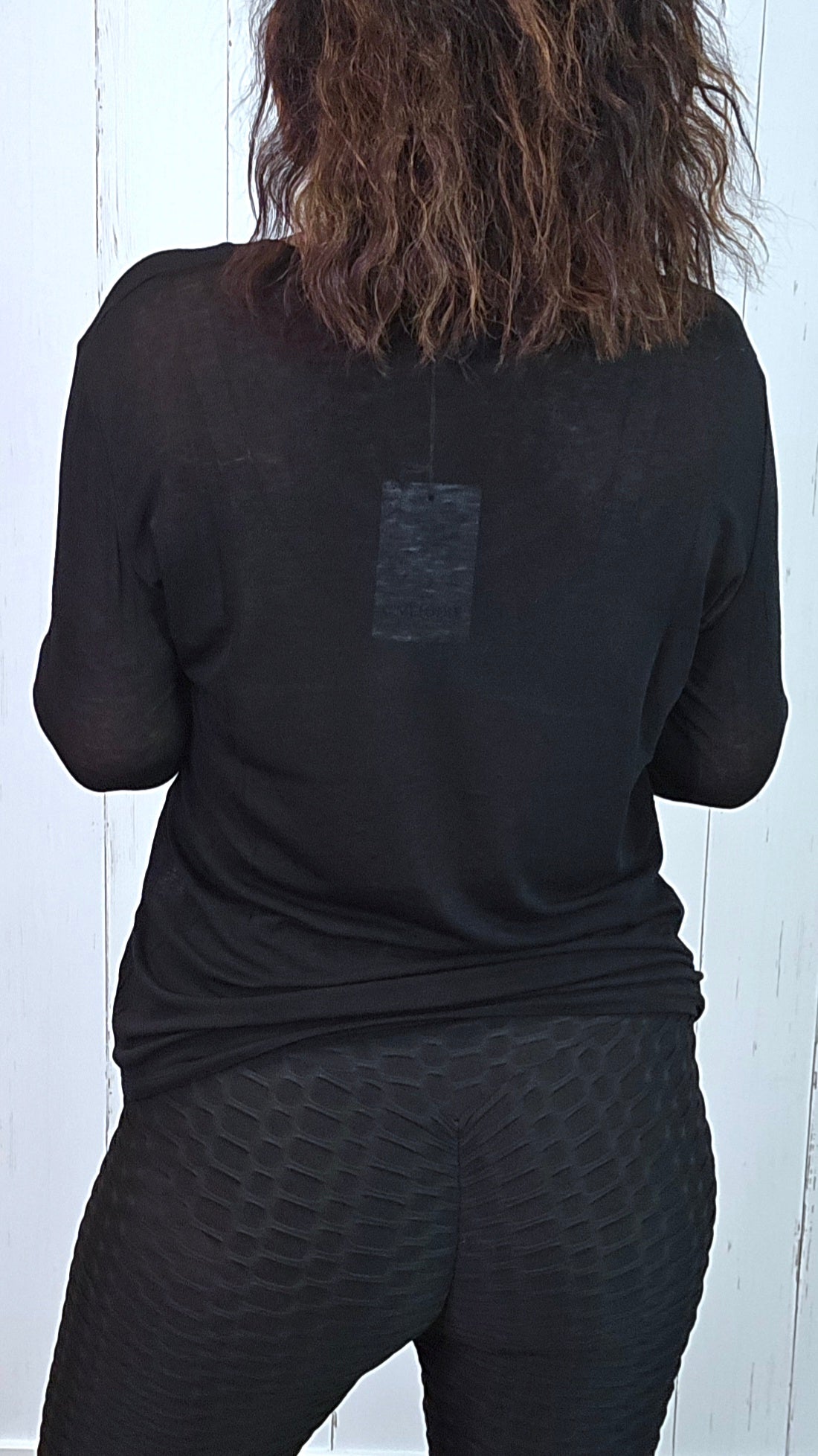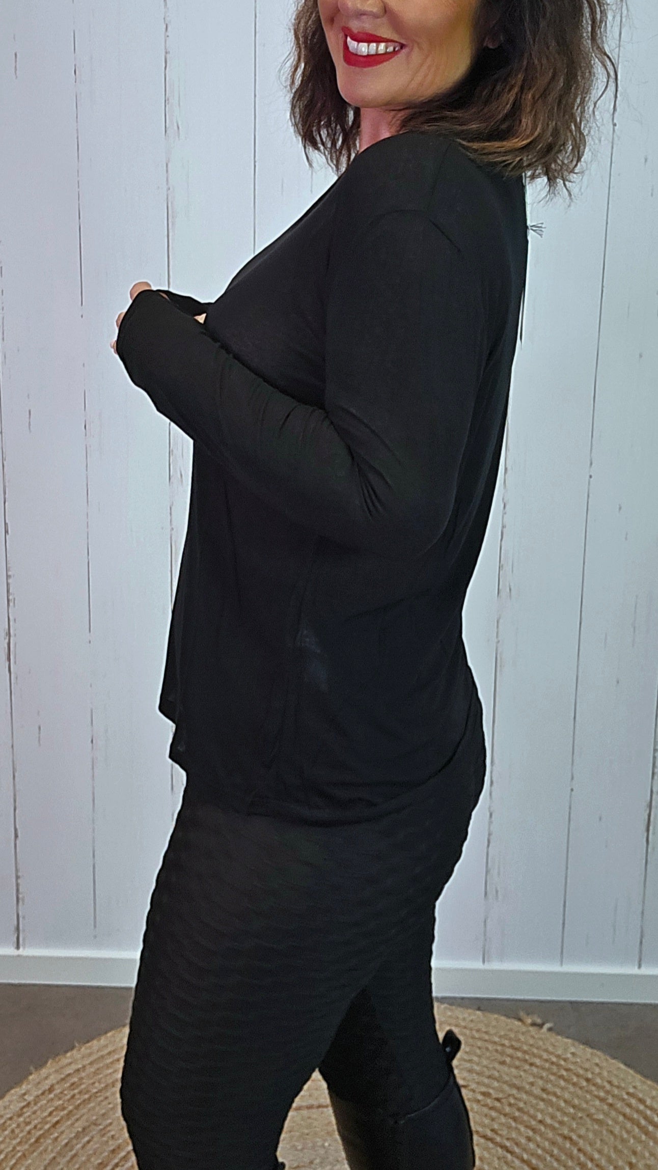 En deilig tynn og myk basic topp i luksuriøs kvalitet med dyp v-hals og lange ermer. Modellen har en flatterende passform, stretchy materiale og er utrolig behagelig å ha på. En tidløs garderobe favoritt som passer perfekt både til hverdags og under blazer eller strikke genser.