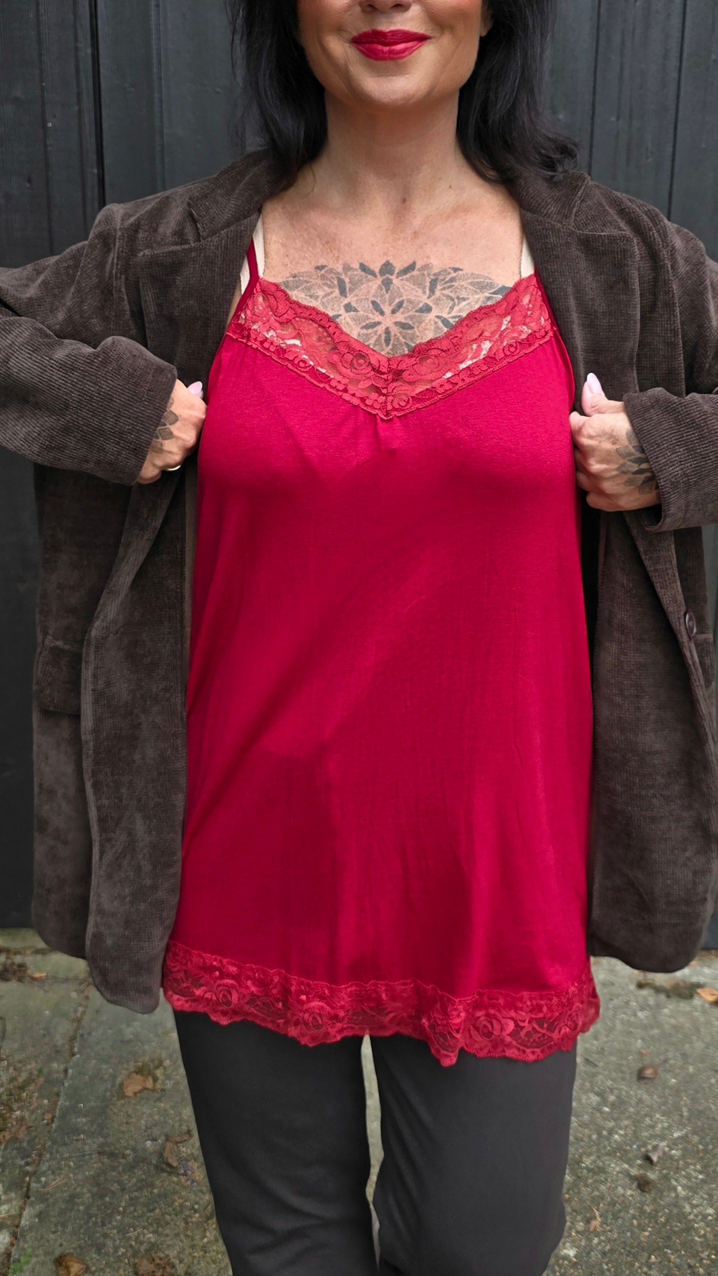 Singlet med blonder uppe och nere. Strikk bak I ryggen. Otroligt skön på. Fin att ha under jackor eller genser då det är fin längde på den.