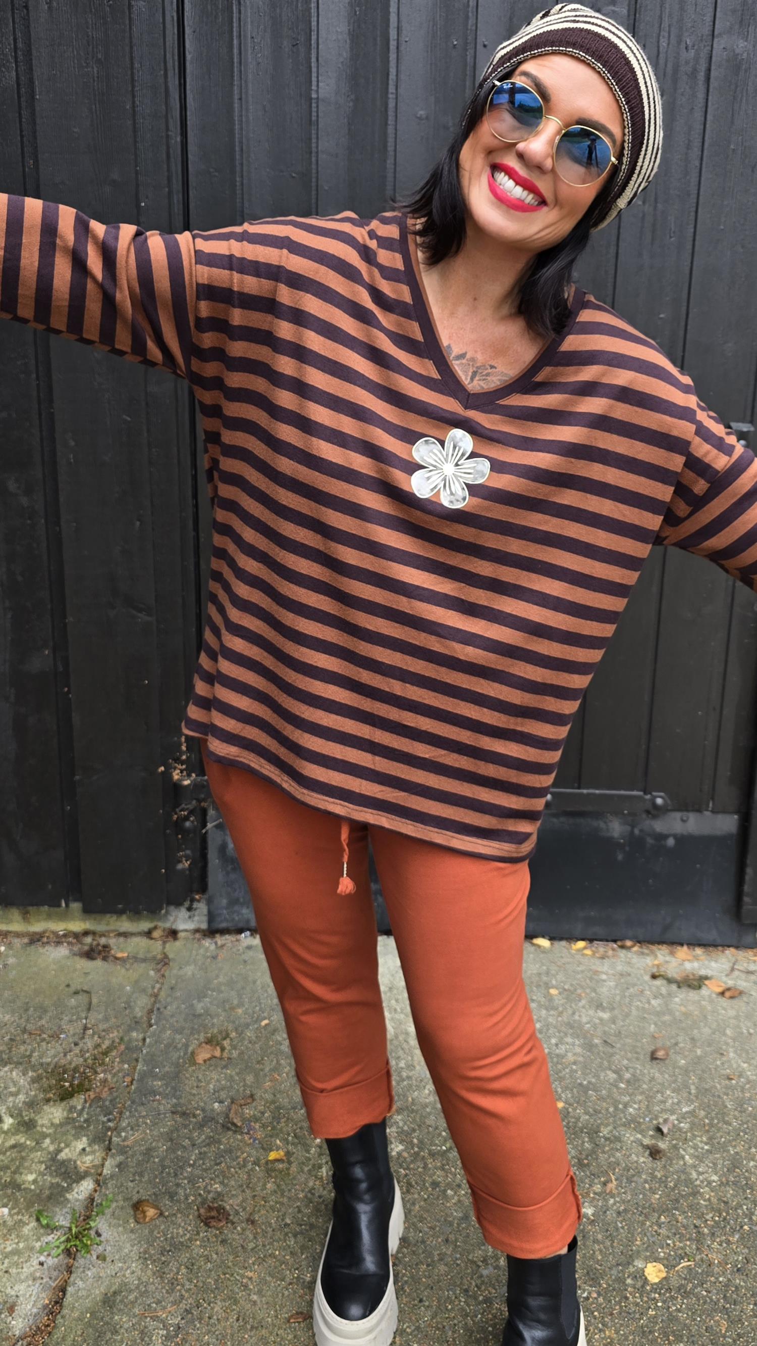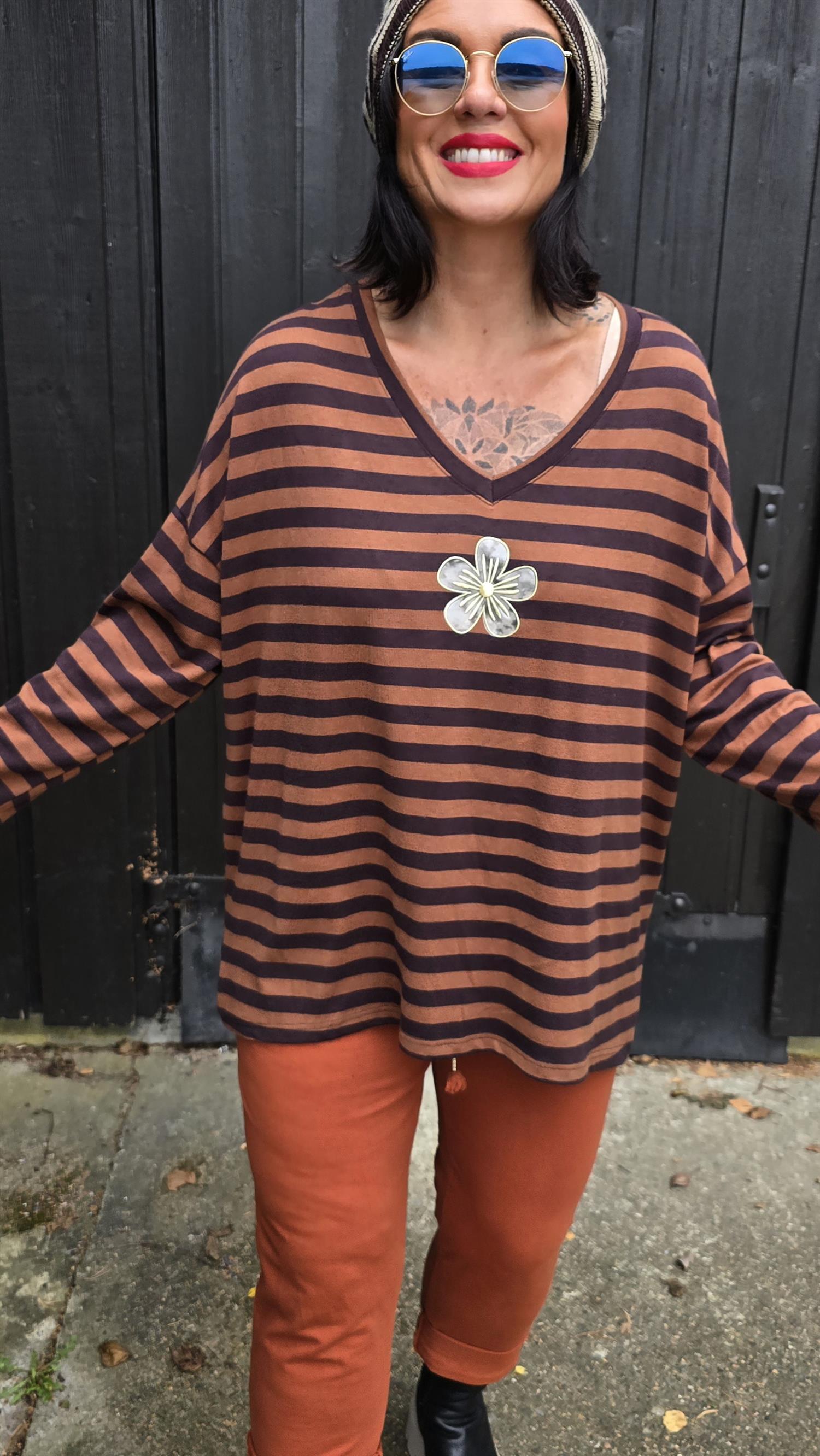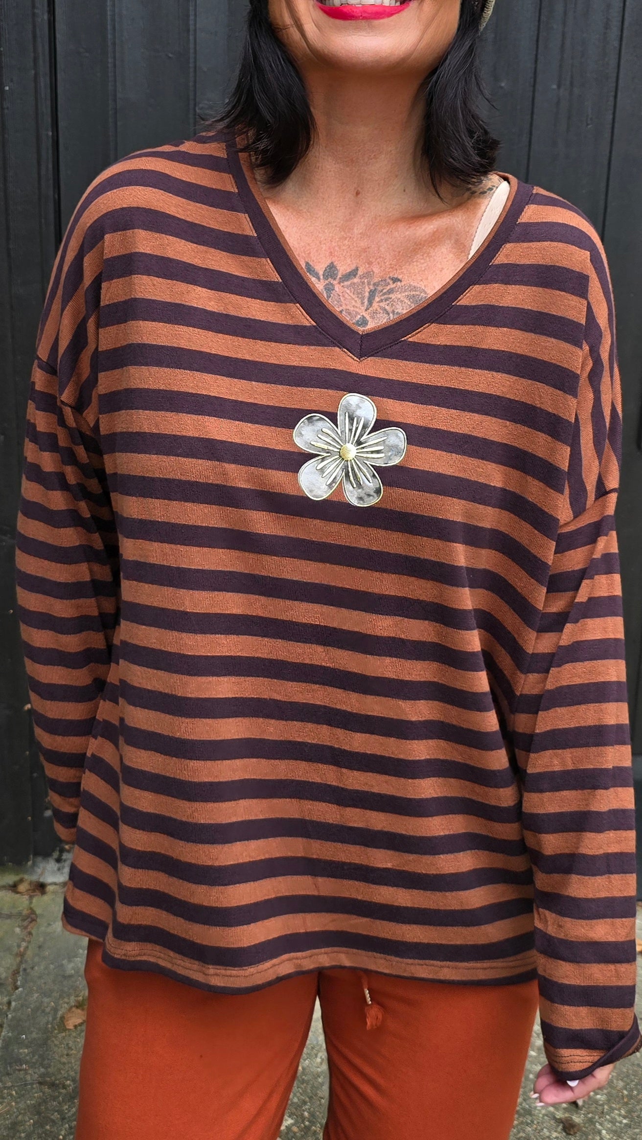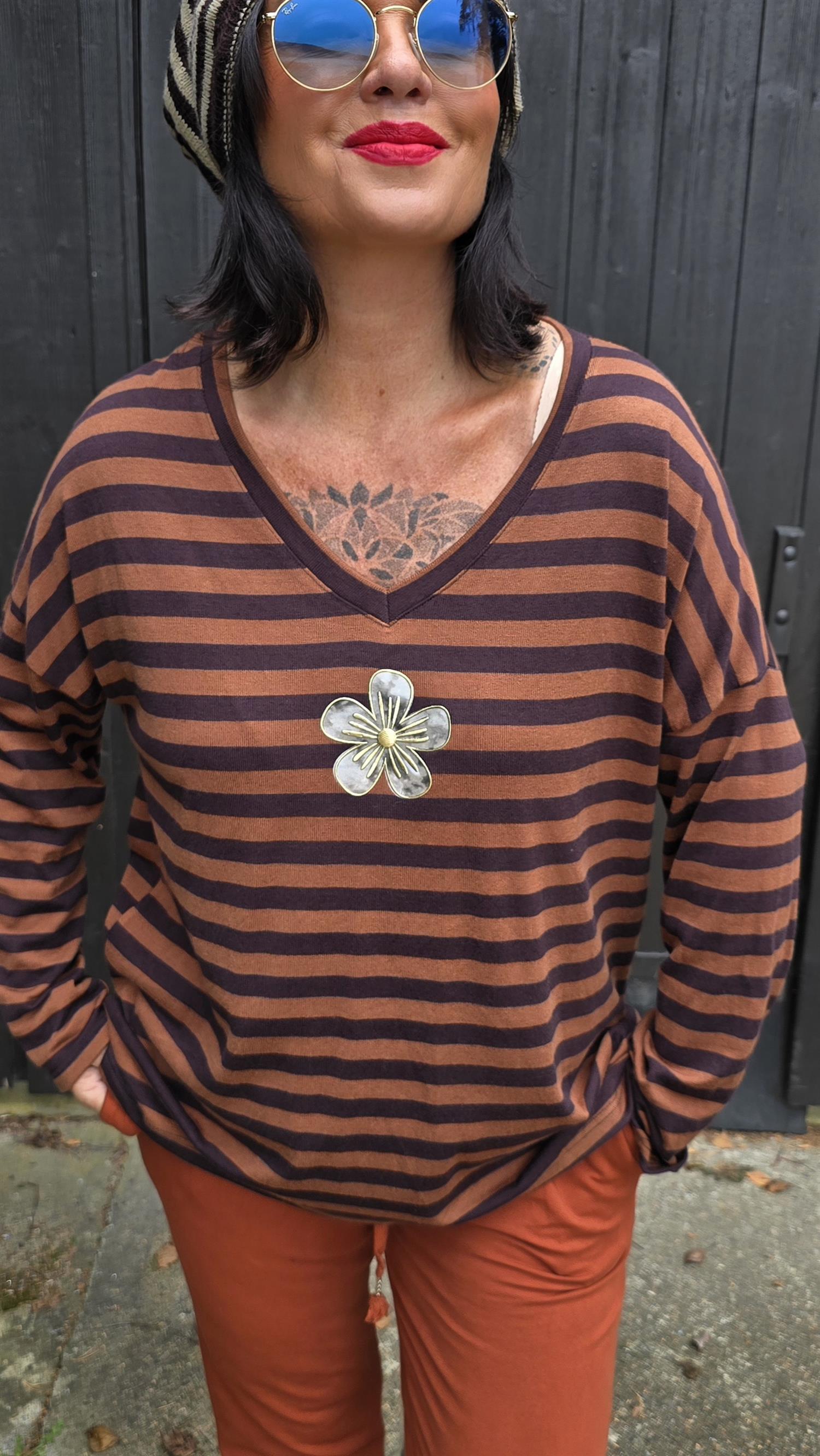 Topp med striper I brunt. Den harcen fin blomma I front. V-hals. Mjuk å skön på med stretchig kvalitet. Långa armar.