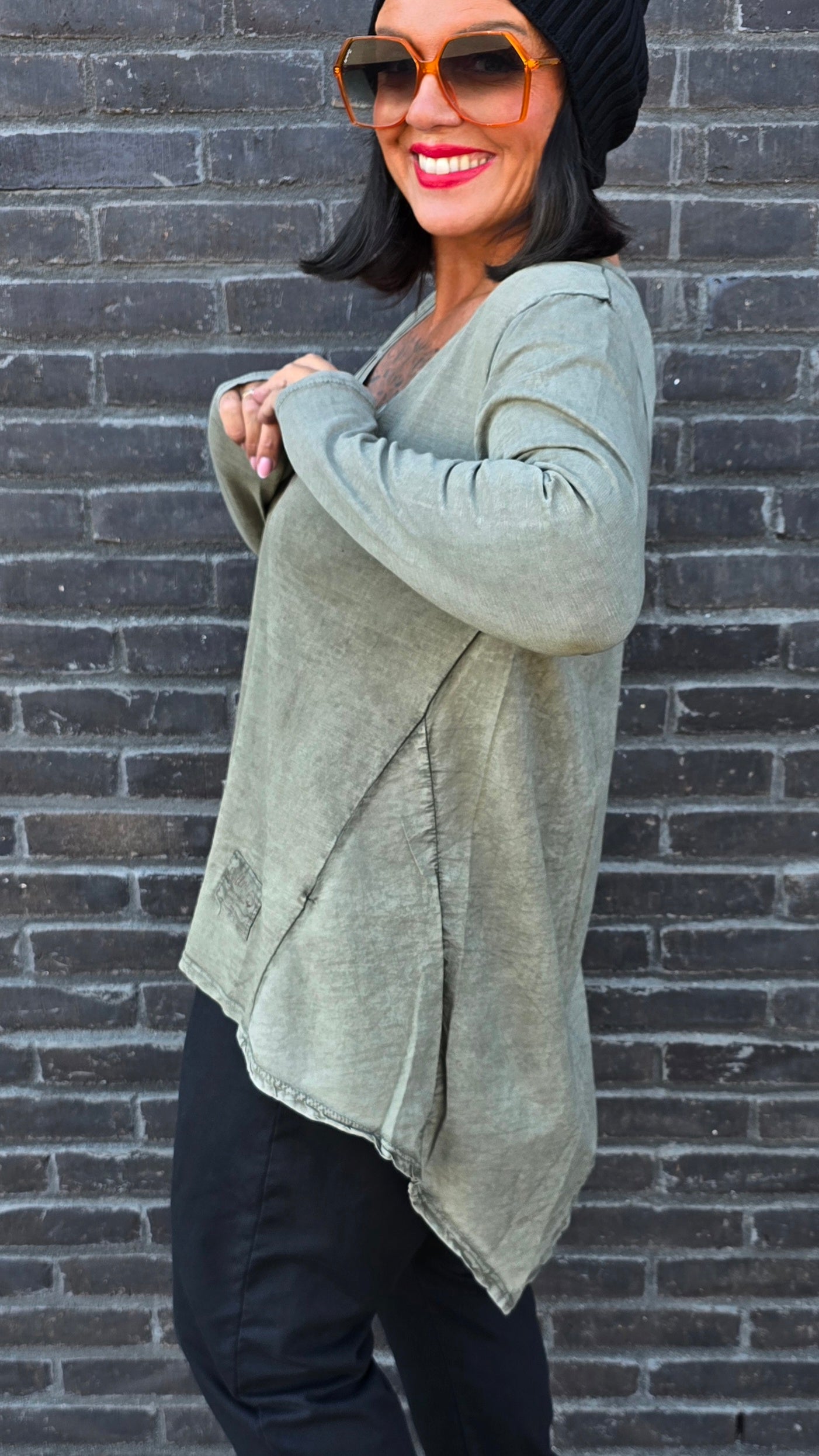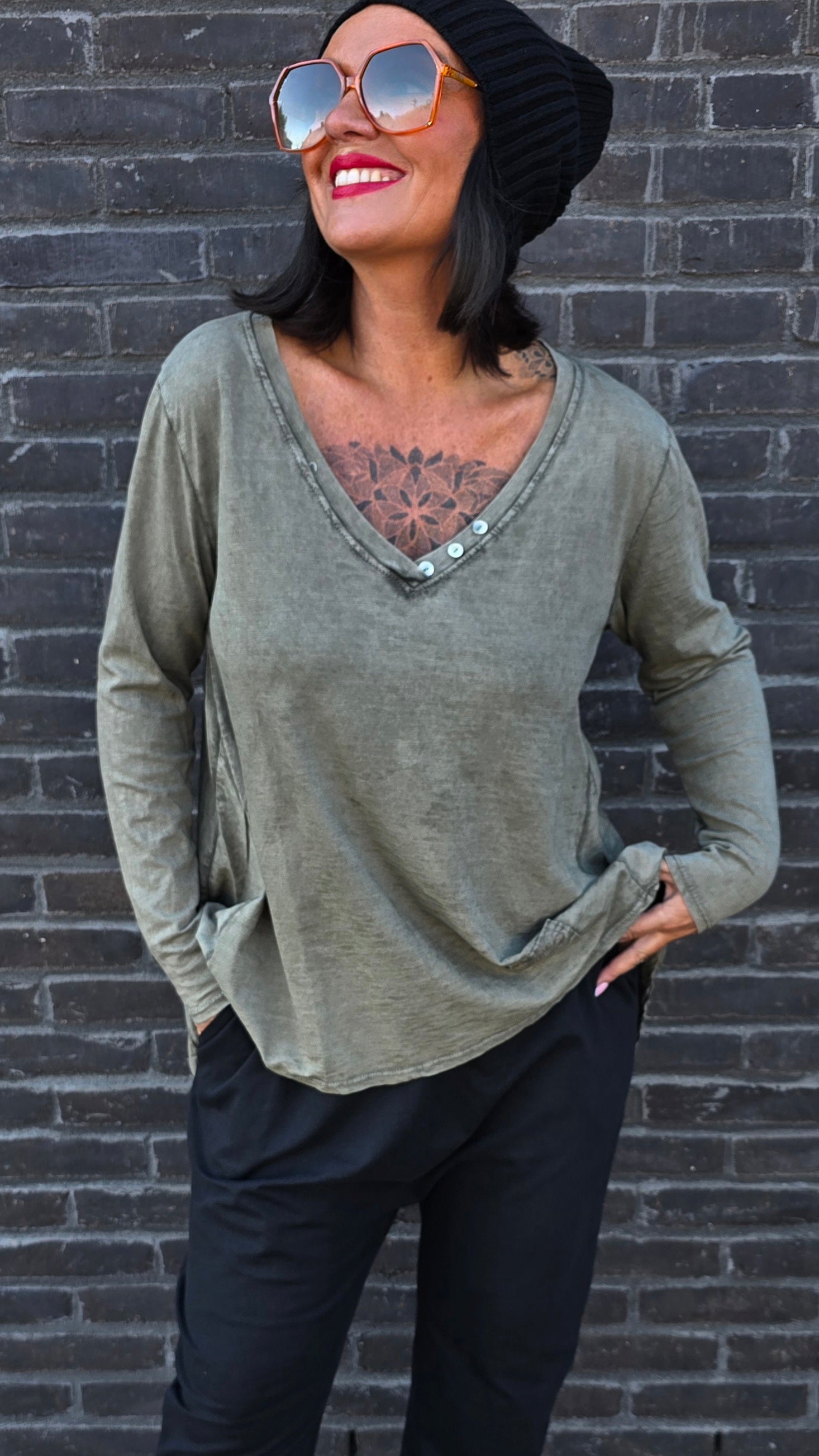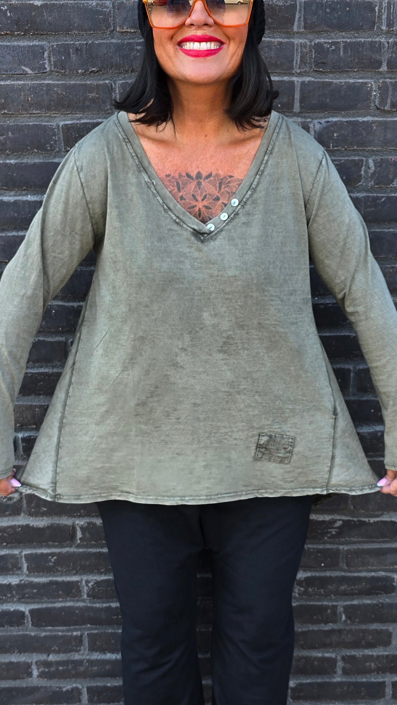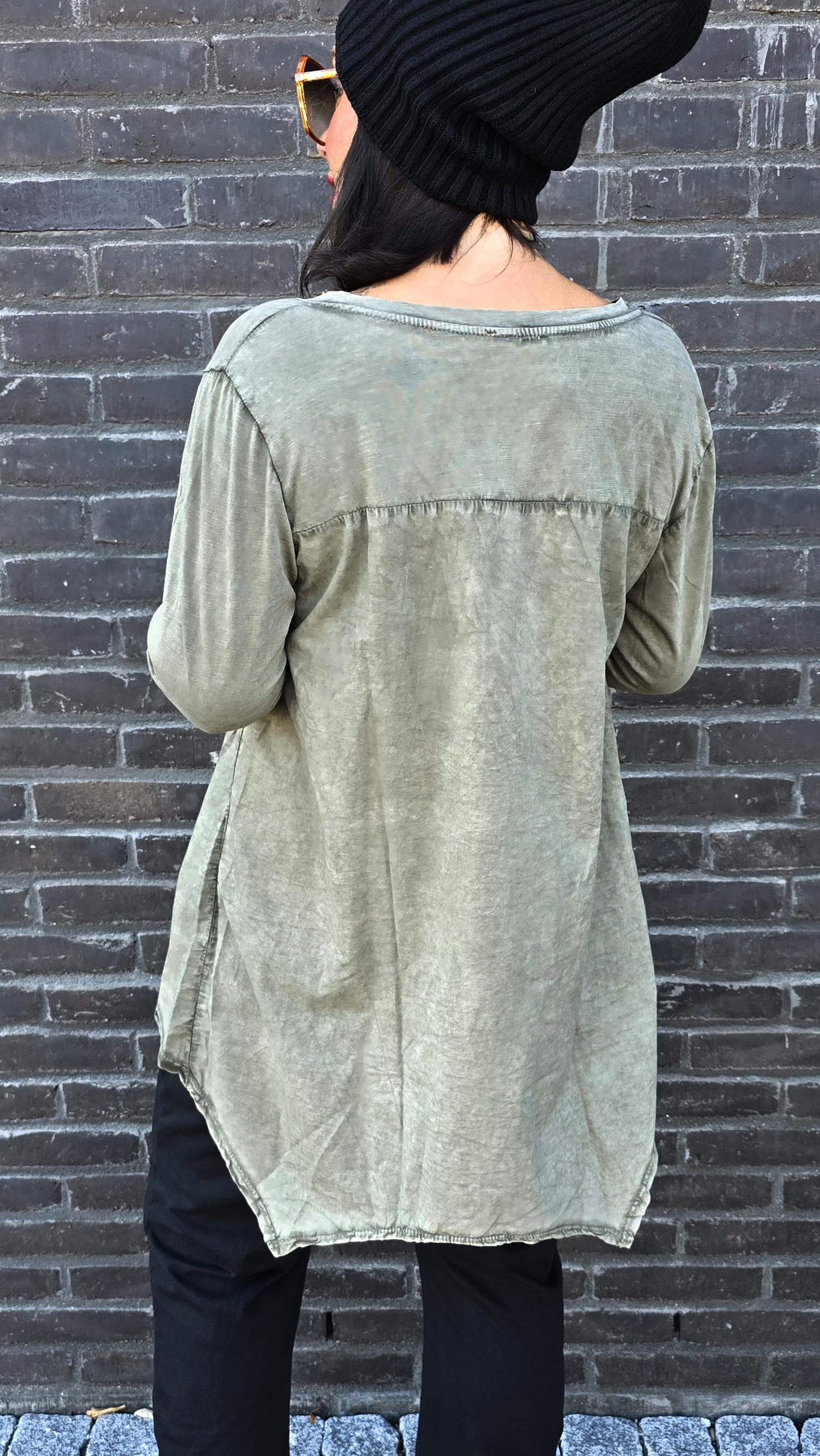 Topp med fina detaljer. Läcker I ryggen. A-formad modell. Smalare över bysten. V-hals med knappar I halsen. Långa armar. Längre bak.