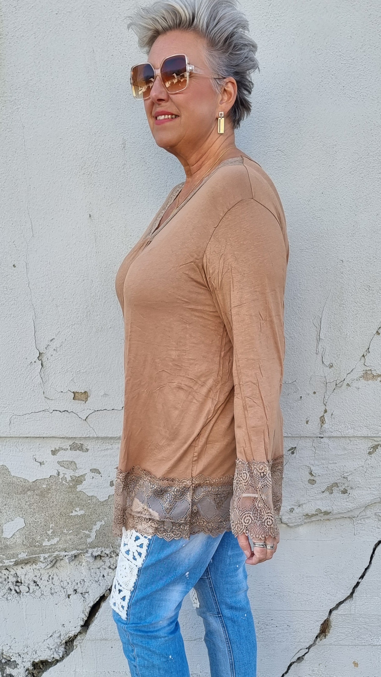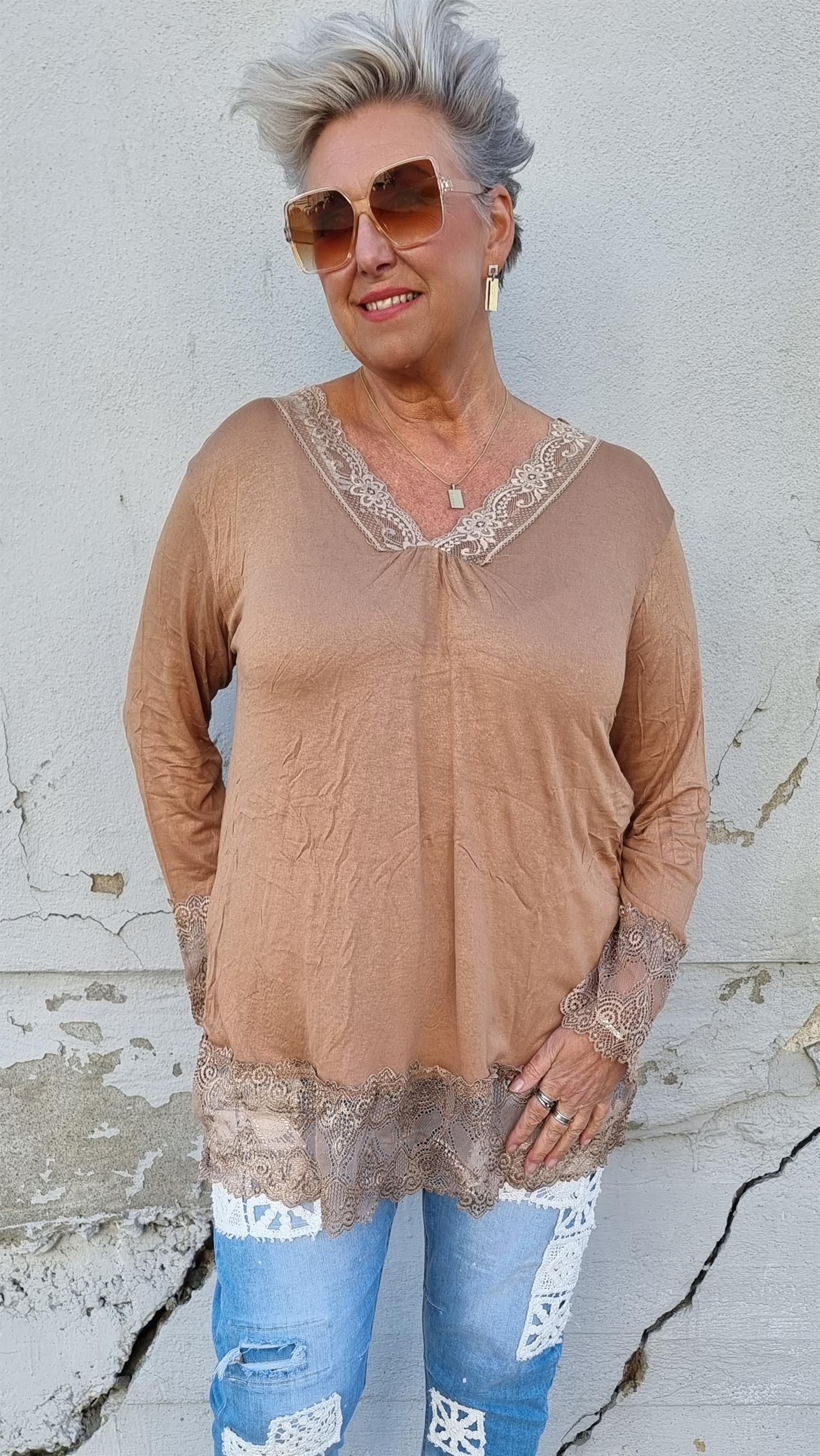 Tunn mjuk topp med blondedetaljer. Djup v-hals. Faller så fint på. Långa armar. Denna är perfekt att ha under stickade plagg. Fint med blonden nederst och nederst på armen.