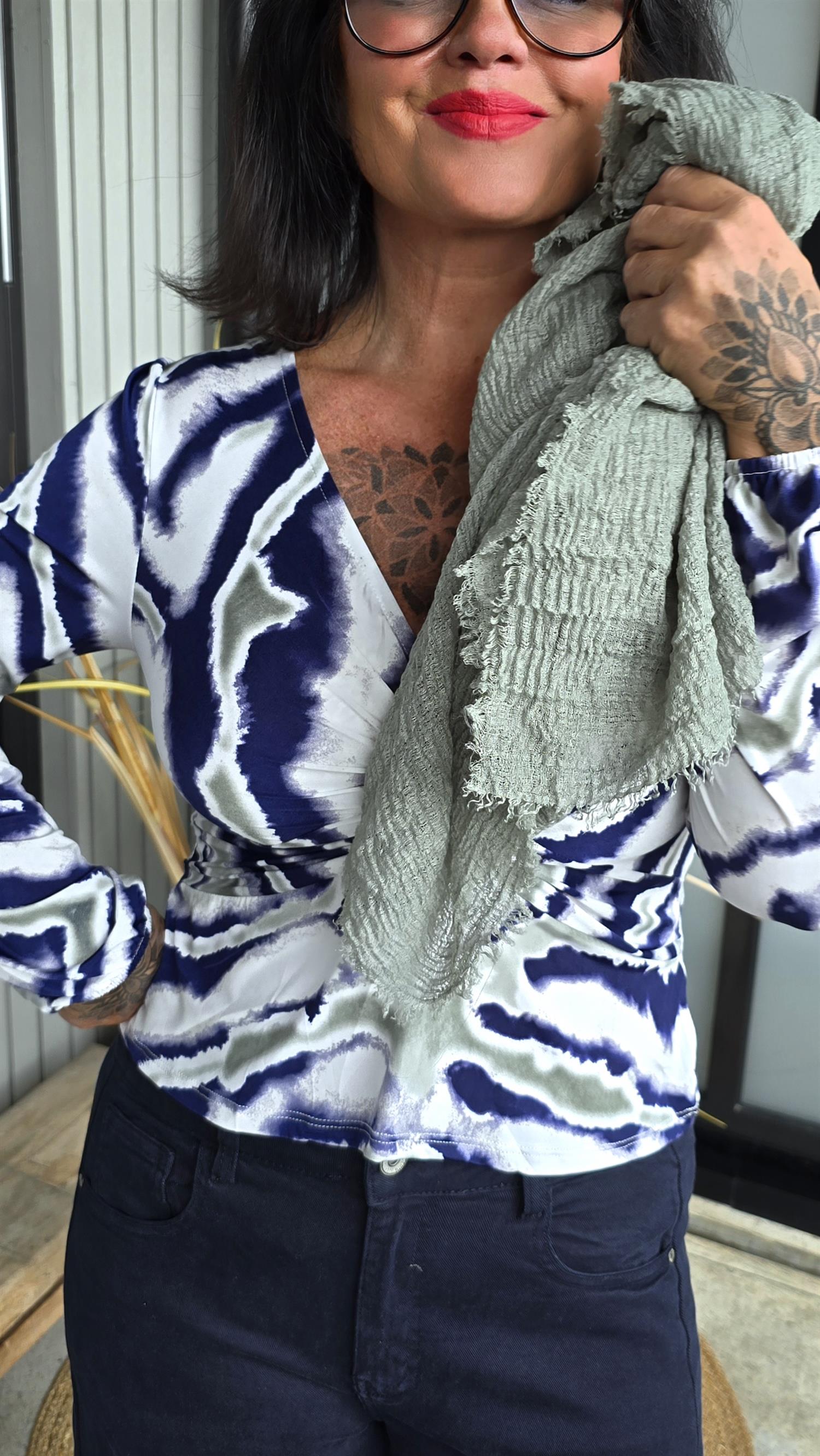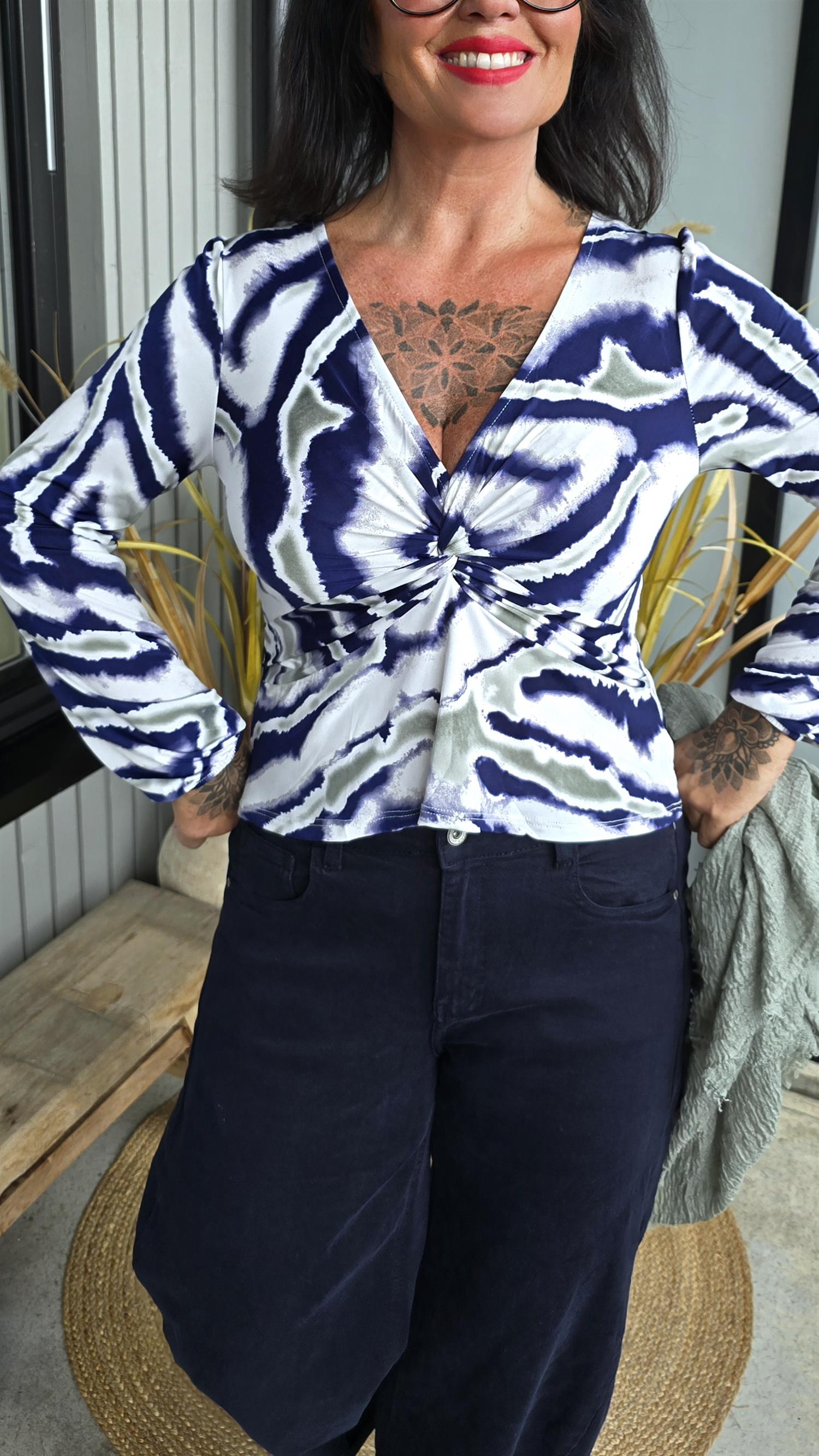 Stretchig topp med v-hals. Rynke detalj under bysten. Långa armar.