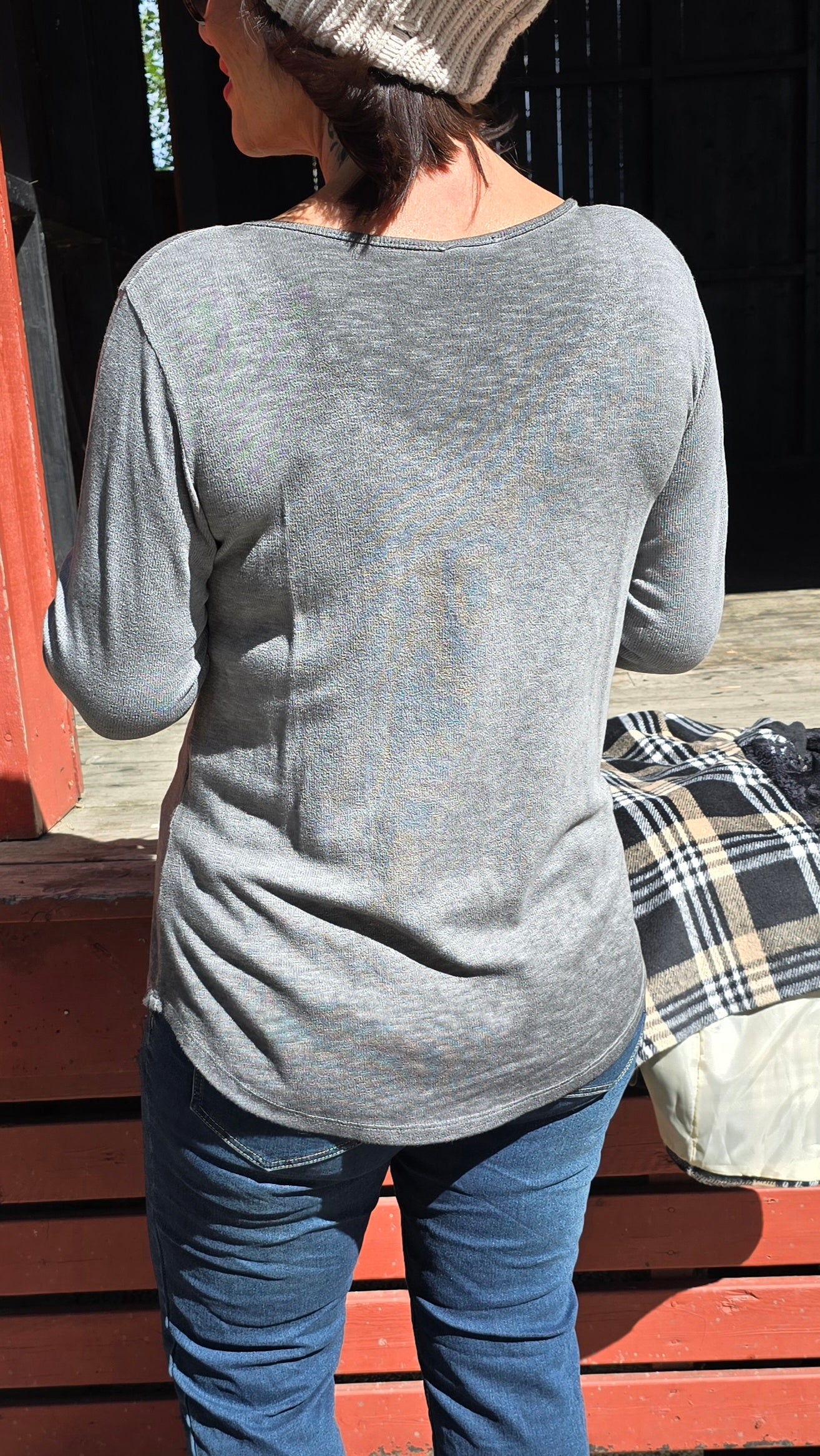 Ribbad tunn genser med guldtryck och stor blomma I front. Långa armar. Djup v-hals.