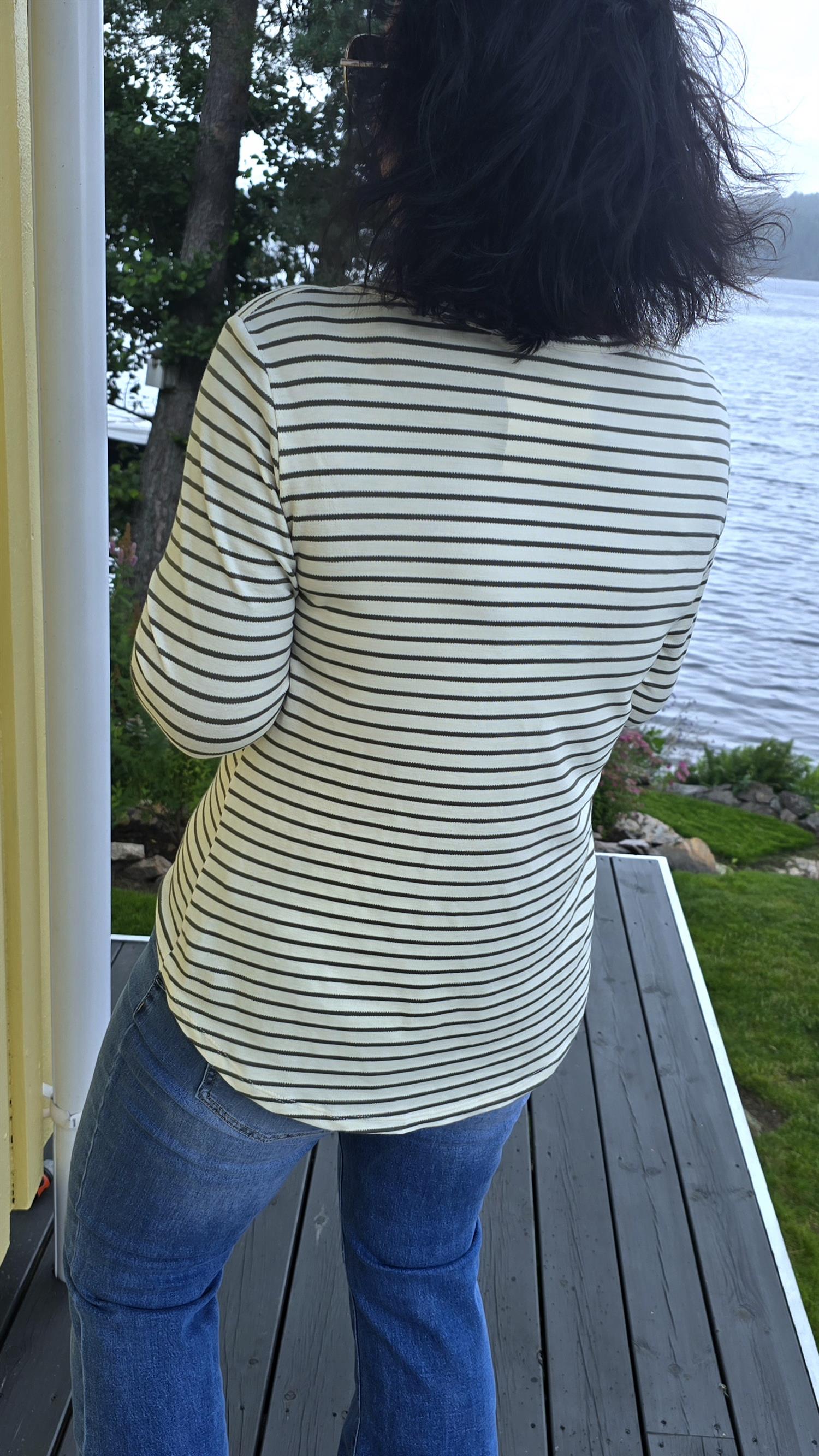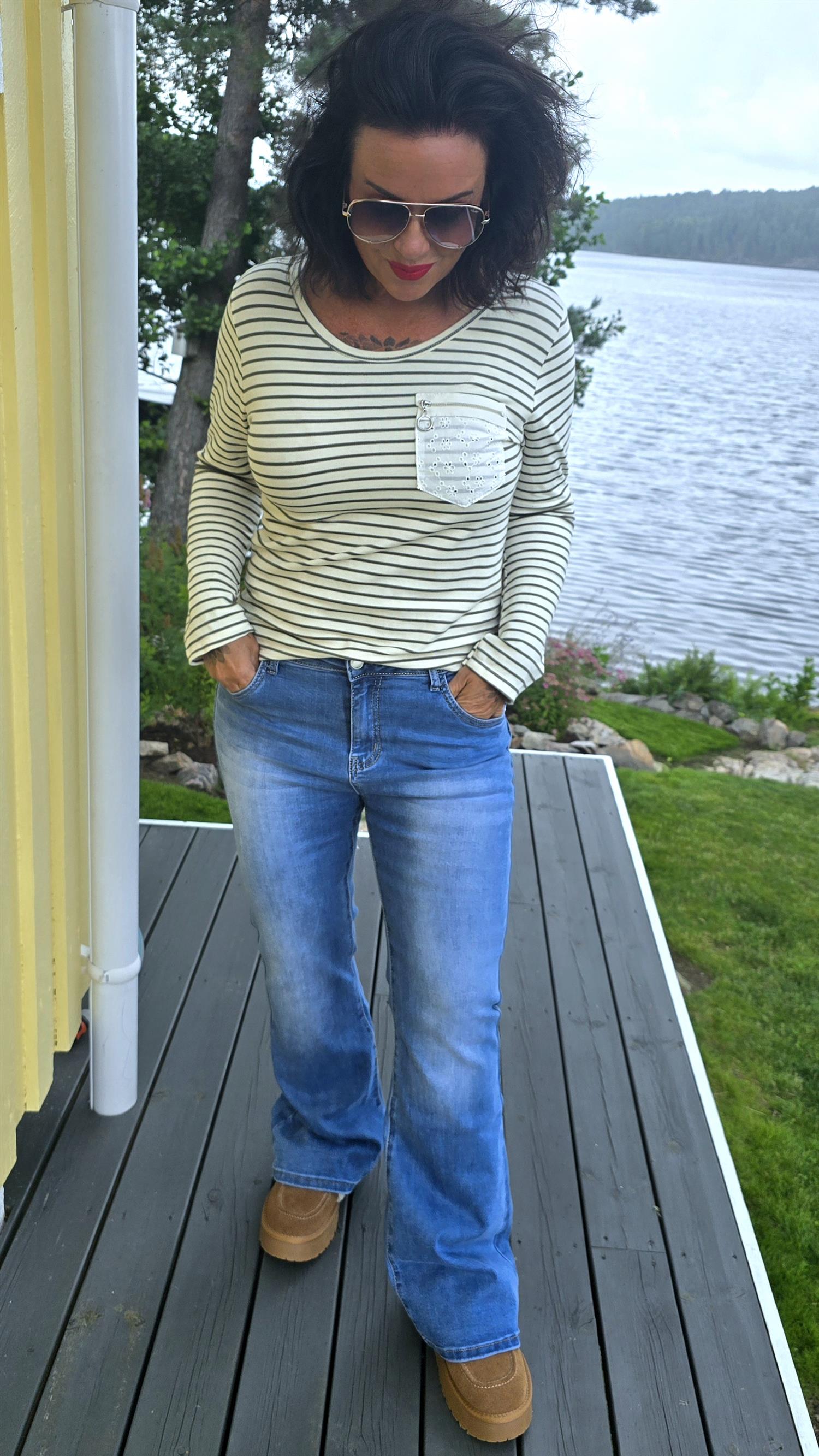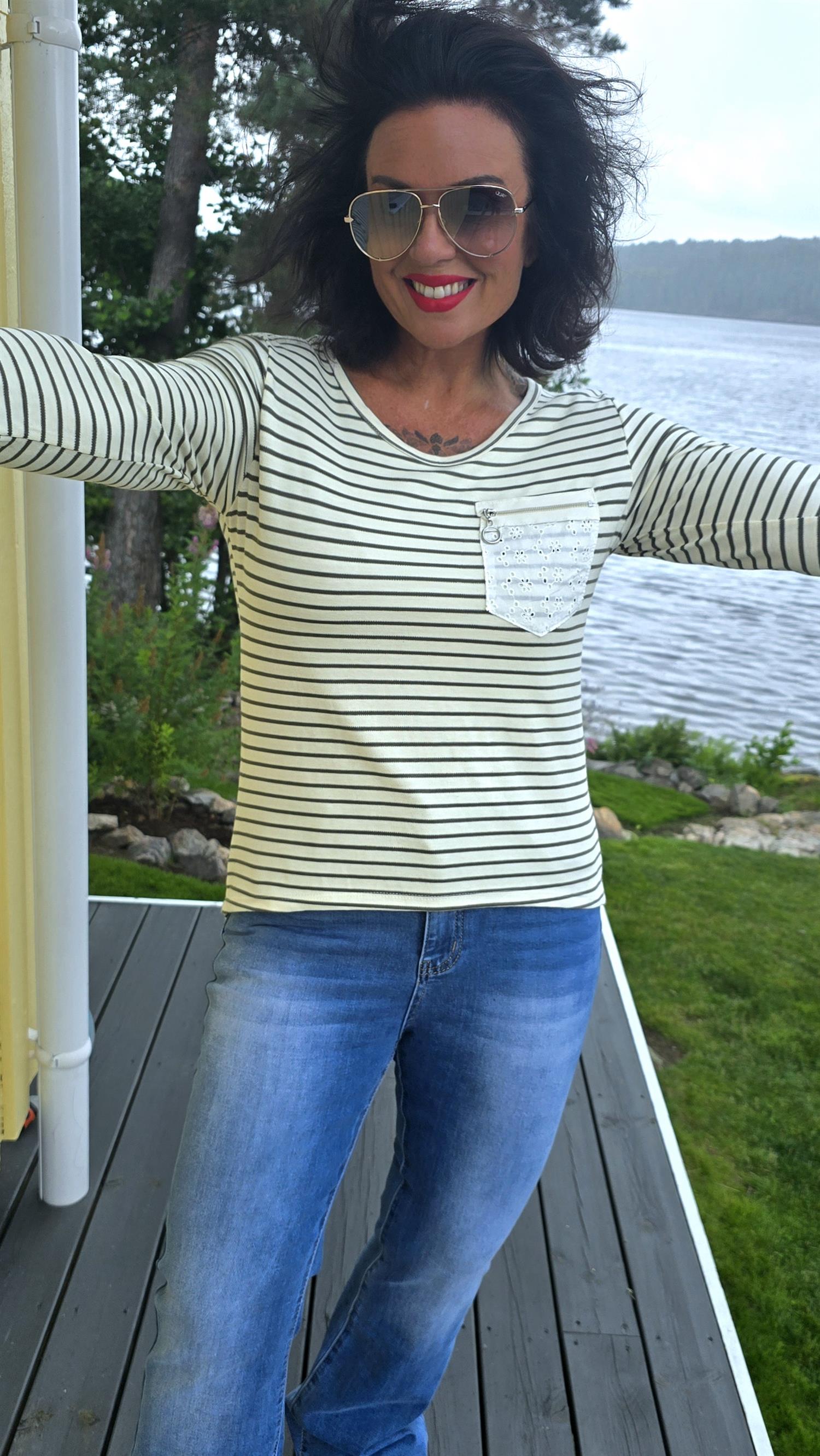 Fin skön basic topp med striper i kaki. Fin detalj med lomme I engelsk blonde Rund hals. Långa armar.
