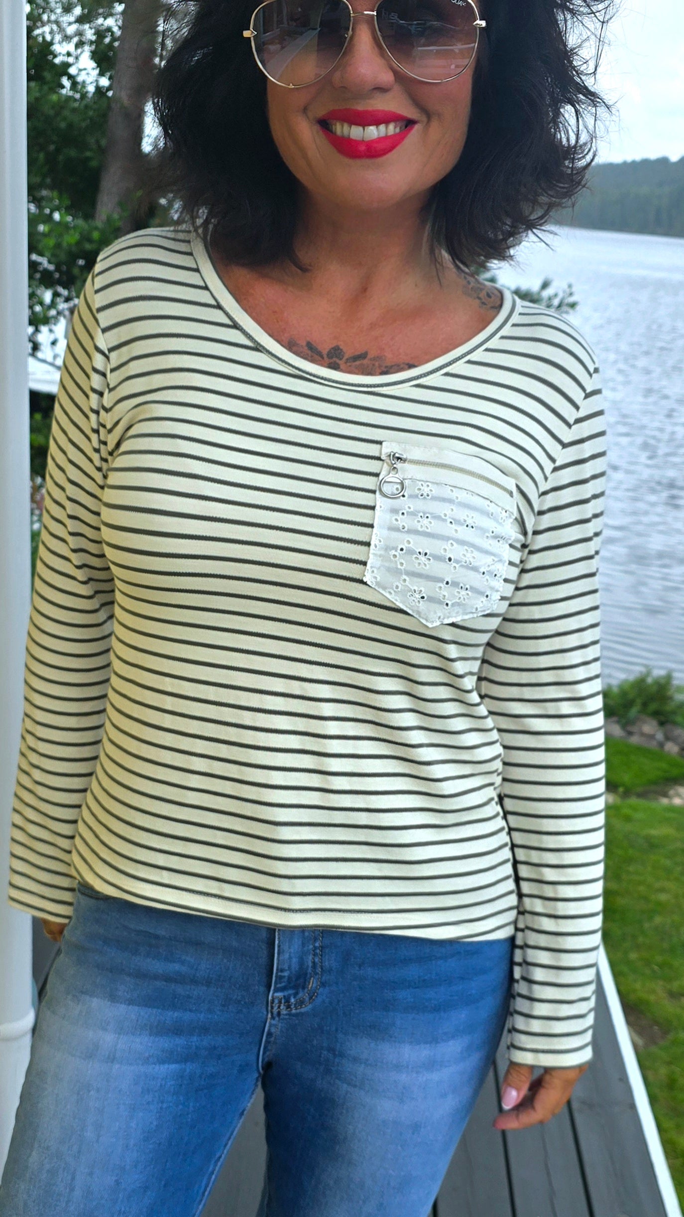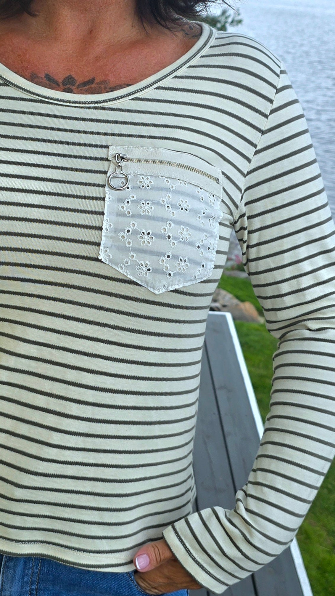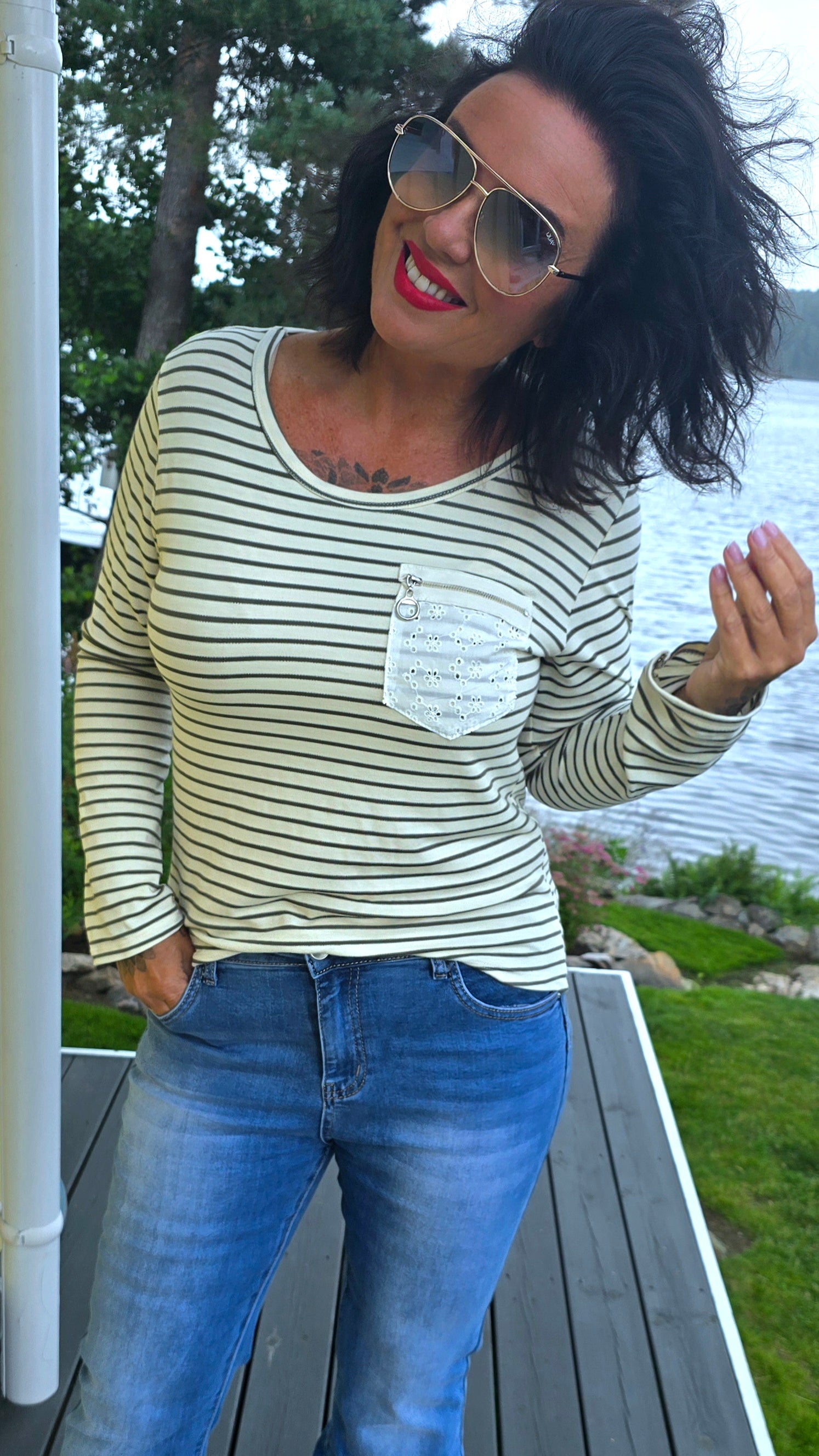 Fin skön basic topp med striper i kaki. Fin detalj med lomme I engelsk blonde Rund hals. Långa armar.