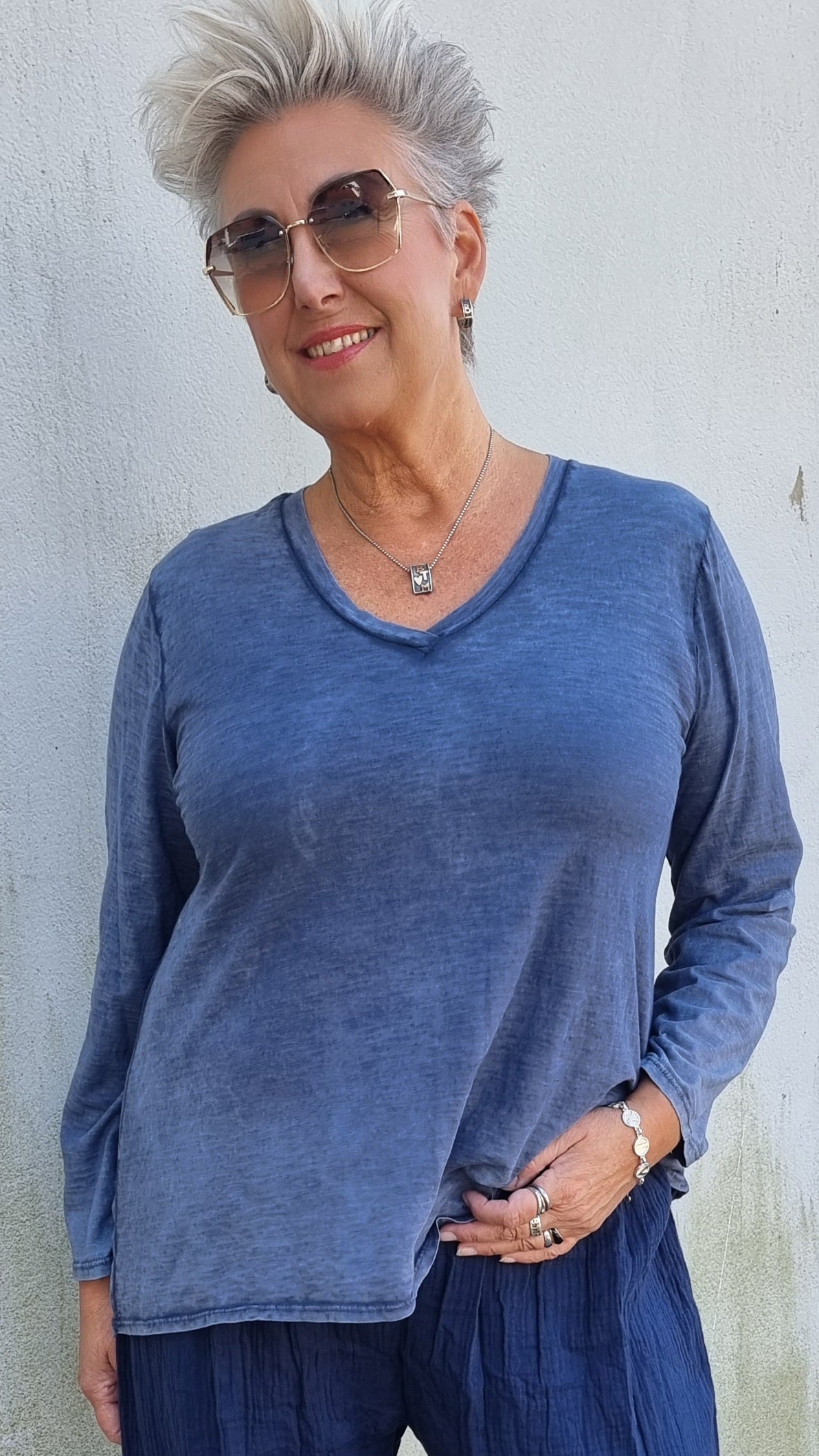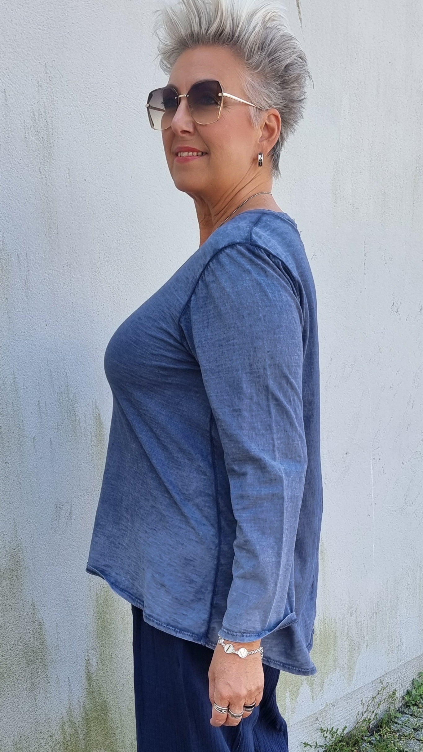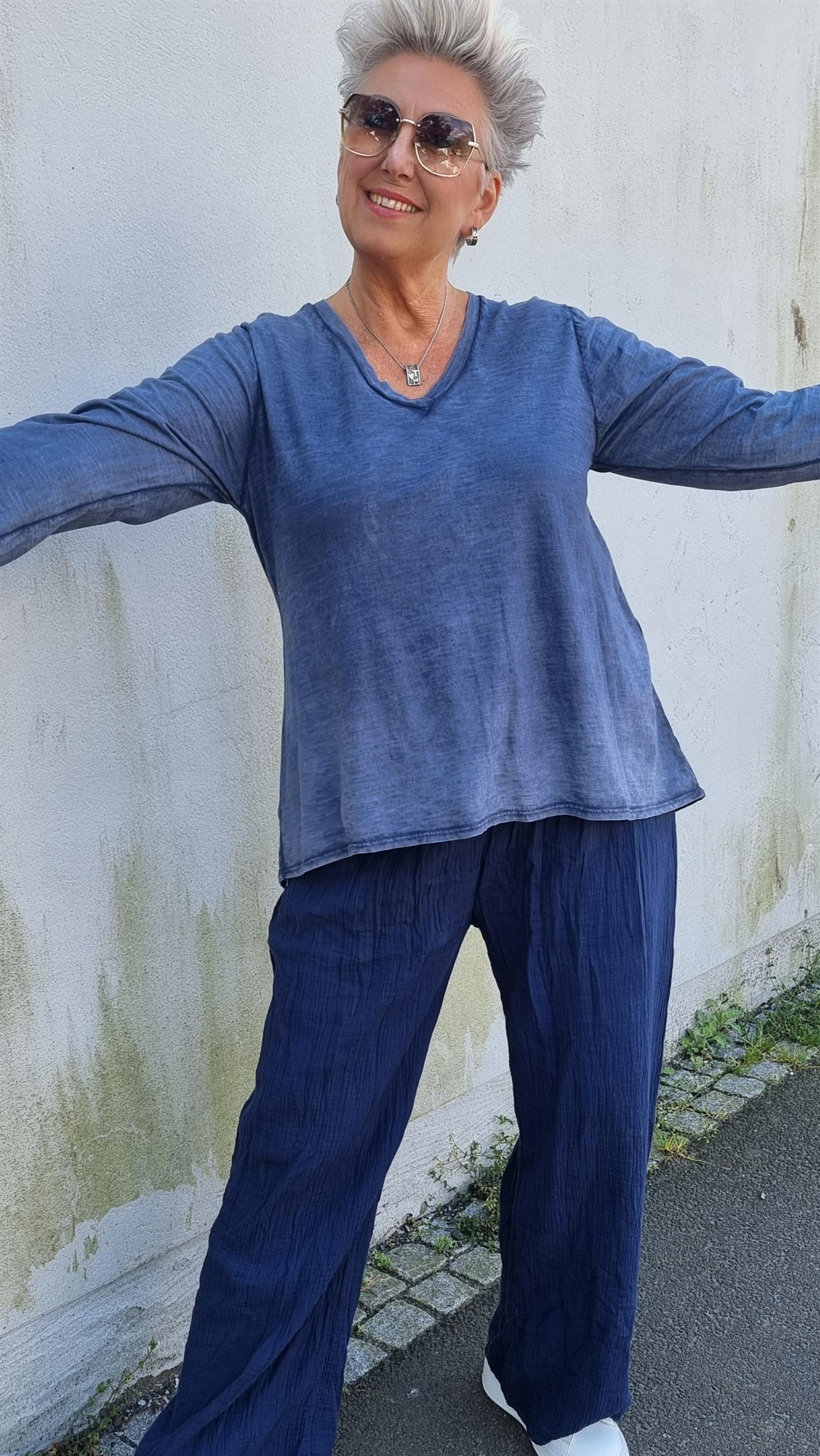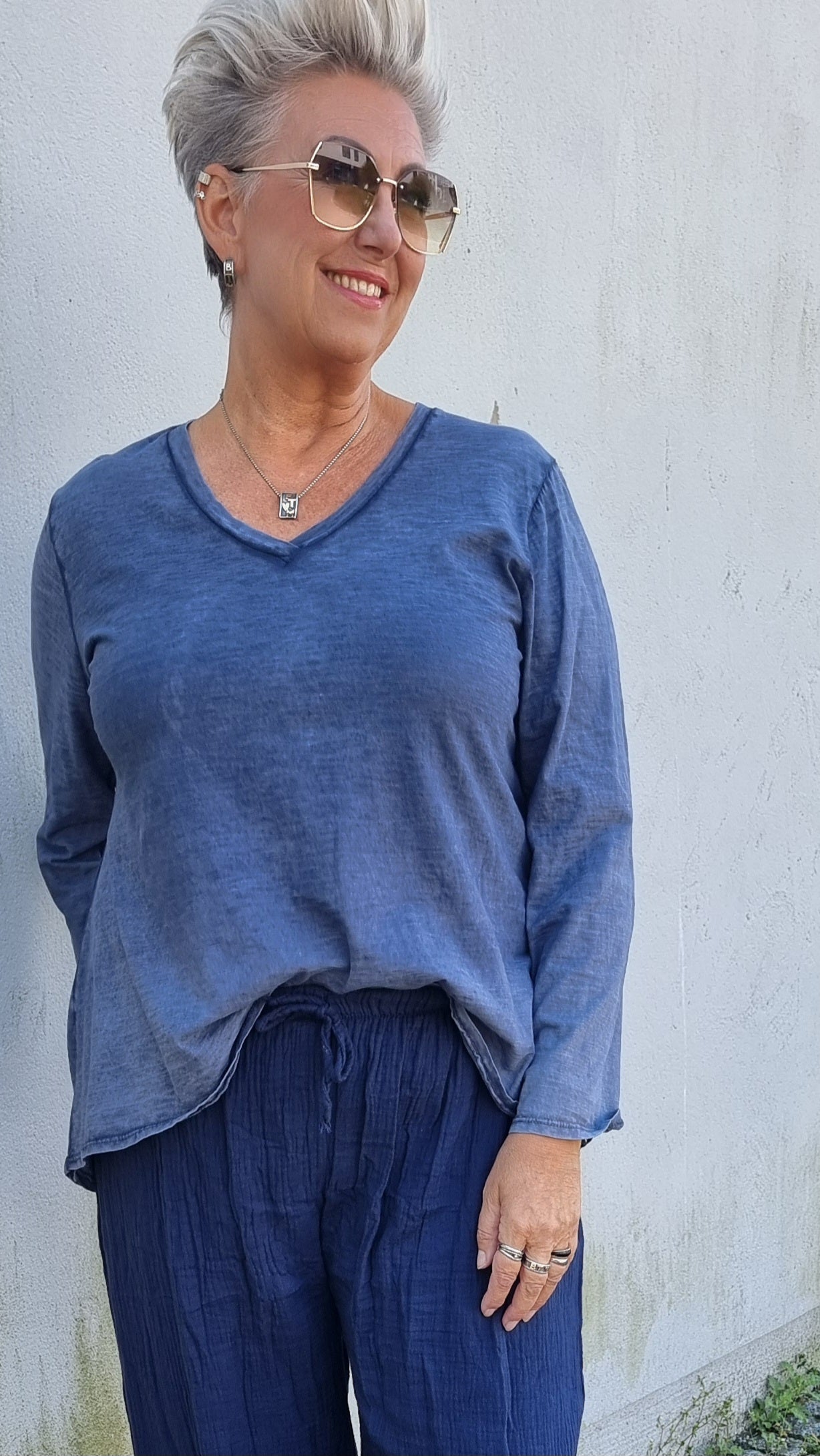 Bomulls topp I vasket mörkblå. V-hals och långa armar. Mycket skön på. A-form så fin vidde över magen.