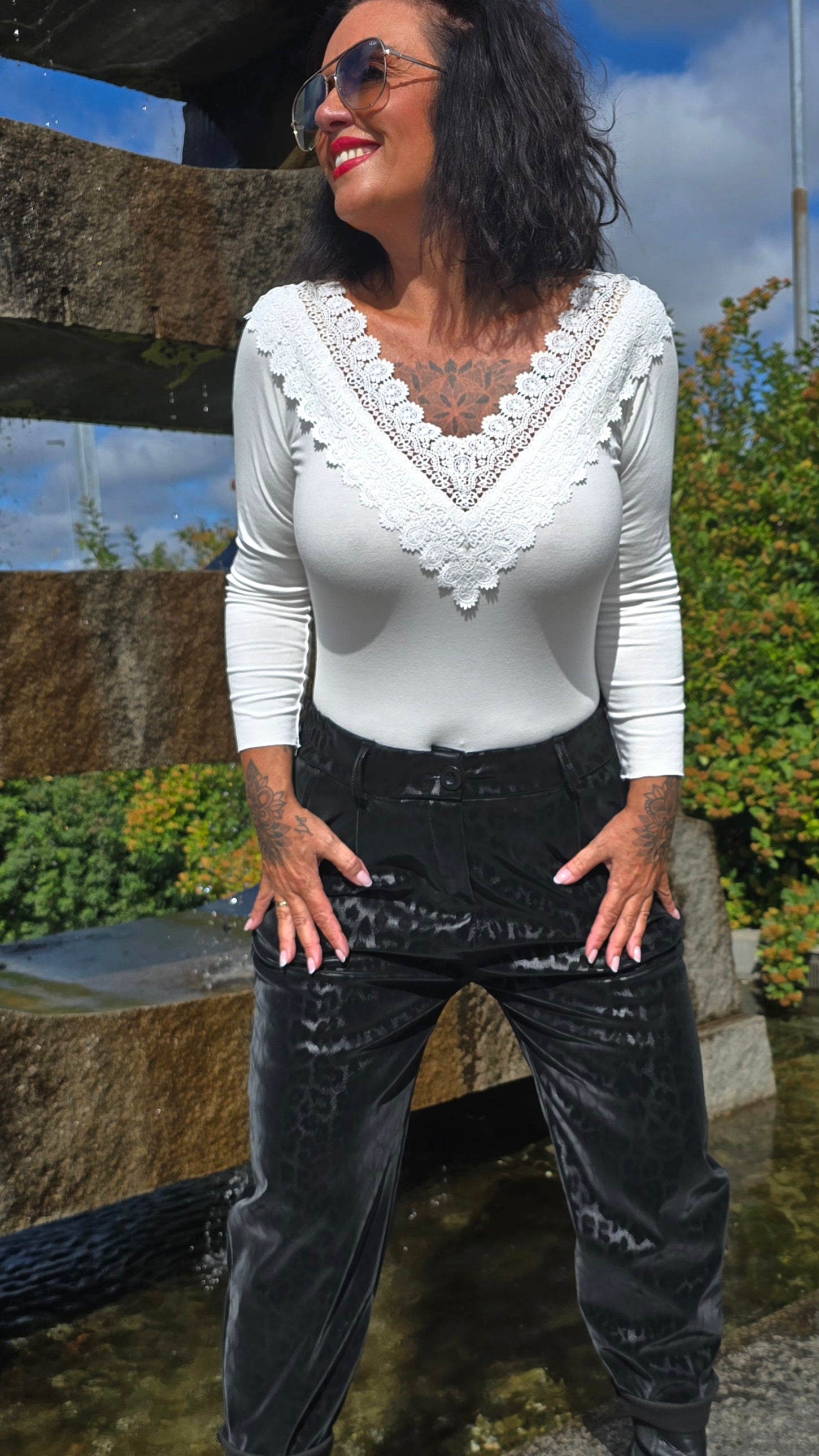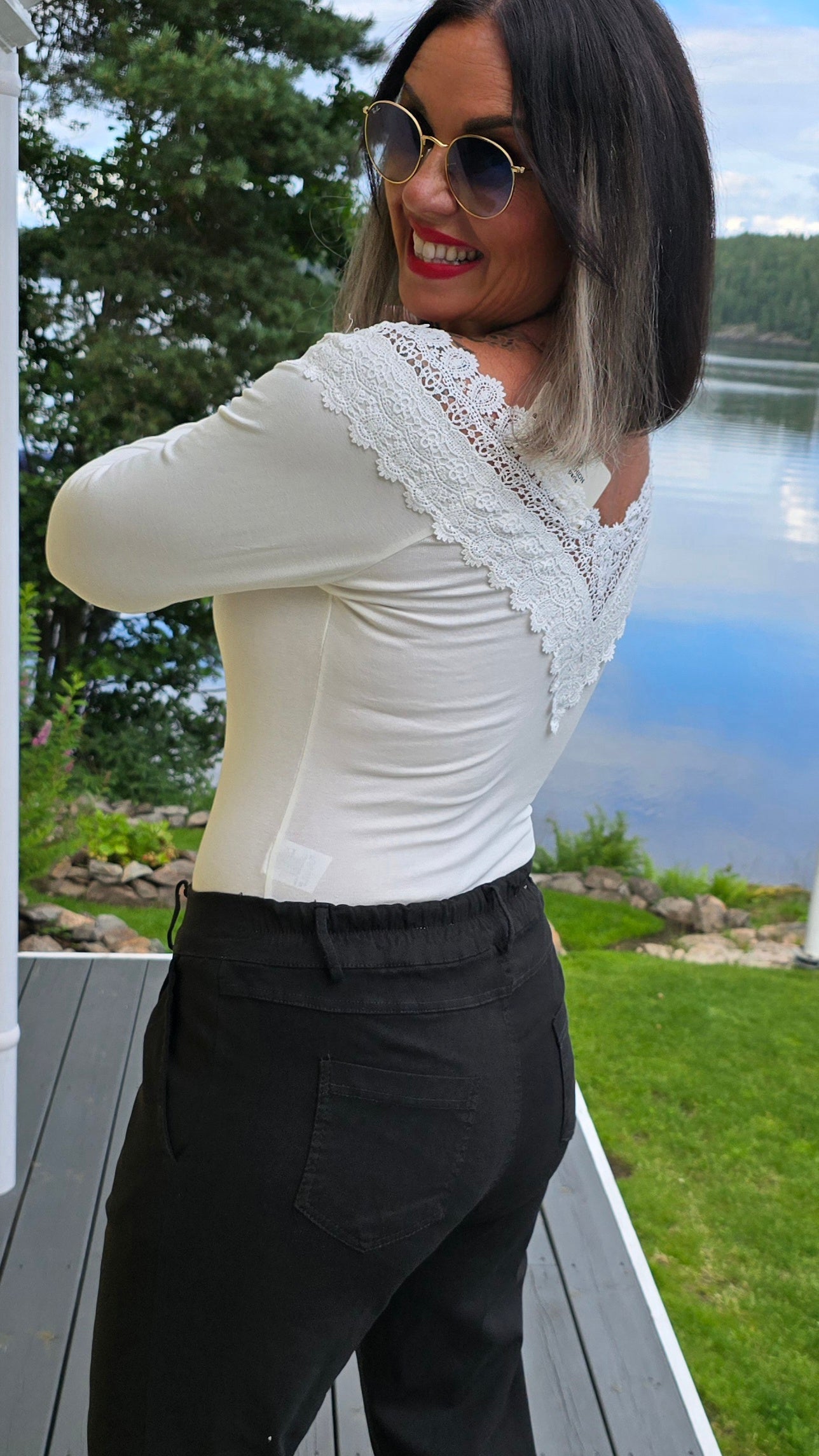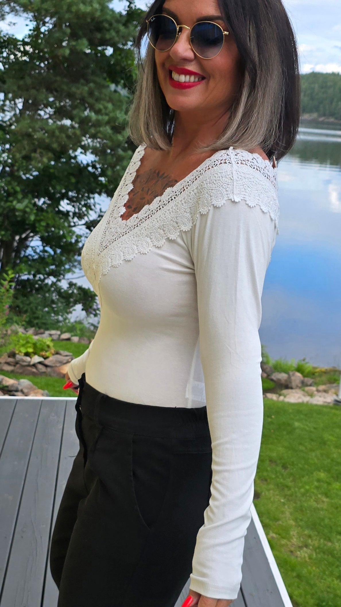Läcker body med blonder I halsen. Långa armar. Slimmad modell med god stretch . 2 knappar nederst . Otroligt behaglig på. Modellen har valt denna I str s/m för att den ska sitta mer över skulder partiet.