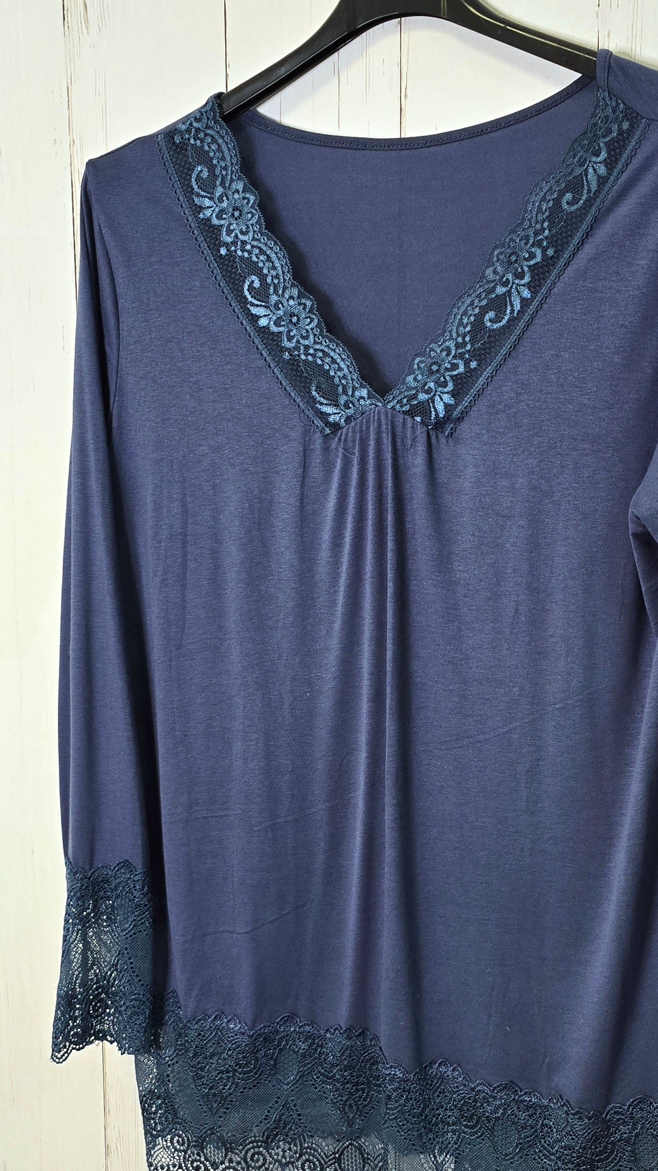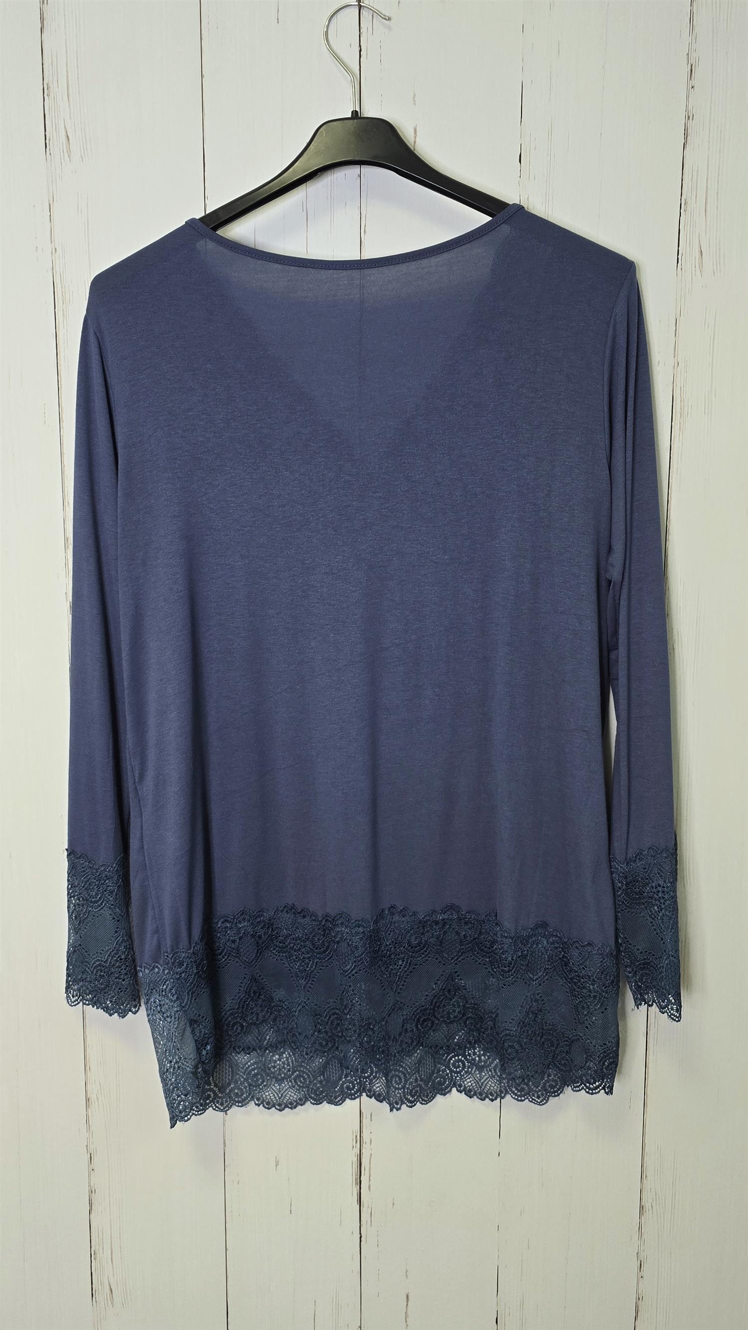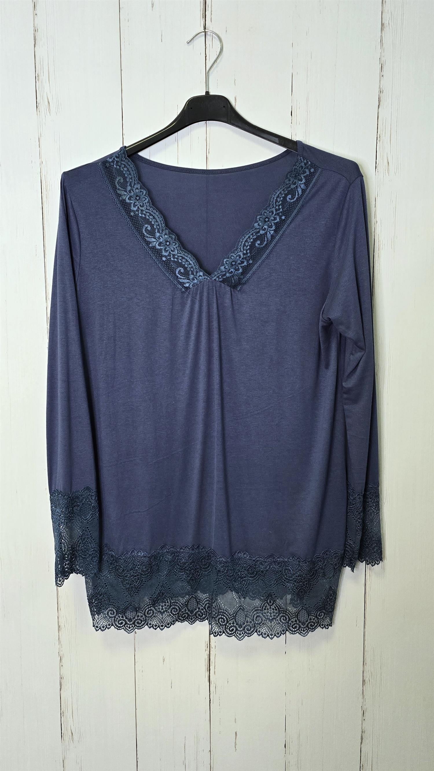 Tunn mjuk topp med blondedetaljer. Djup v-hals. Faller så fint på. Långa armar. Denna är perfekt att ha under stickade plagg. Fint med blonden nederst och nederst på armen.