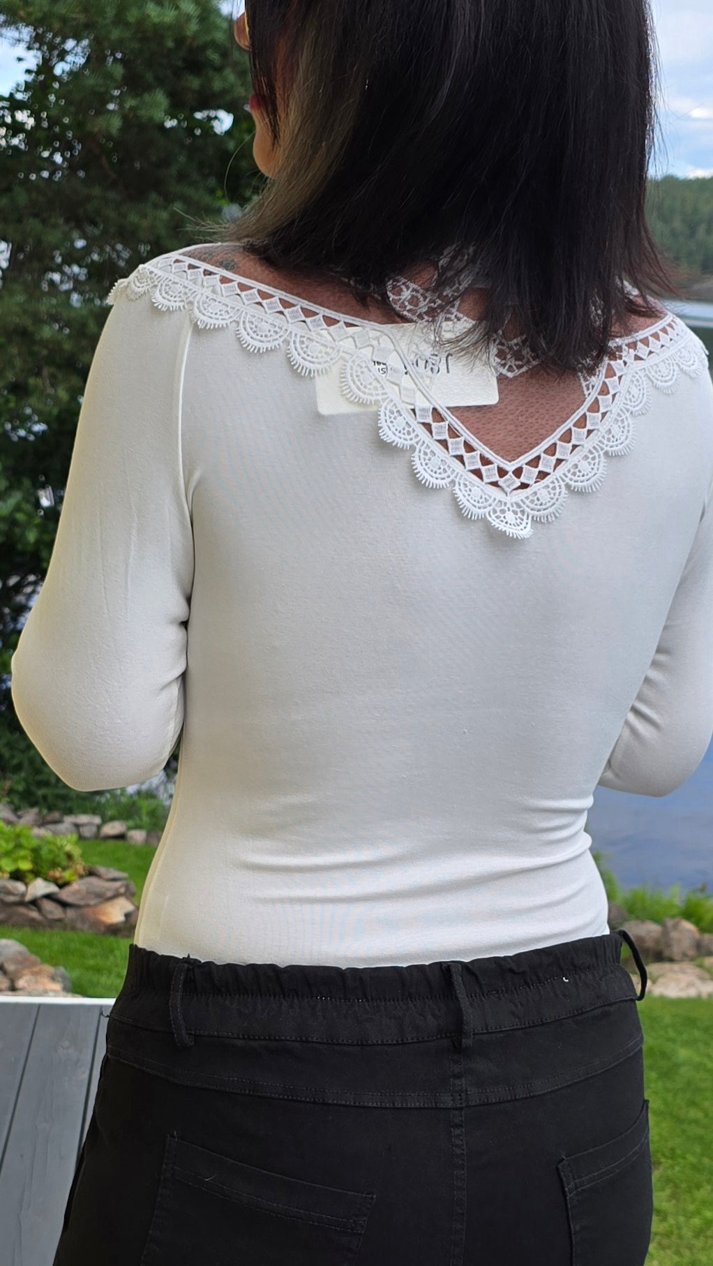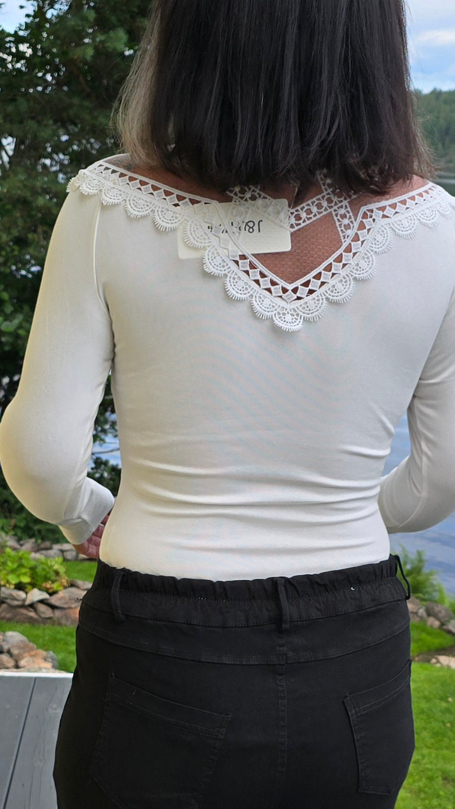 Läcker body med blonder I halsen. Långa armar. Slimmad modell med god stretch . 2 knappar nederst . Otroligt behaglig på. Modellen har valt denna I str s/m för att den ska sitta mer över skulder partiet.