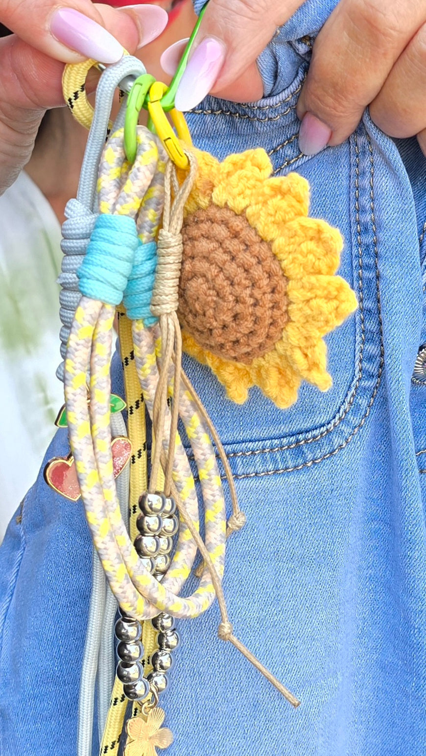 Så fin veskepynt med stor stickad solros.