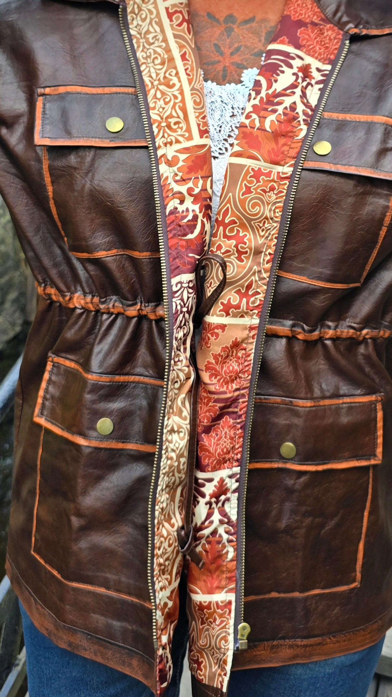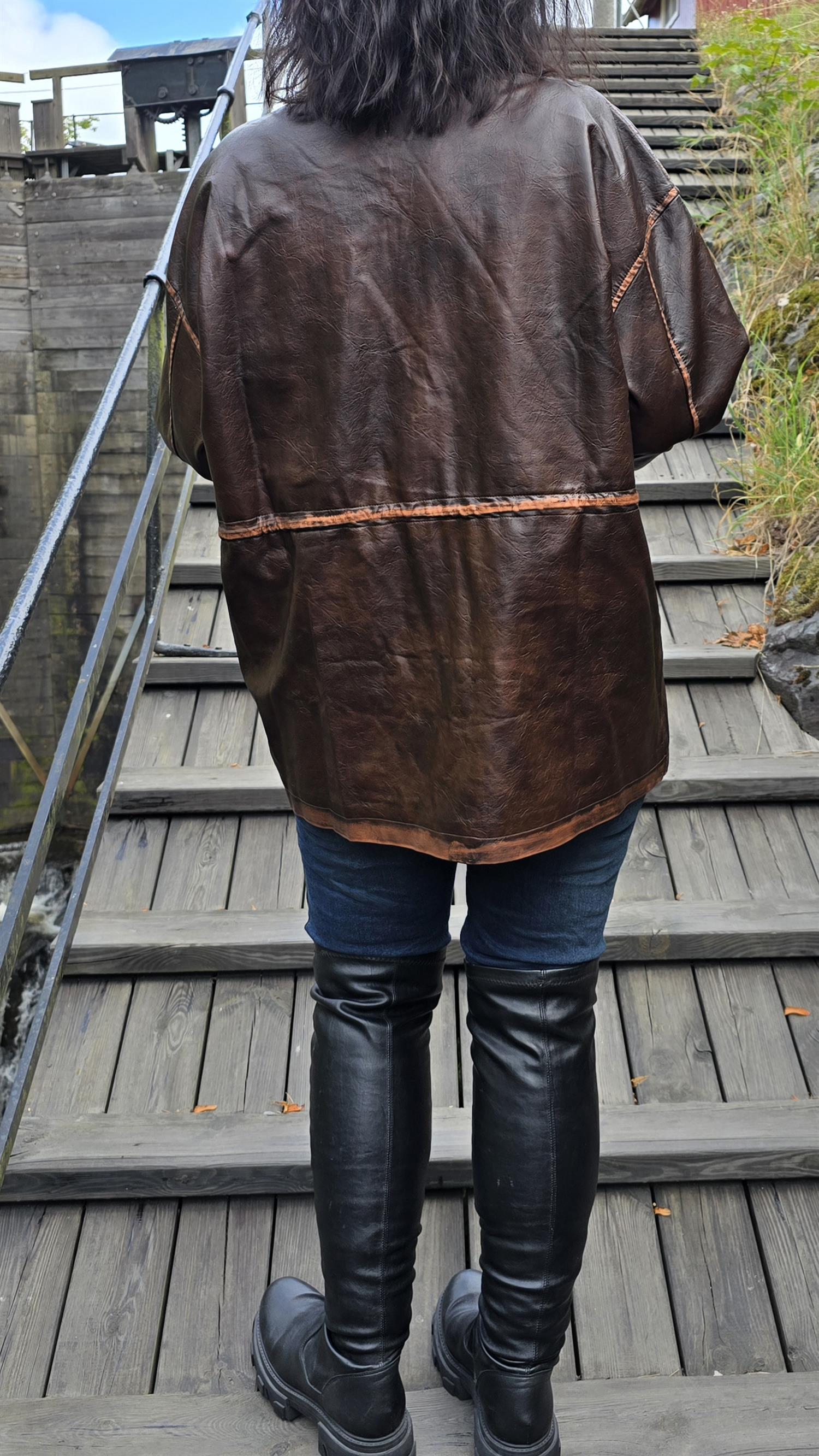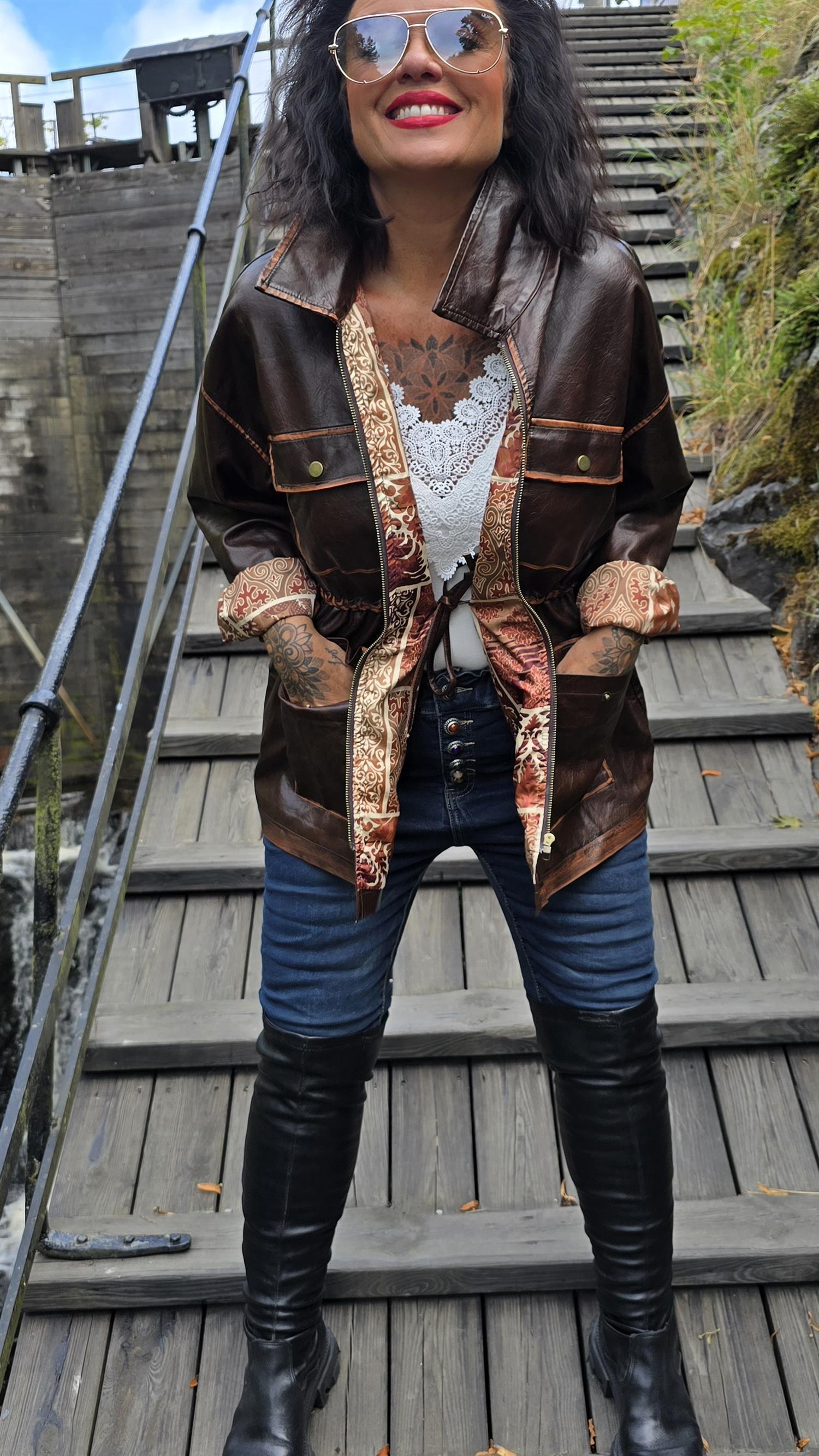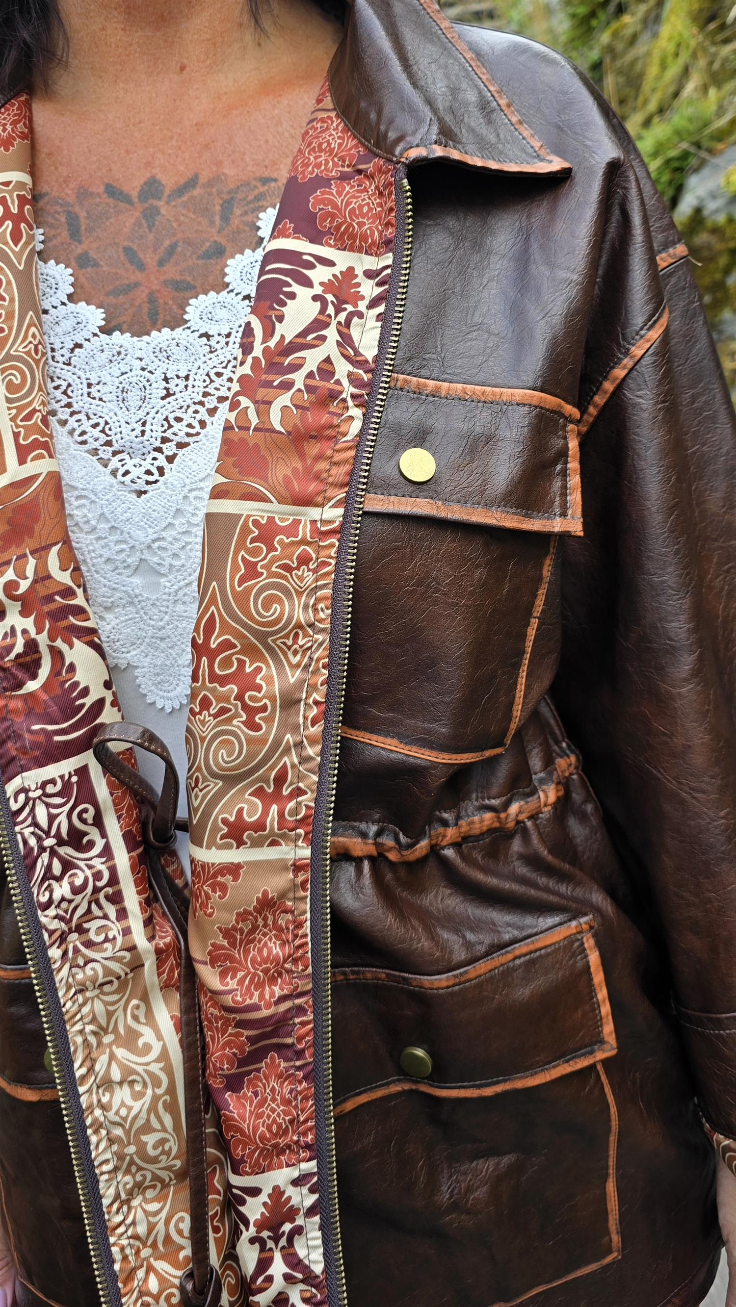 Tuff jacka I fake skinn med knytning I midjan . Jackan har slitna detaljer som gör den råare i stilen. Snyggt foder i oranga toner på insidan. Litt 70- tal stil.