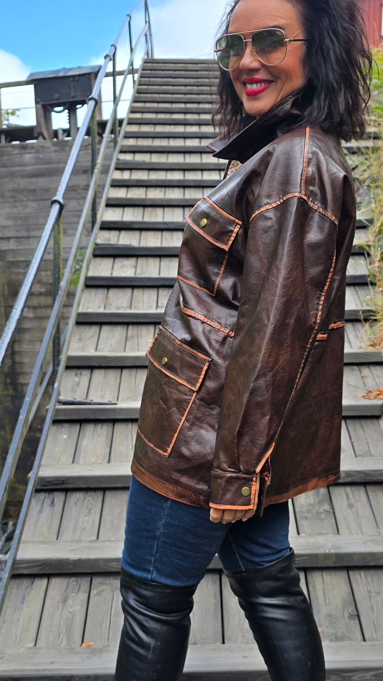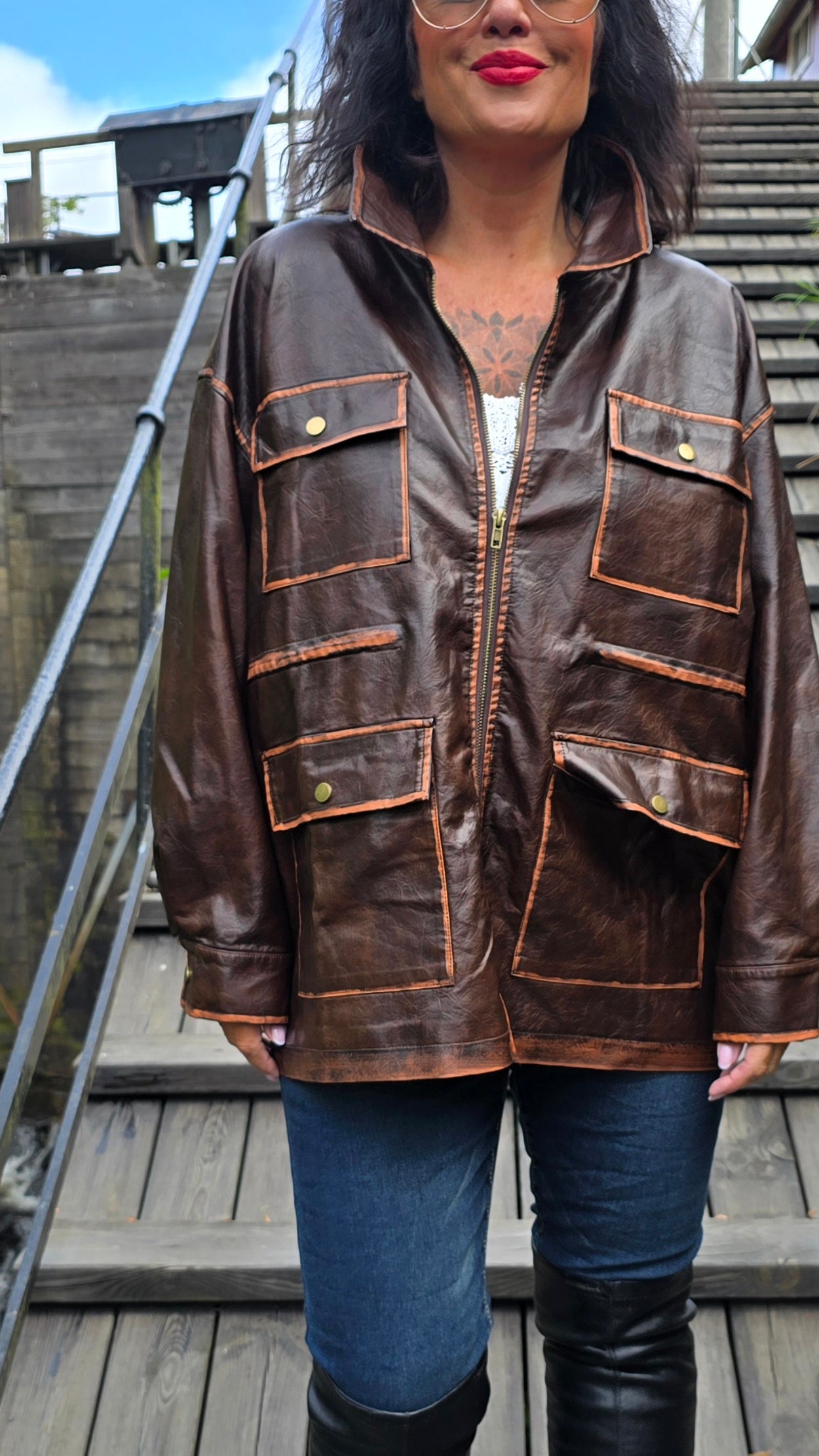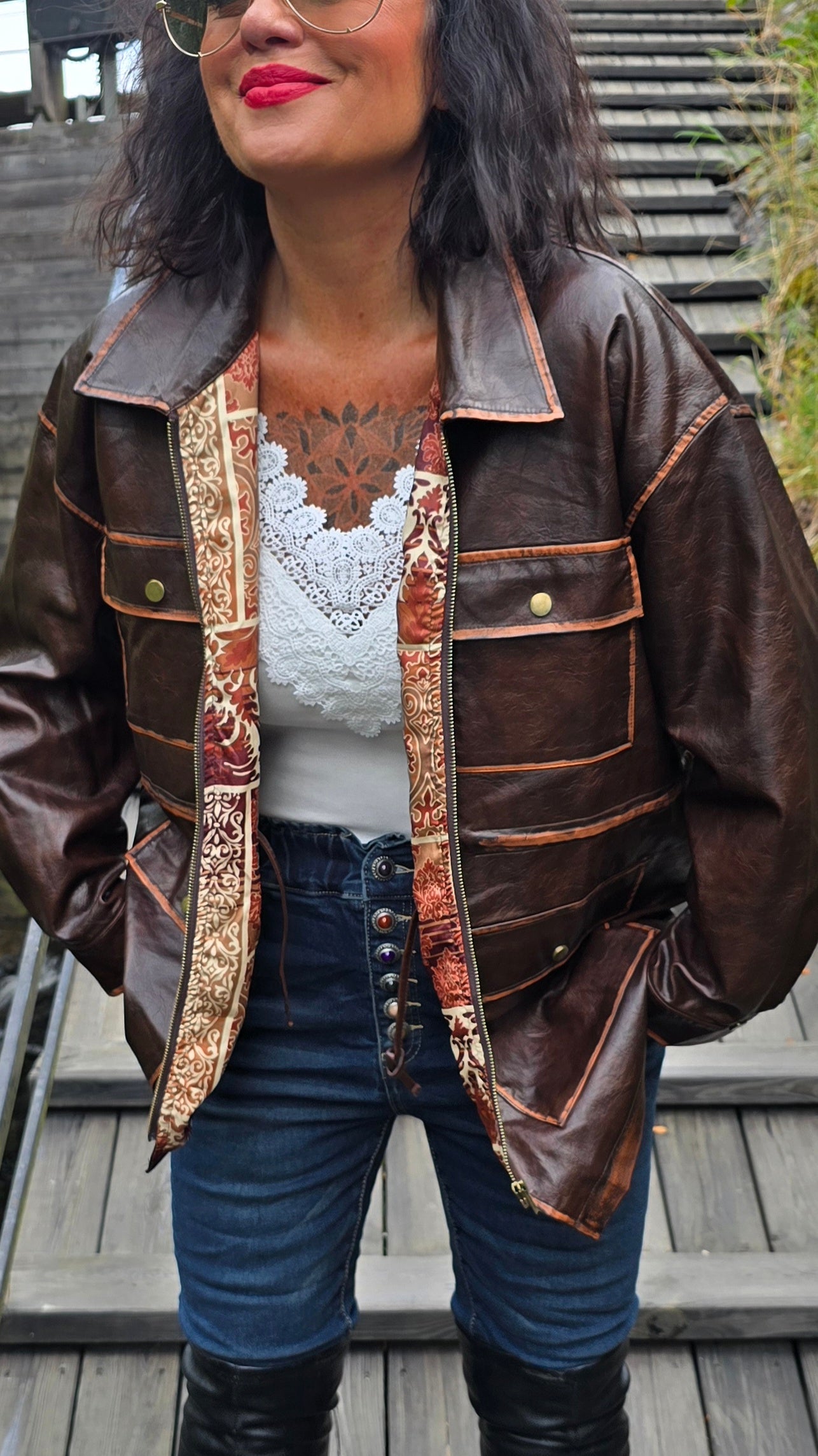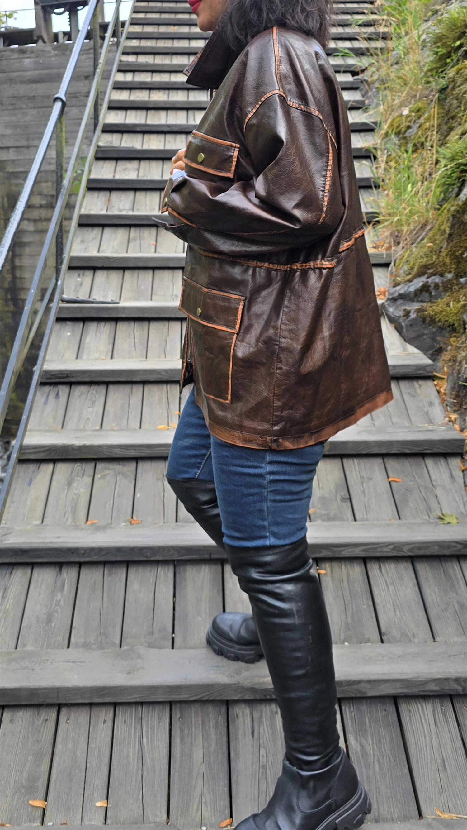 Tuff jacka I fake skinn med knytning I midjan . Jackan har slitna detaljer som gör den råare i stilen. Snyggt foder i oranga toner på insidan. Litt 70- tal stil.