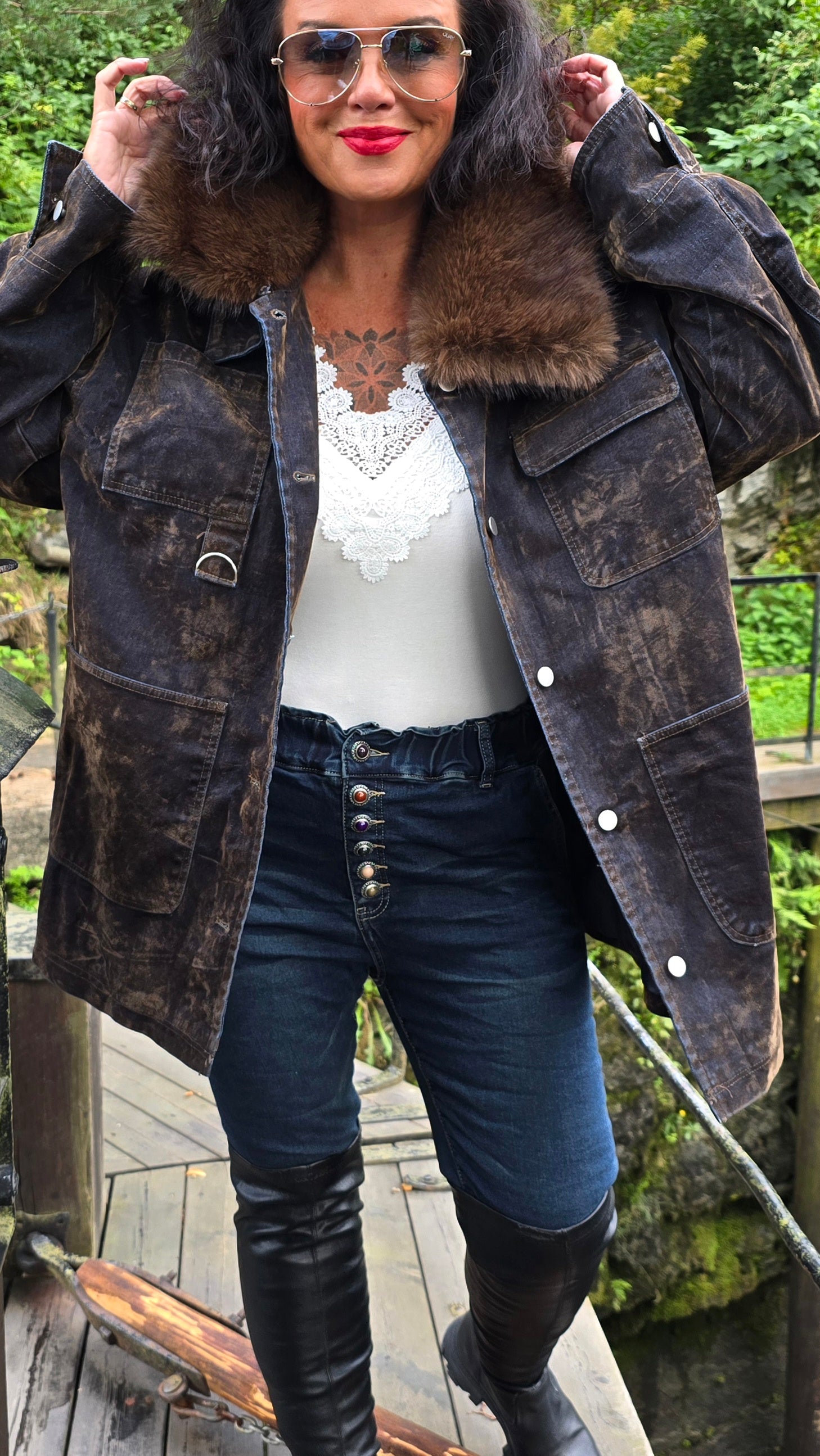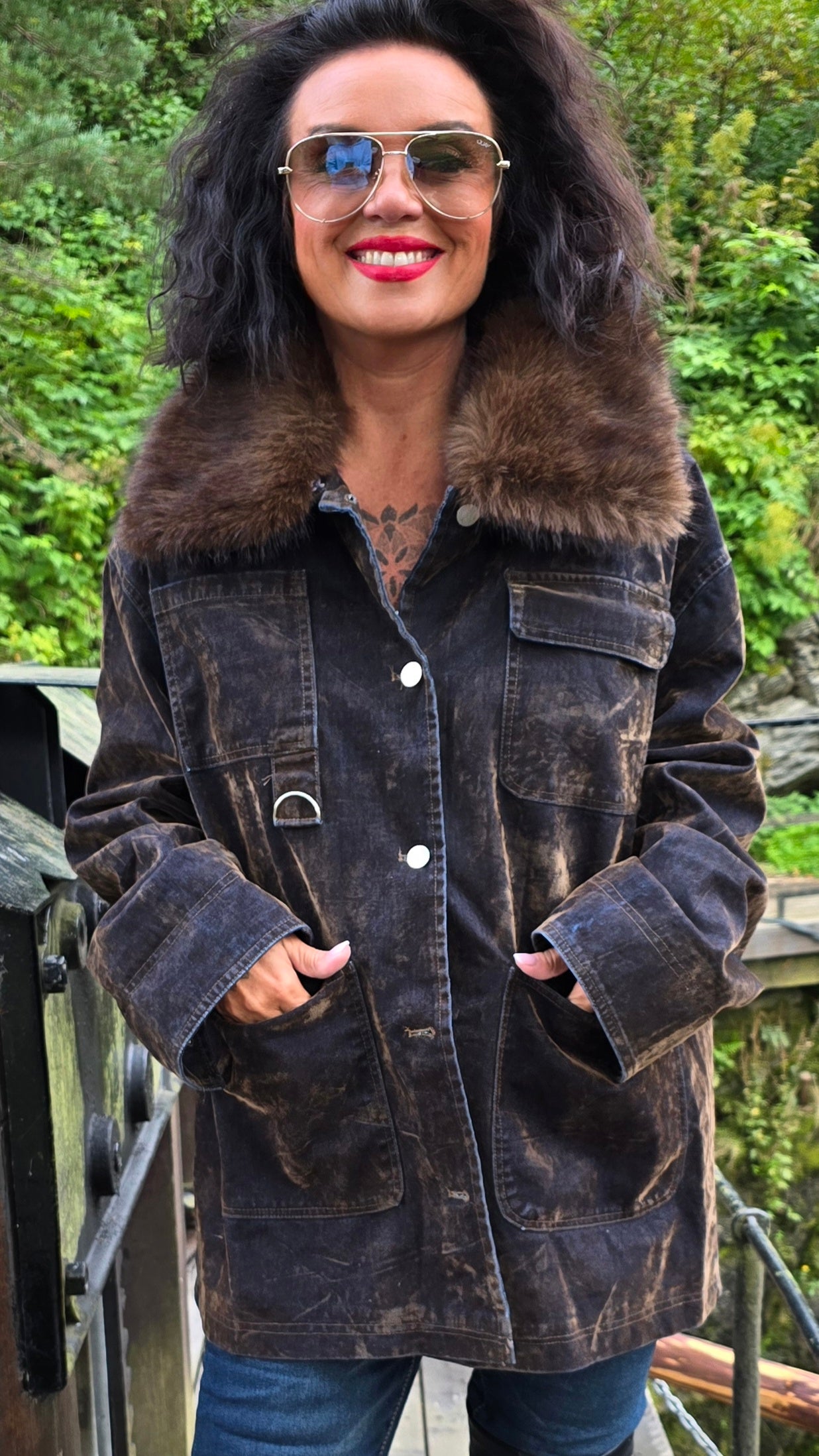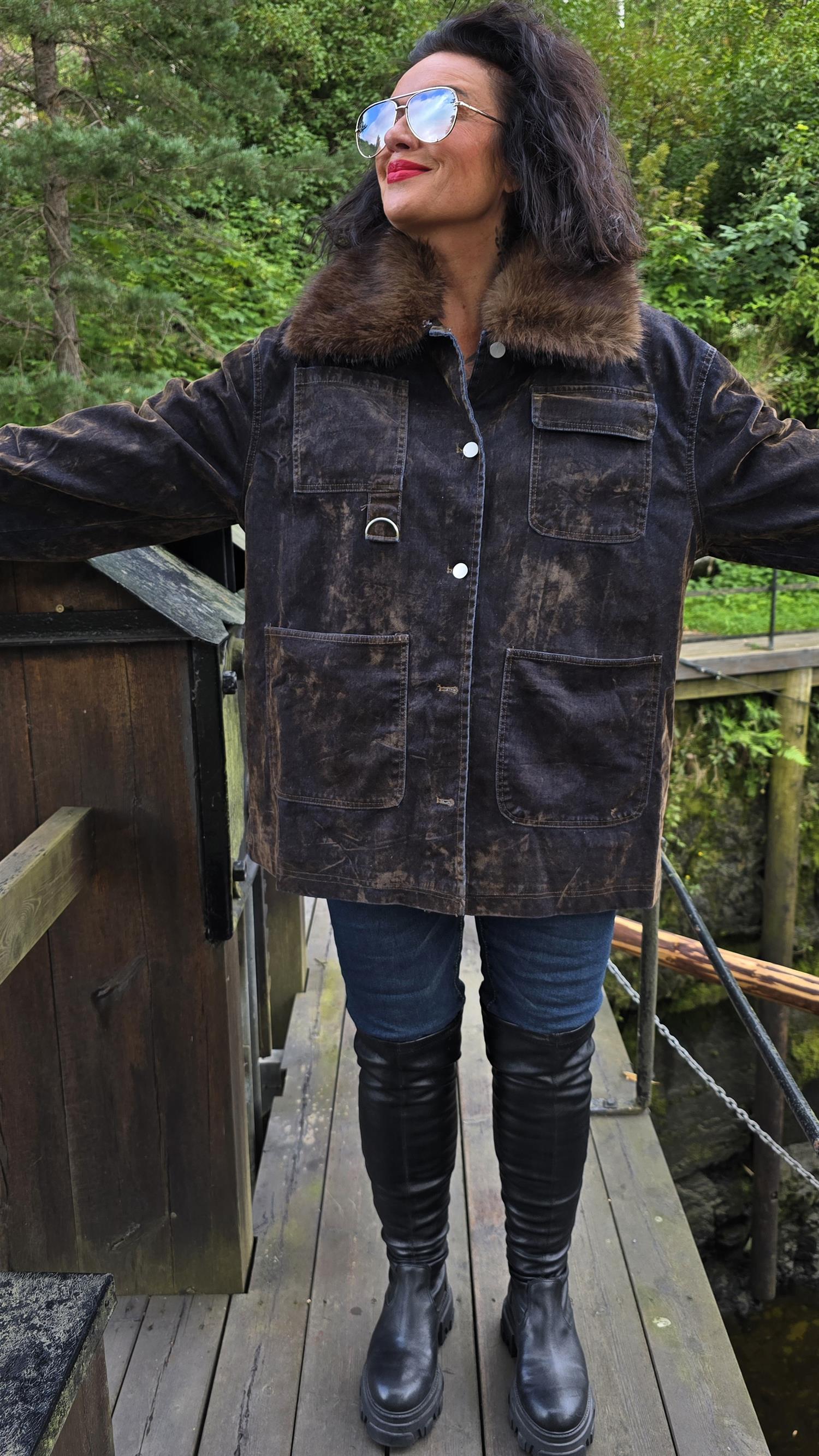 En helt speciell jacka som man inte ser på alla. Den har litt velour stil på tyget och den går I brunt och navy. Baggy modell. Fake pälskrage runt halsen som kan tas av. Knappar I front och lommer I sidan. Fantastisk kul på.