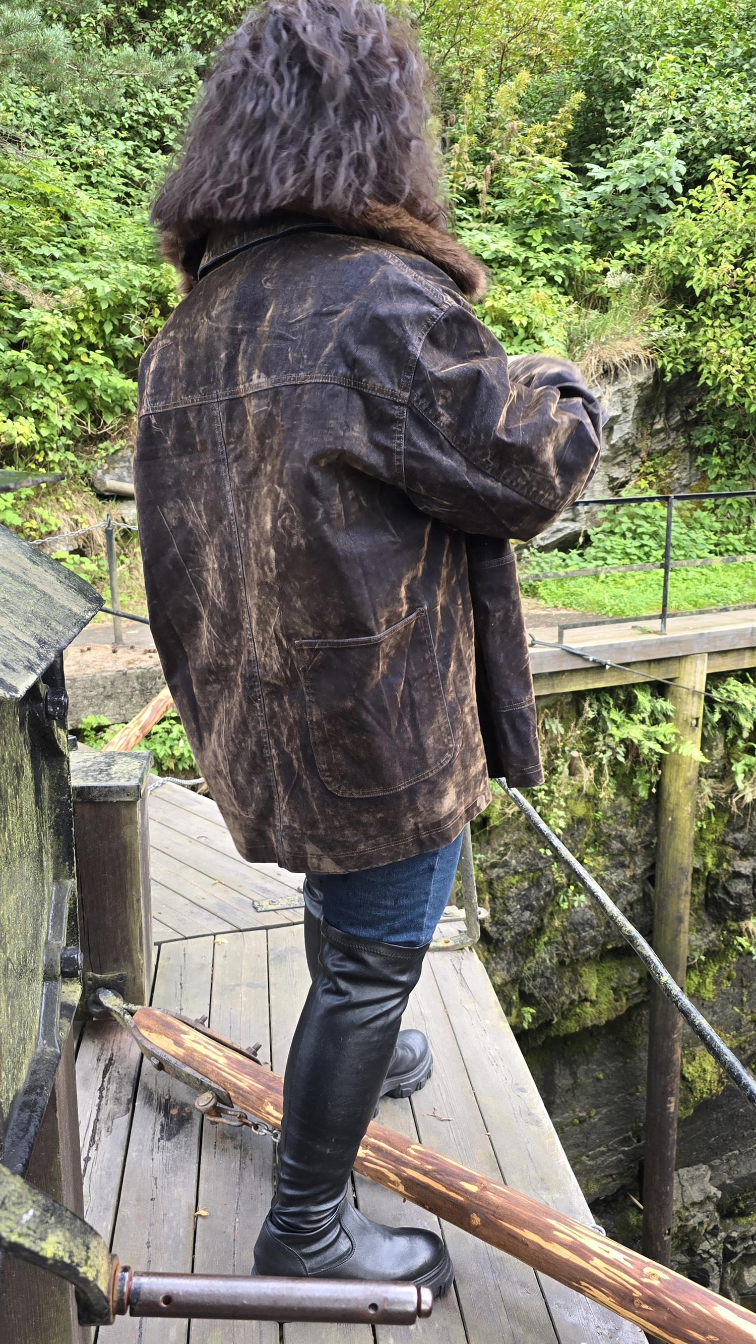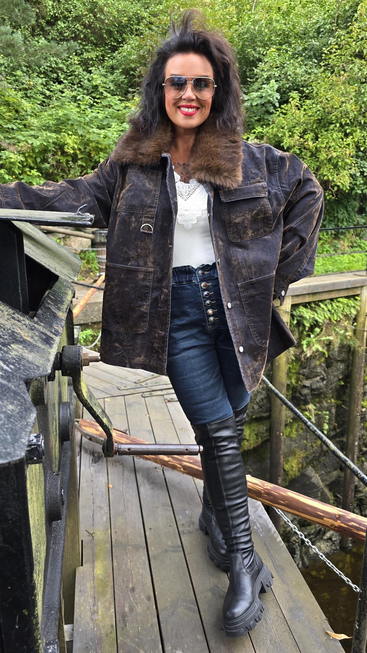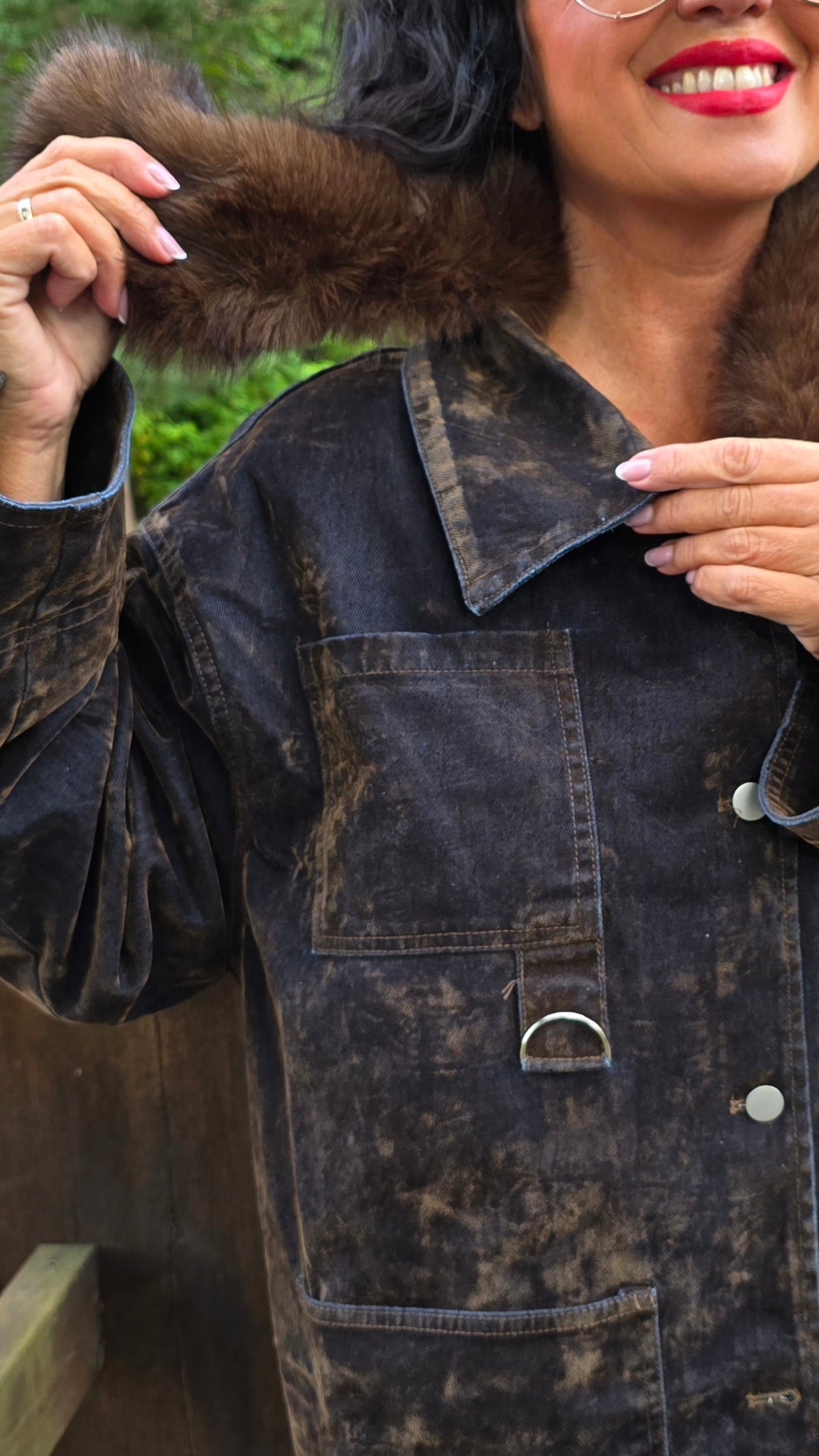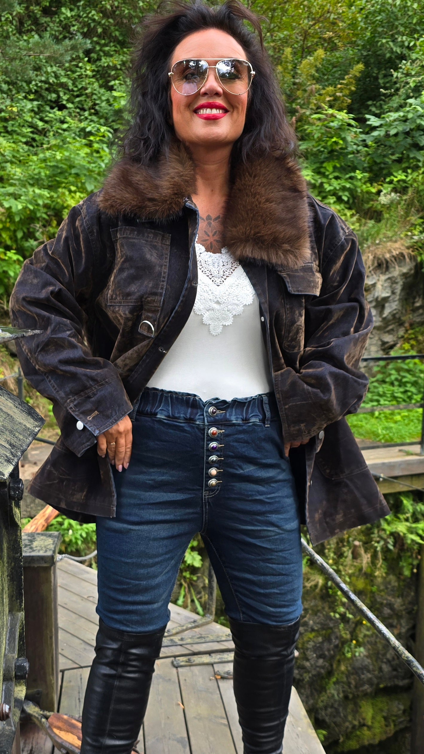 En helt speciell jacka som man inte ser på alla. Den har litt velour stil på tyget och den går I brunt och navy. Baggy modell. Fake pälskrage runt halsen som kan tas av. Knappar I front och lommer I sidan. Fantastisk kul på.