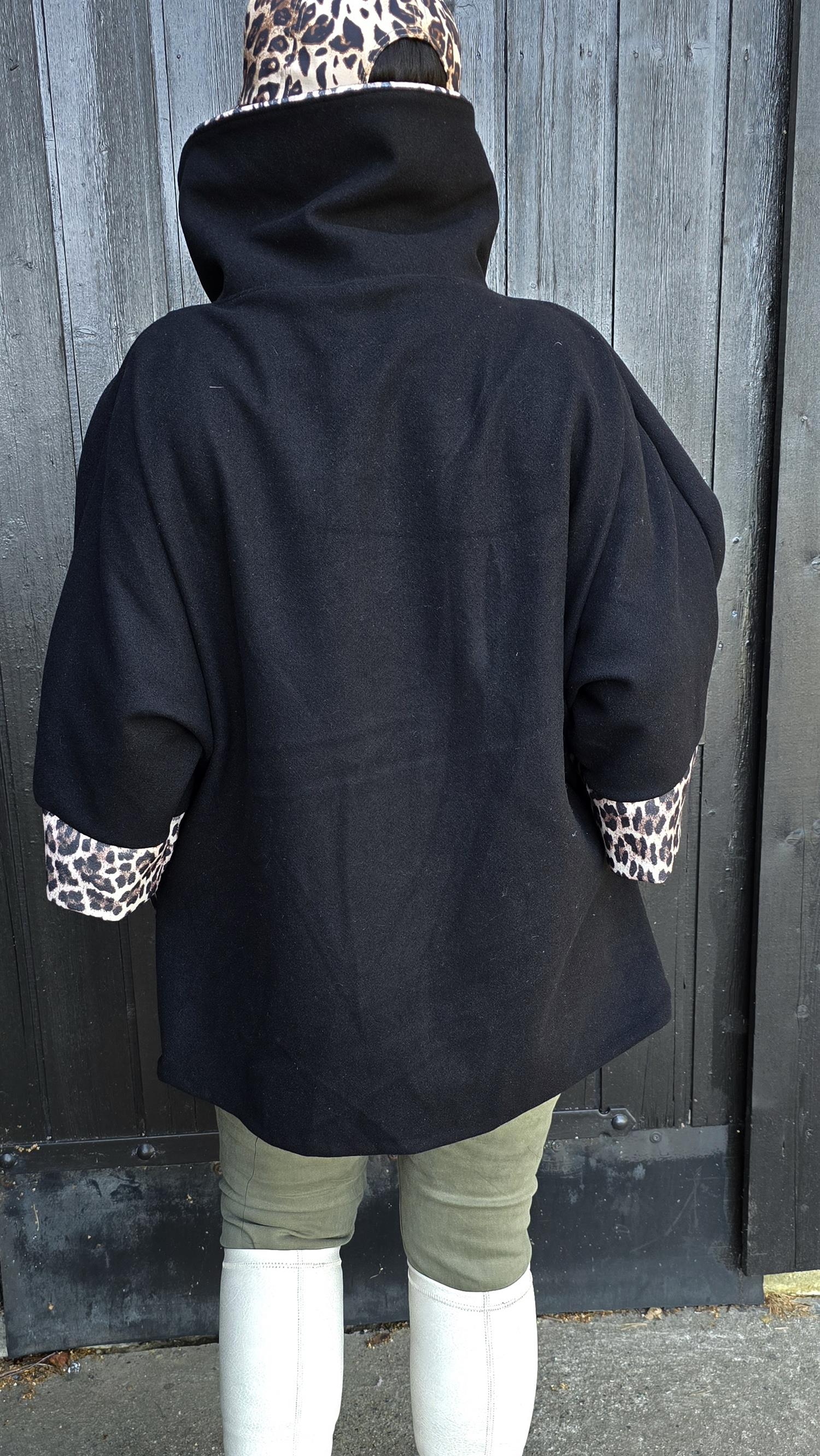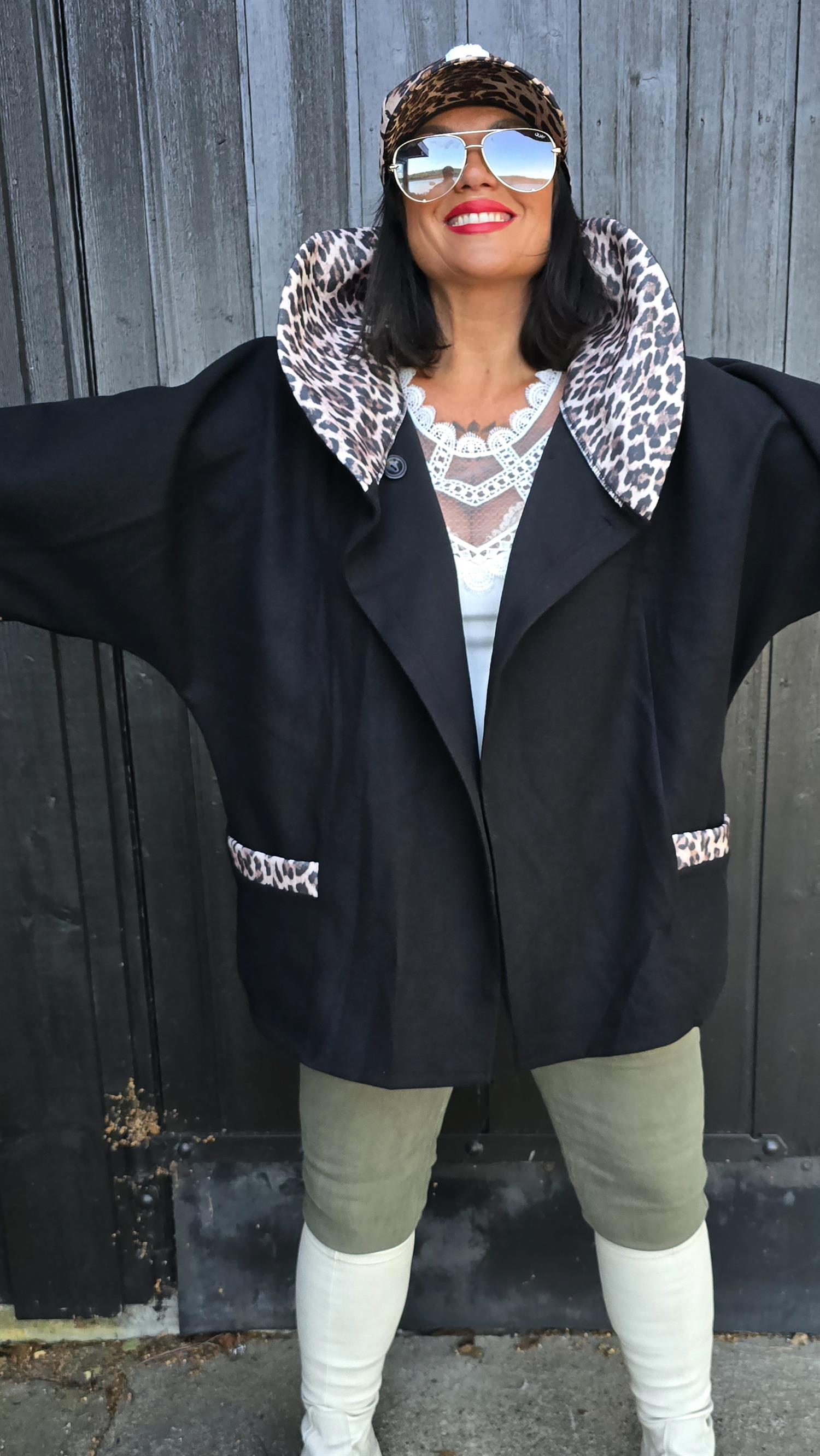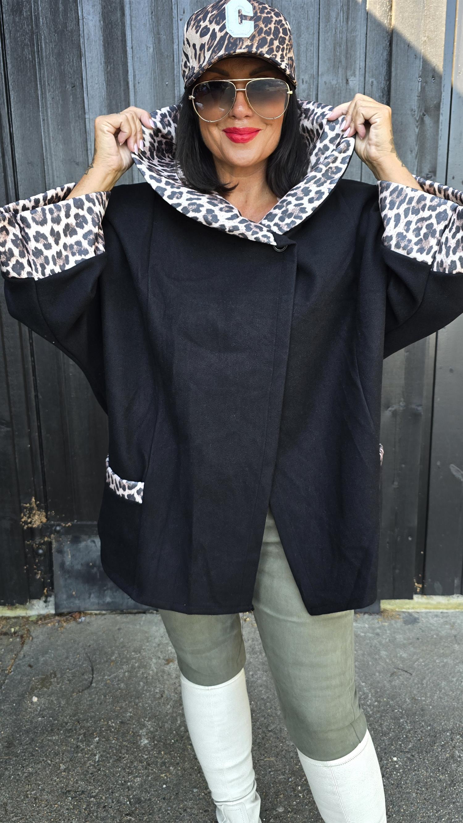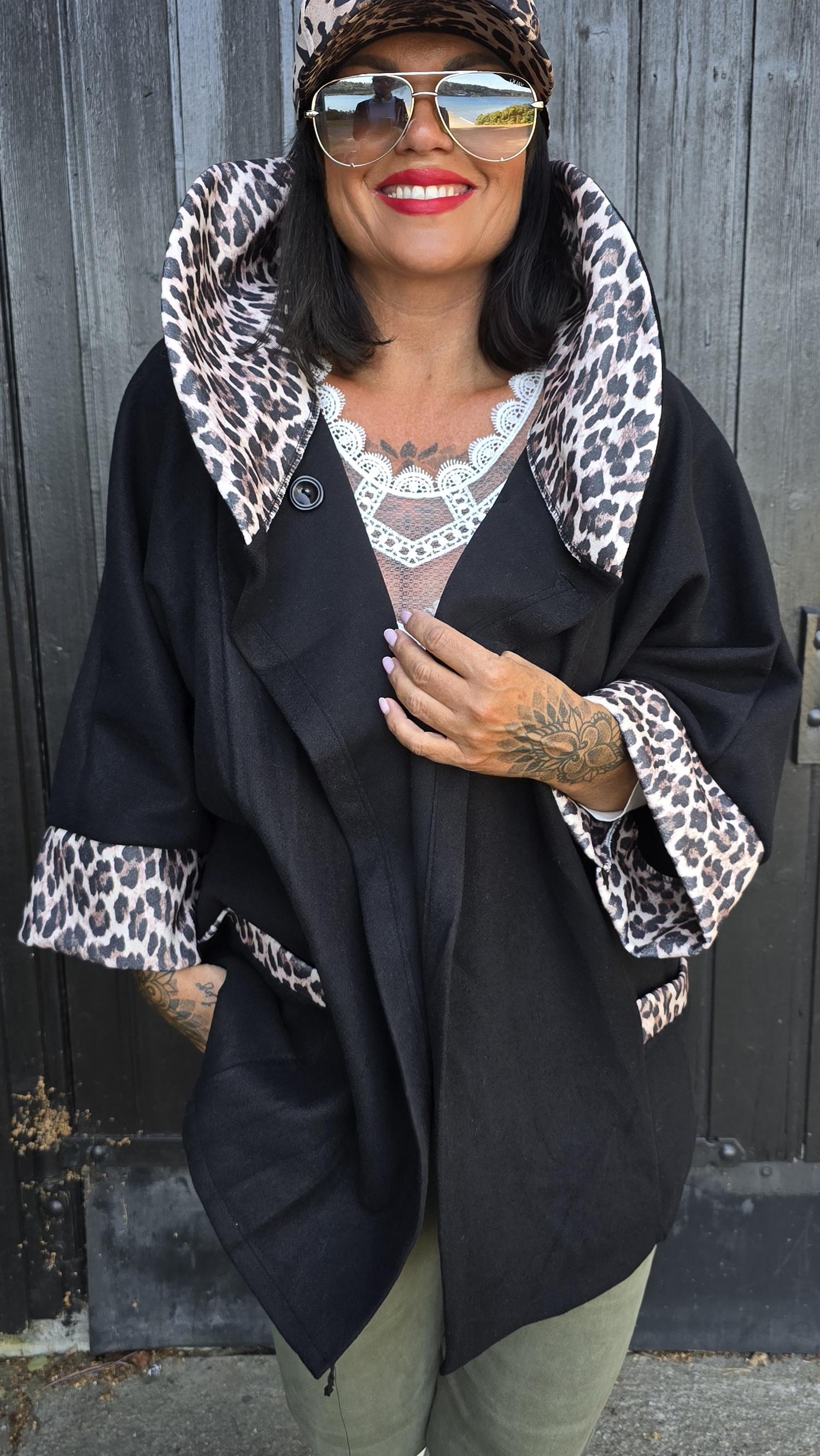 Oversized poncho jacka med kortare armar längde. Snygga detaljer med leopard print. Stor krage. Knappar I halsen.