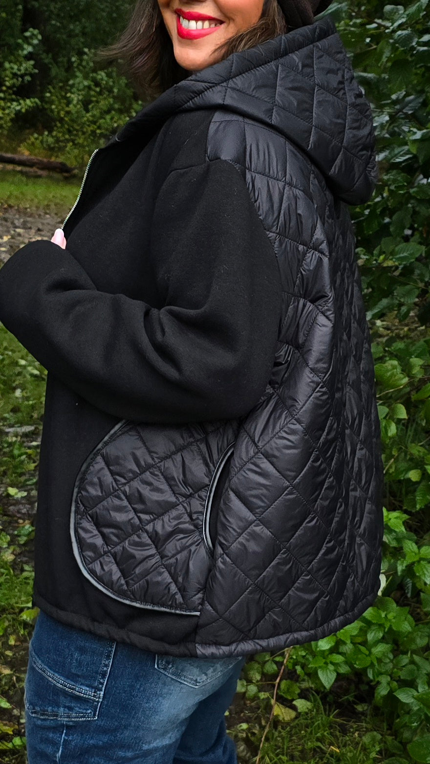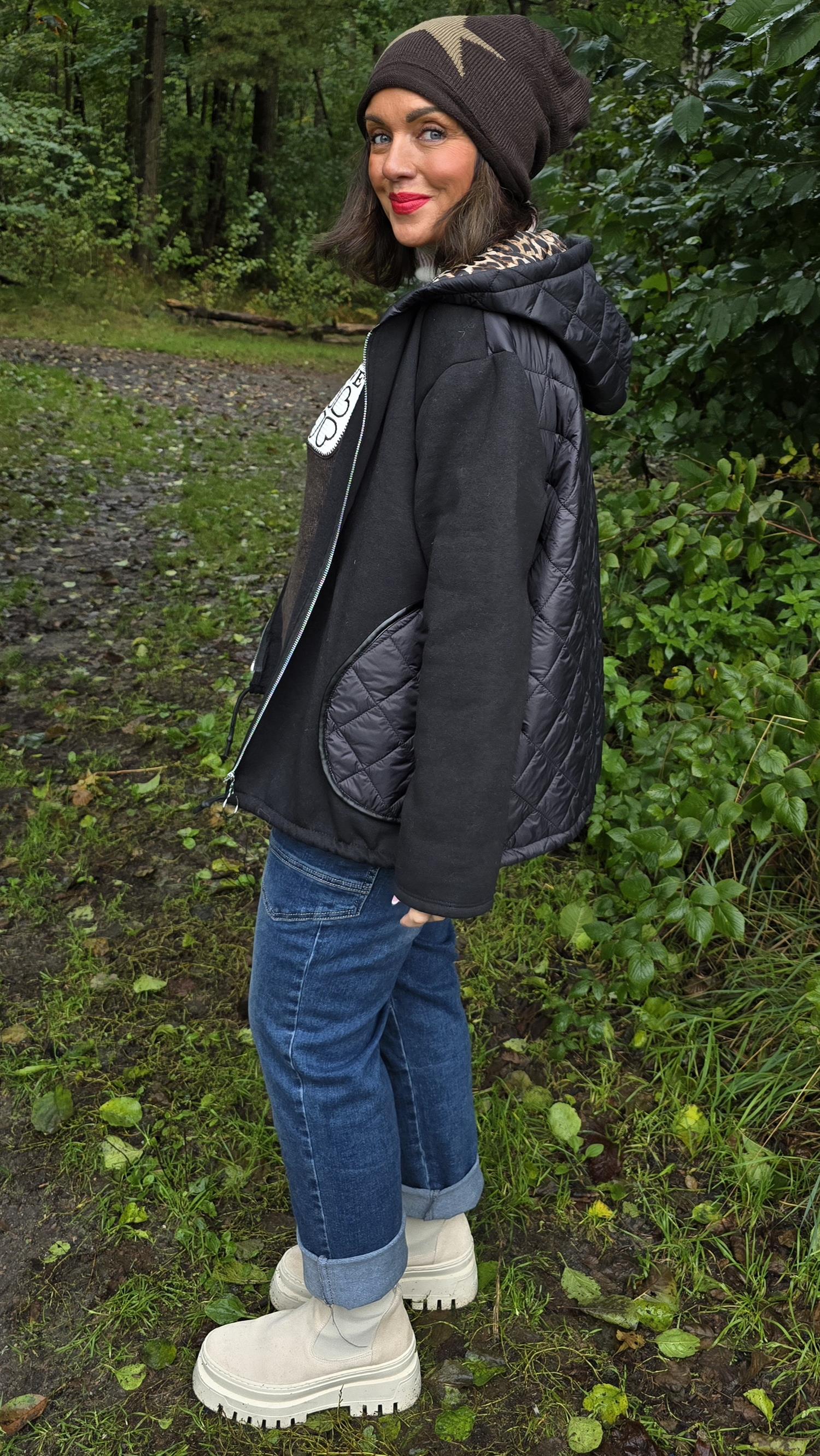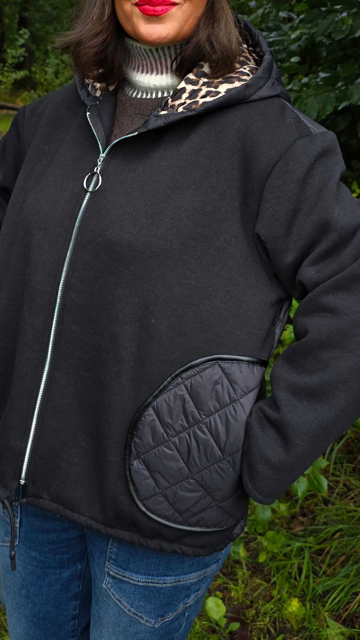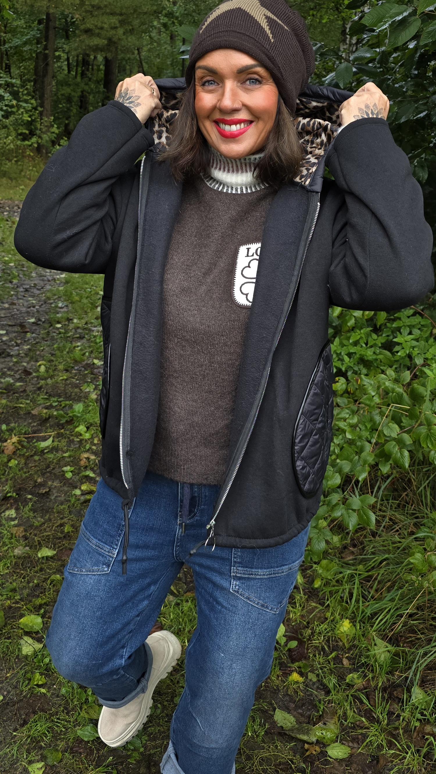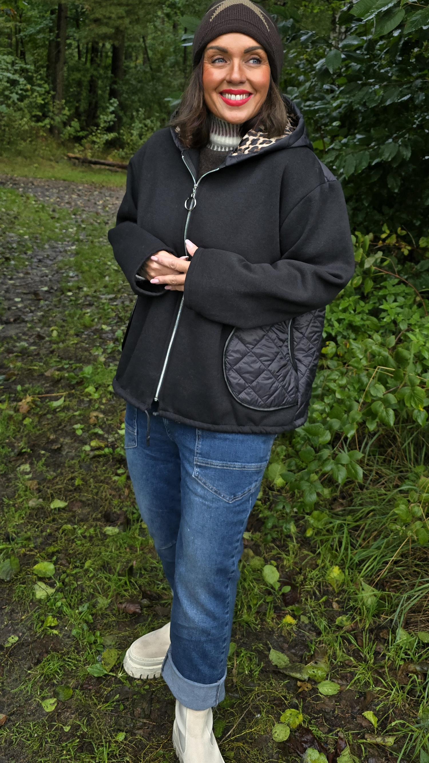 En trendy og komfortabel jakke med glidelås foran, dekorert med en stor sirkel som henger på glidelåsen som en ekstra detalj. Den har snøring nederst, store lommer i front, en romslig hette med leopardmønster på innsiden og flosset kvalitet på innsiden av ermene. Ryggpartiet og lommene er laget i boblejakkestoff, mens fronten og ermene er i mykere stoff for en spennende kontrast. Også hetten har boblestoff på utsiden og leopardmønster inni.