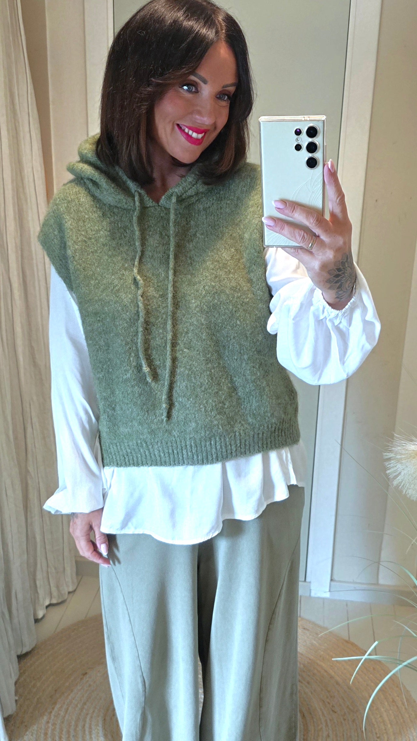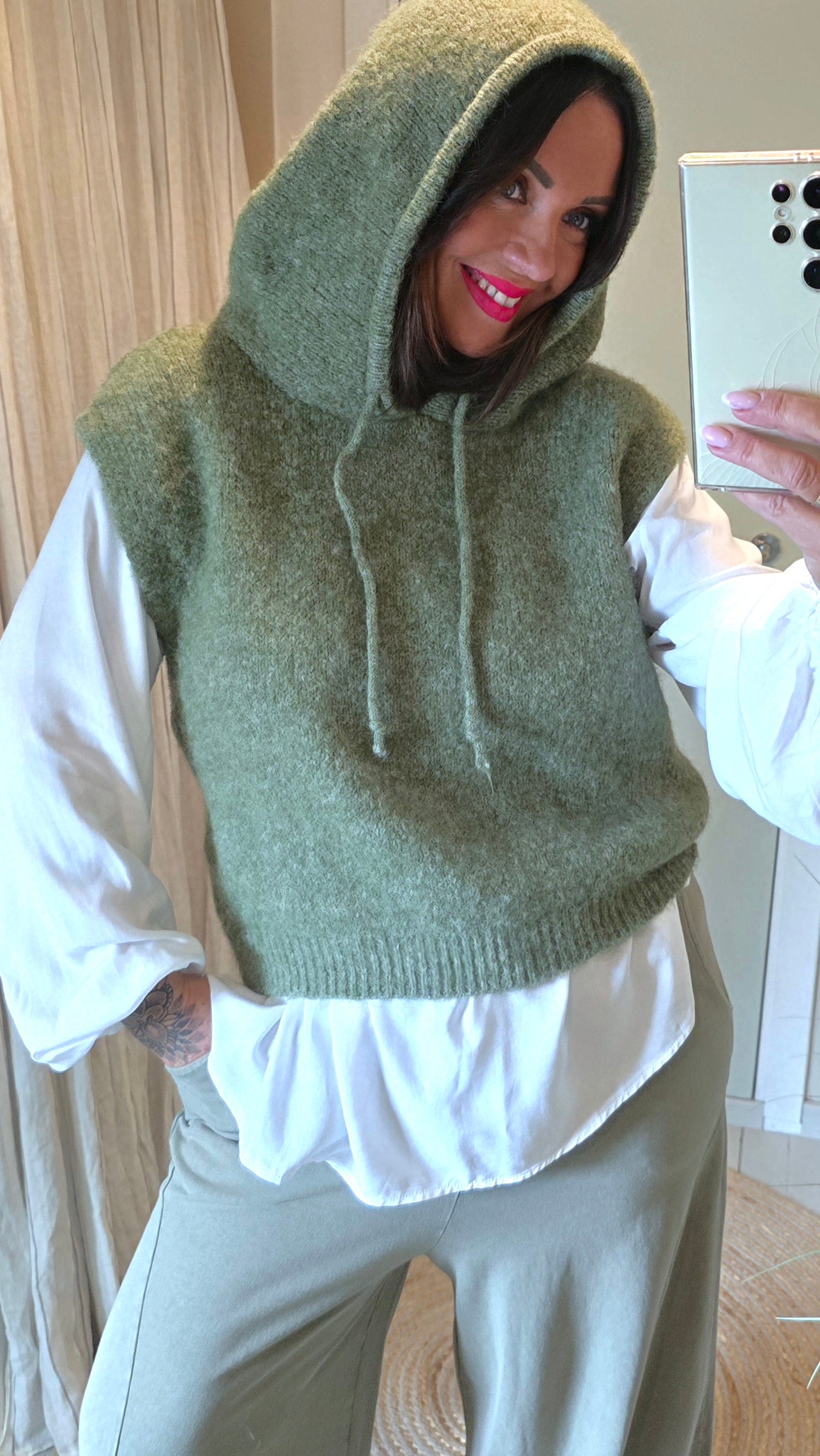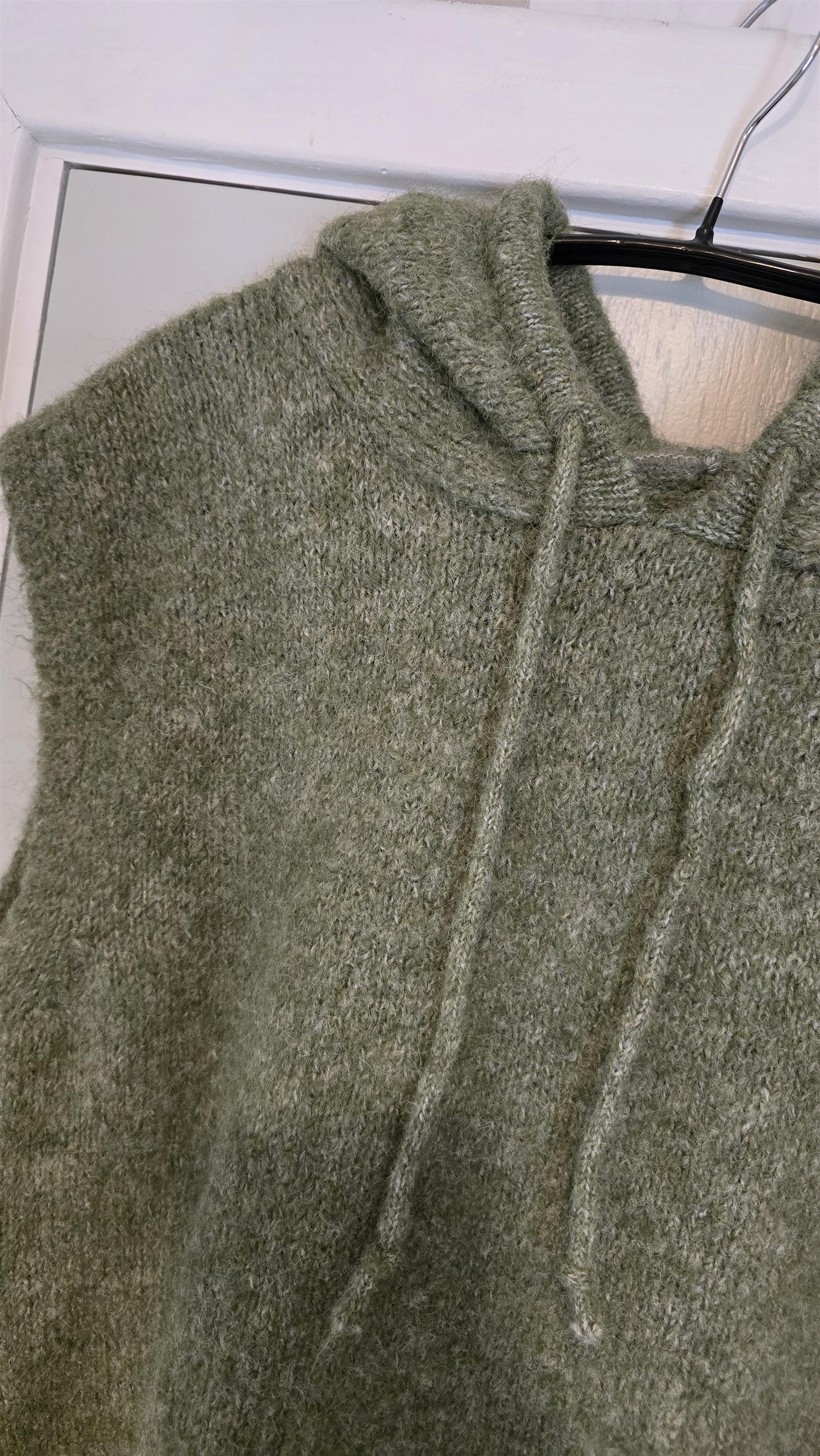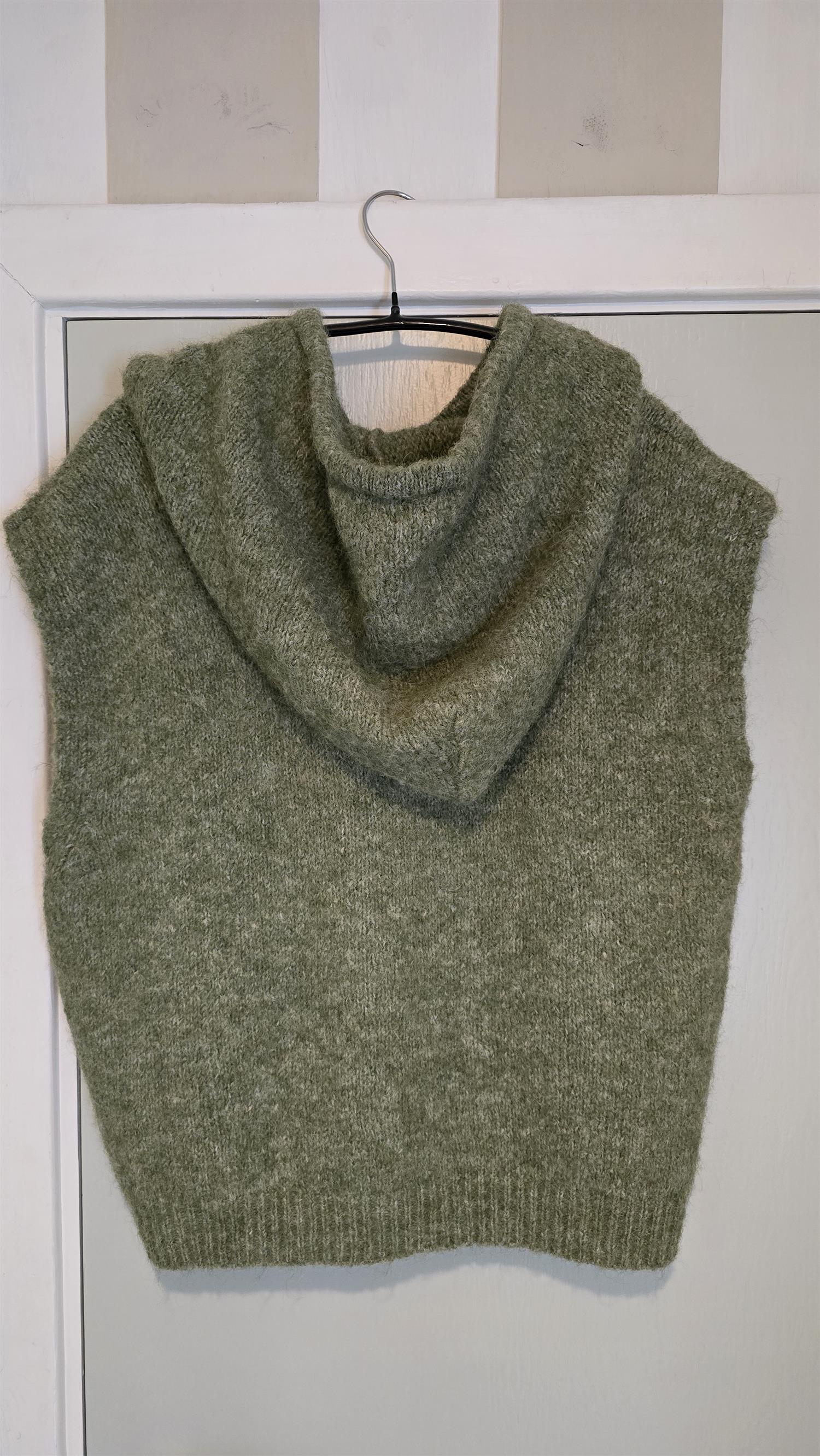 En fresh og stilfull strikket vest med en stor og fin hette. Hetten har snøring i samme strikk som resten av plagget, og designet er åpent fra skulder til under skulder slik at hele armen er fri. Vesten avsluttes med en bred ribbkant nederst og har en myk og behagelig kvalitet med 8 % ull. Et trendy plagg som gir et feminint og moderne uttrykk.