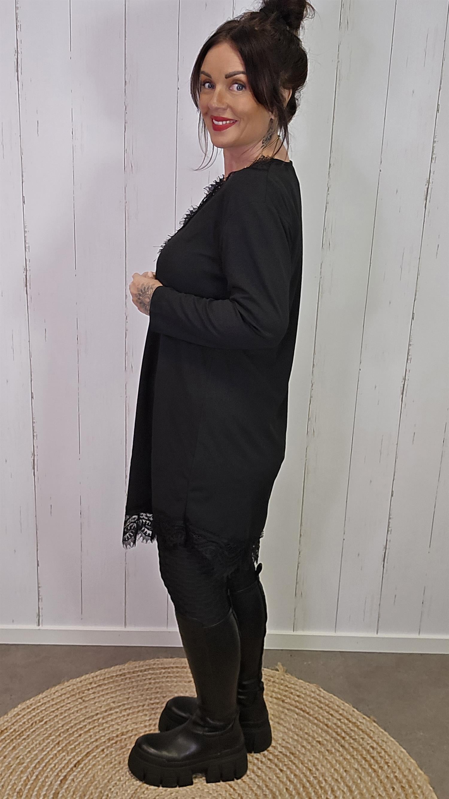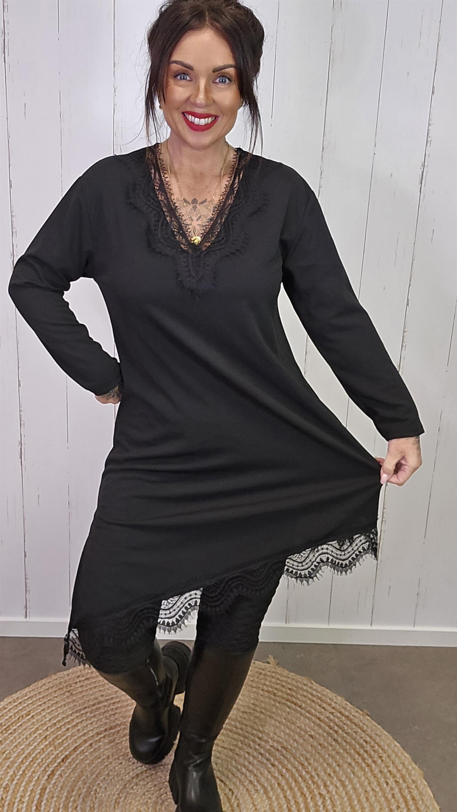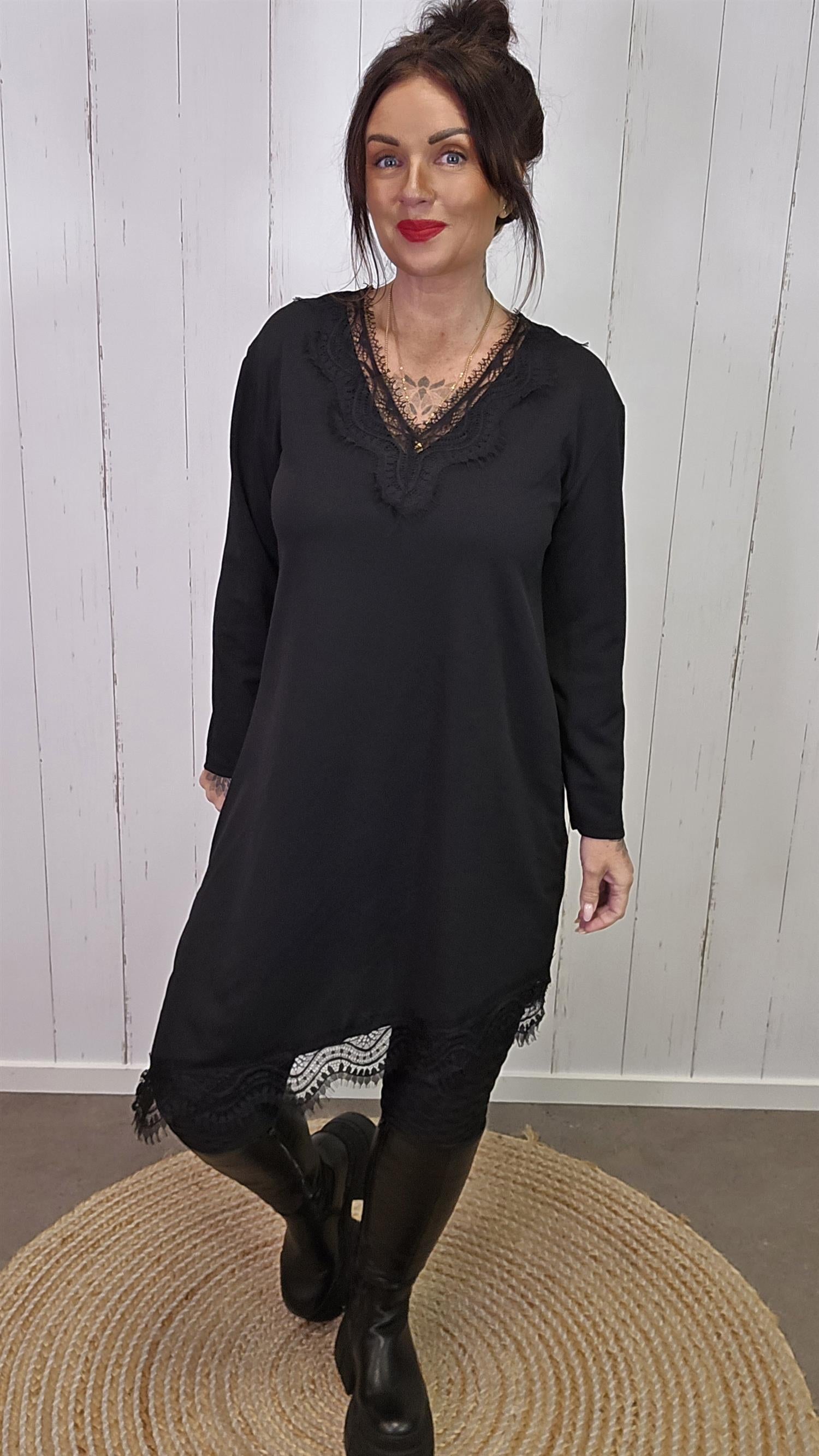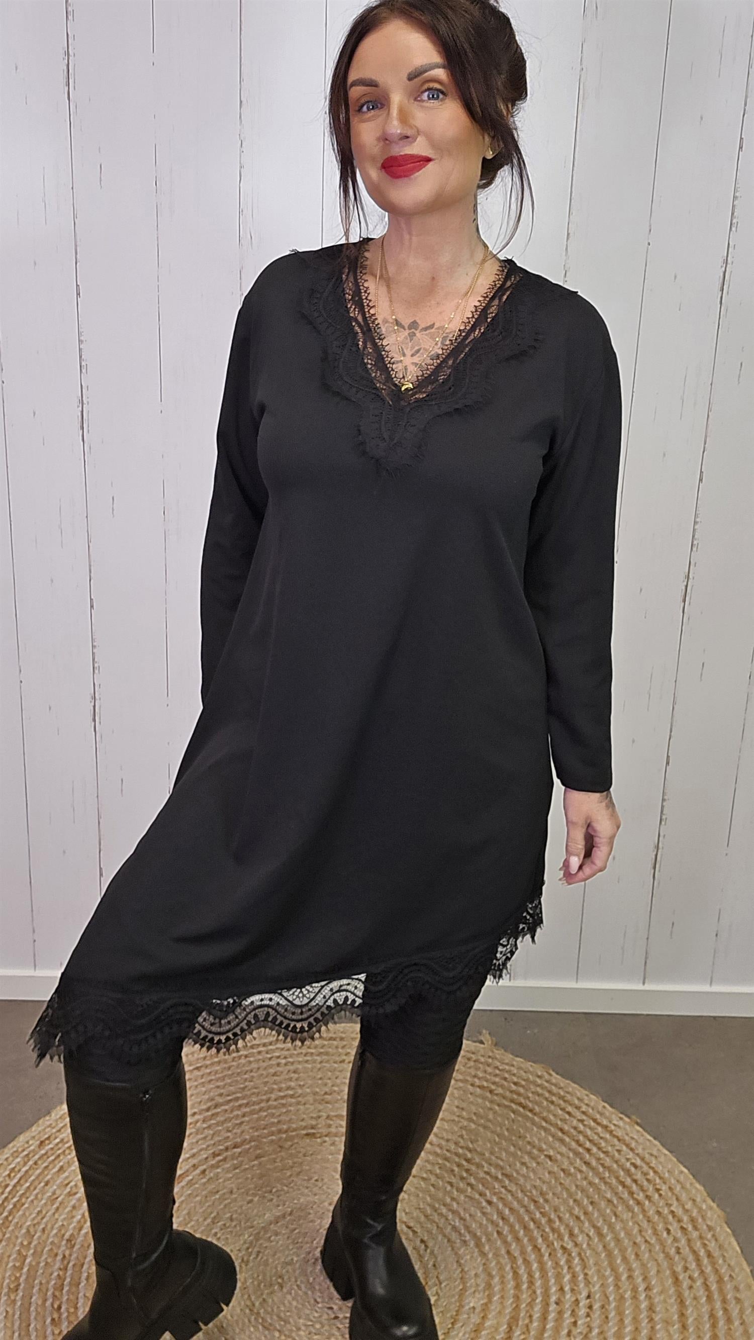 Elegant og tidløs kjole med lange ermer og vakre blondedetaljer i halsutringningen og langs kanten nederst. Kjolen har en myk og behagelig passform med lett stretch som gjør den komfortabel å bruke hele dagen. De fine blondene gir et feminint og eksklusivt uttrykk, perfekt både til hverdags og til fest.