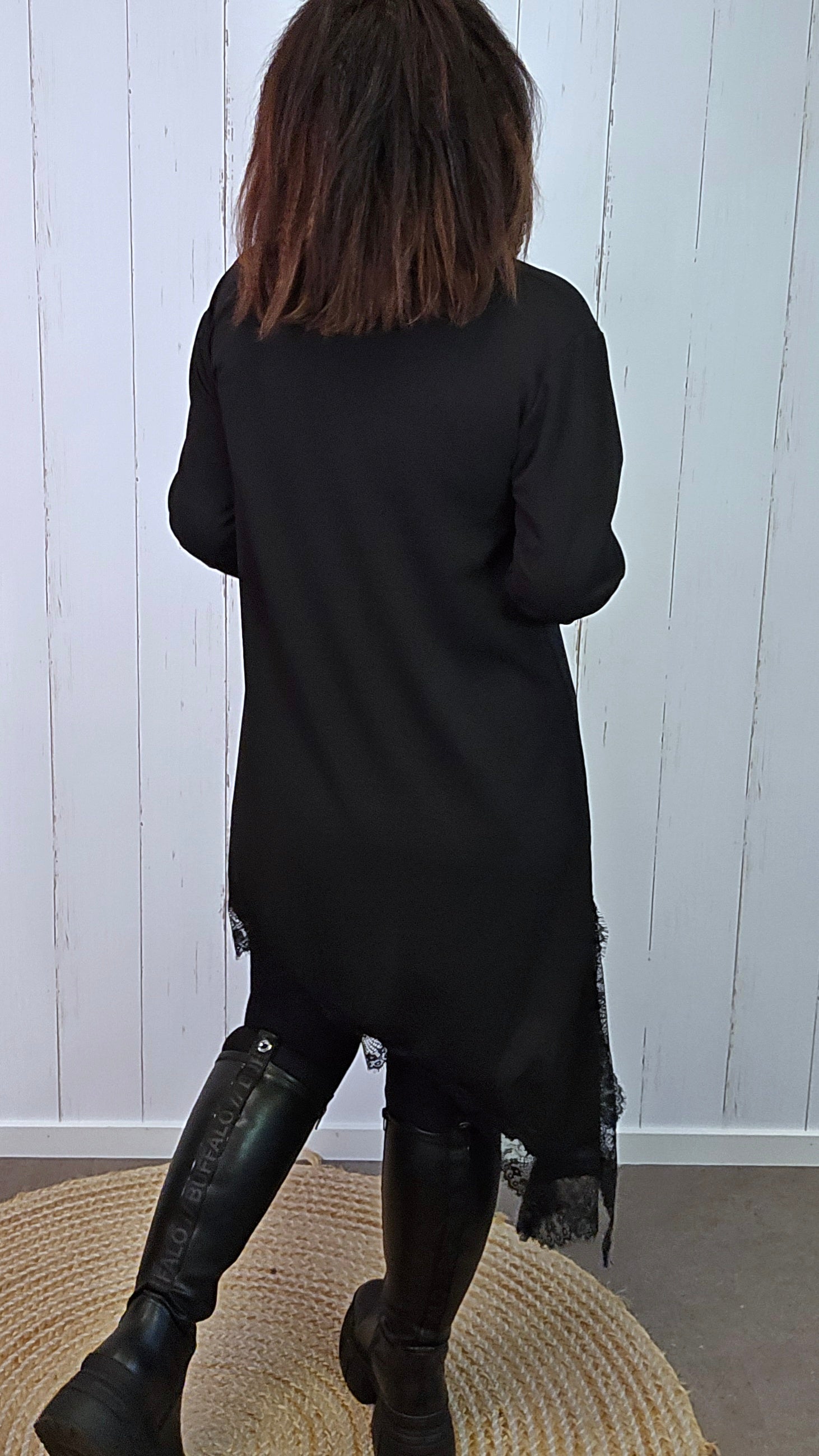 En elegant og moderne kjole med asymmetrisk kant nederst og vakre blondedetaljer langs kanten. Kjolen har rund hals, lange ermer og et mykt, stretchy stoff som gjør den behagelig å bruke. Den unike skrå fasongen gir et spennende uttrykk og et flatterende fall.