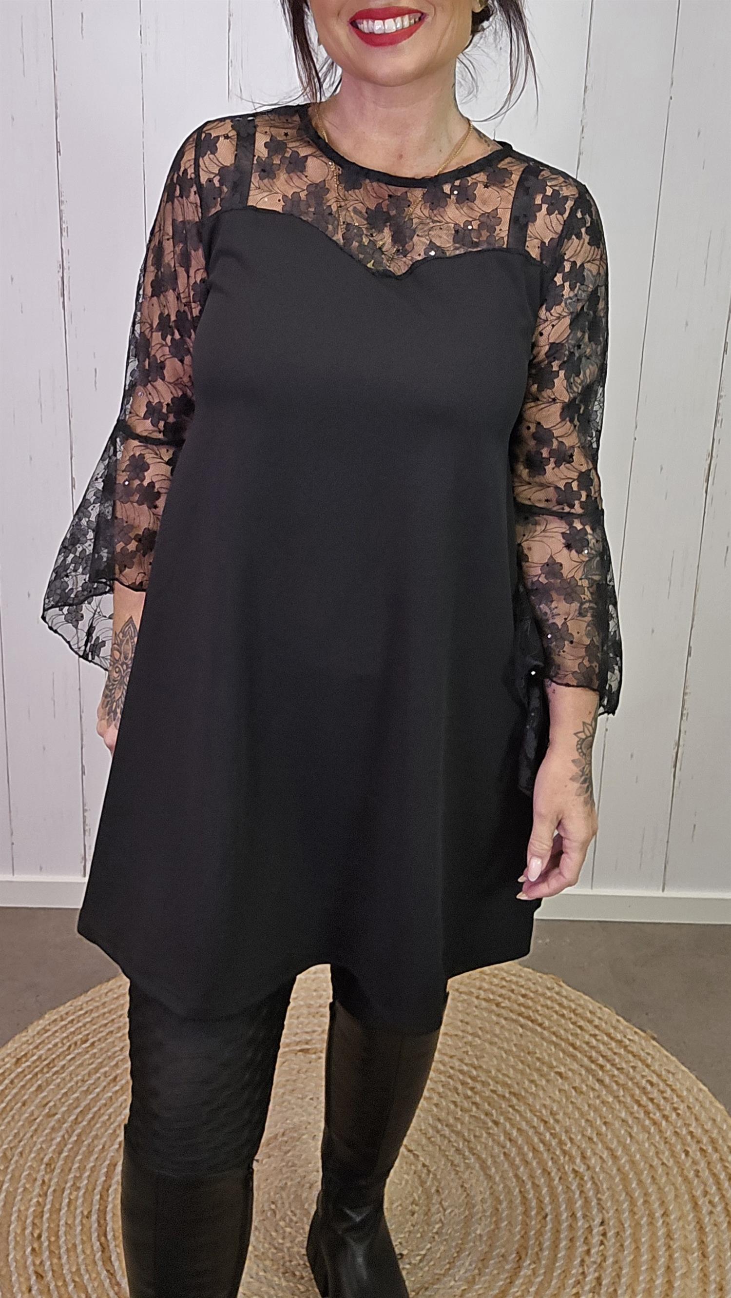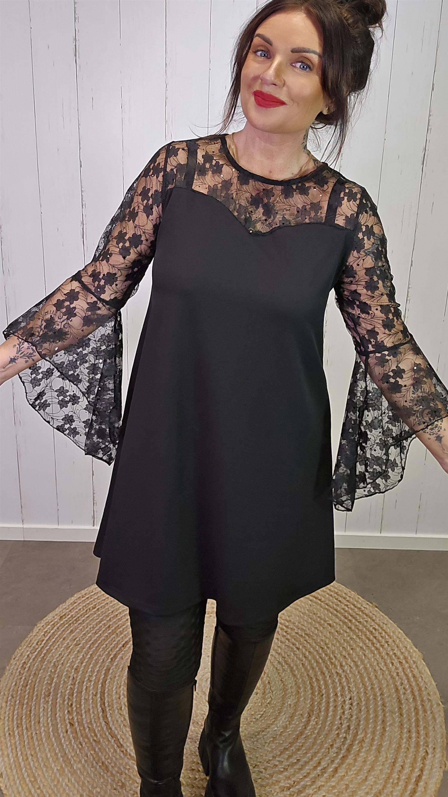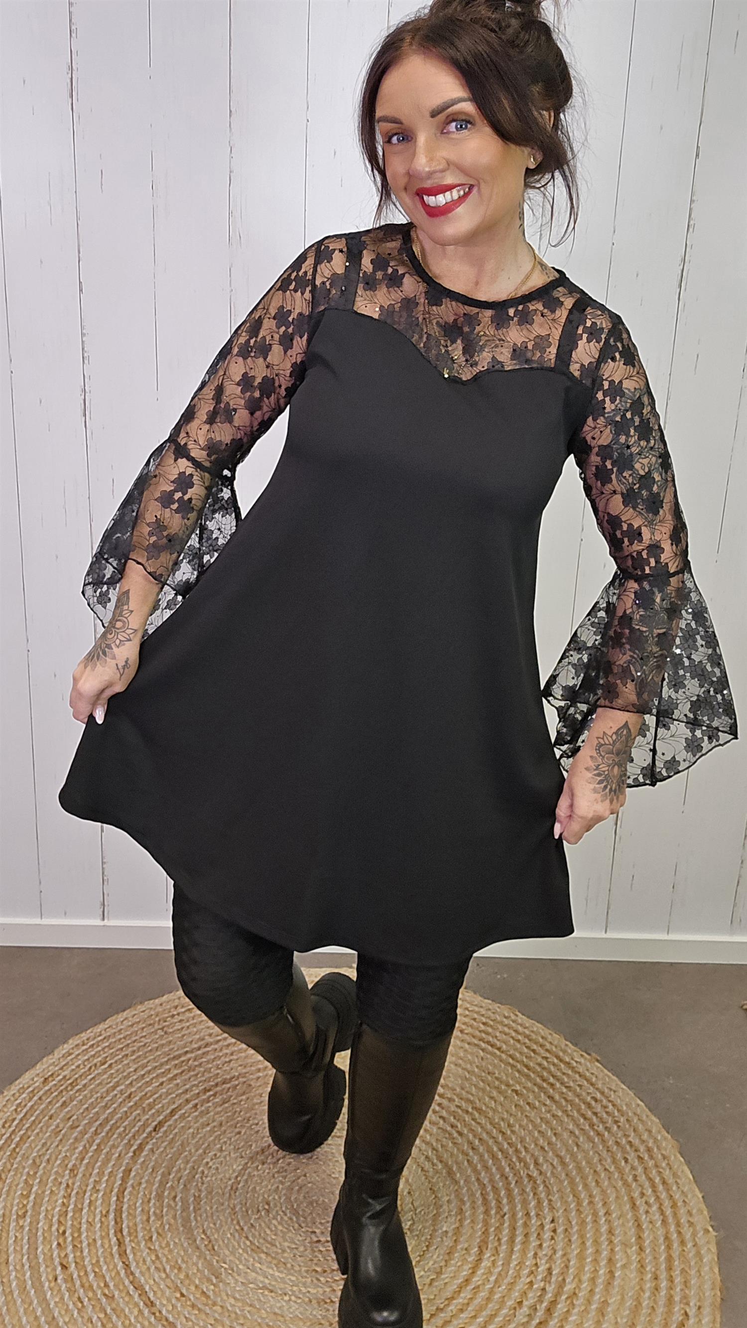En nydelig blondekjole med gjennomsiktig blondestoff øverst og på ermene. Den har vide, lekre trompetermer som gir et elegant og luftig uttrykk. Blonden har små stjerner og sirkler vevd inn i blomstermønsteret – en ekstra vakker detalj som gjør denne kjolen helt spesiell. Passformen er rett og behagelig med lett stretch i stoffet.
