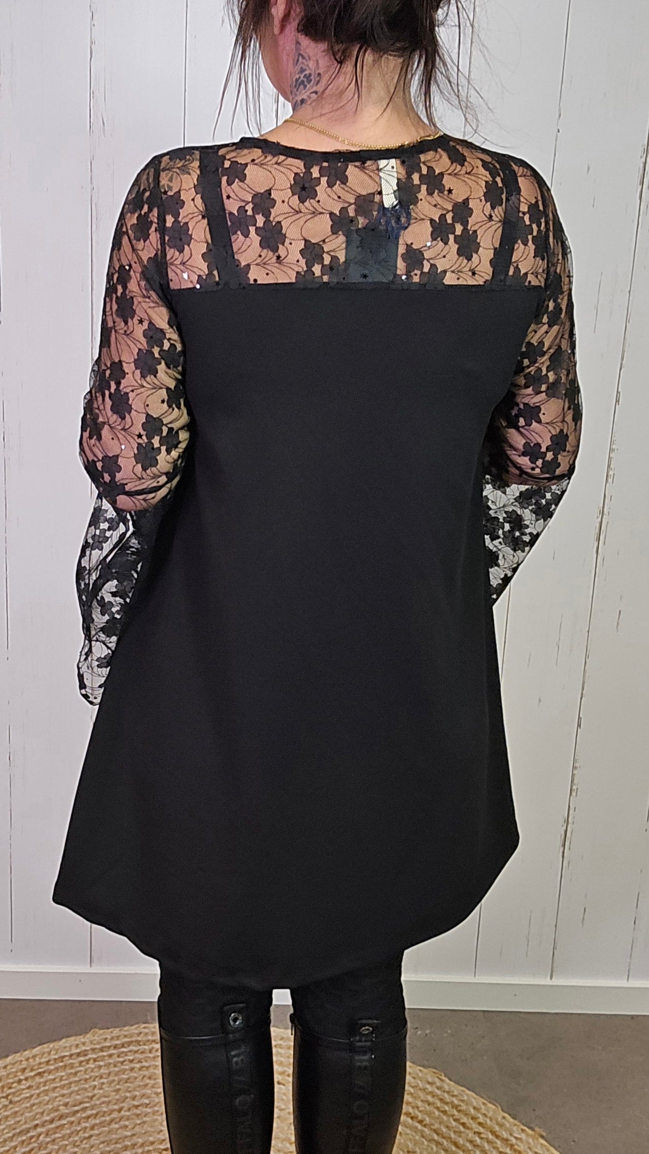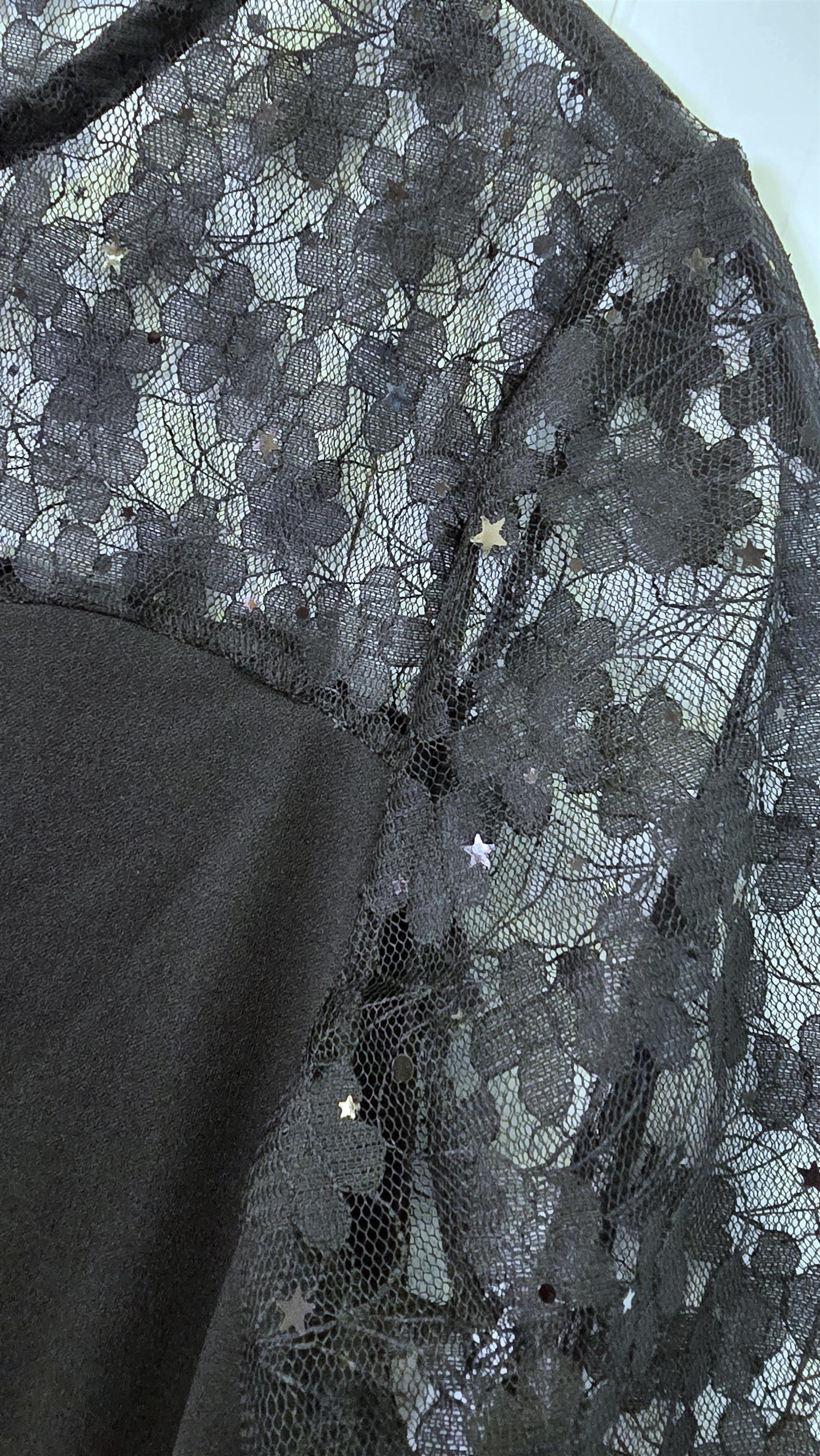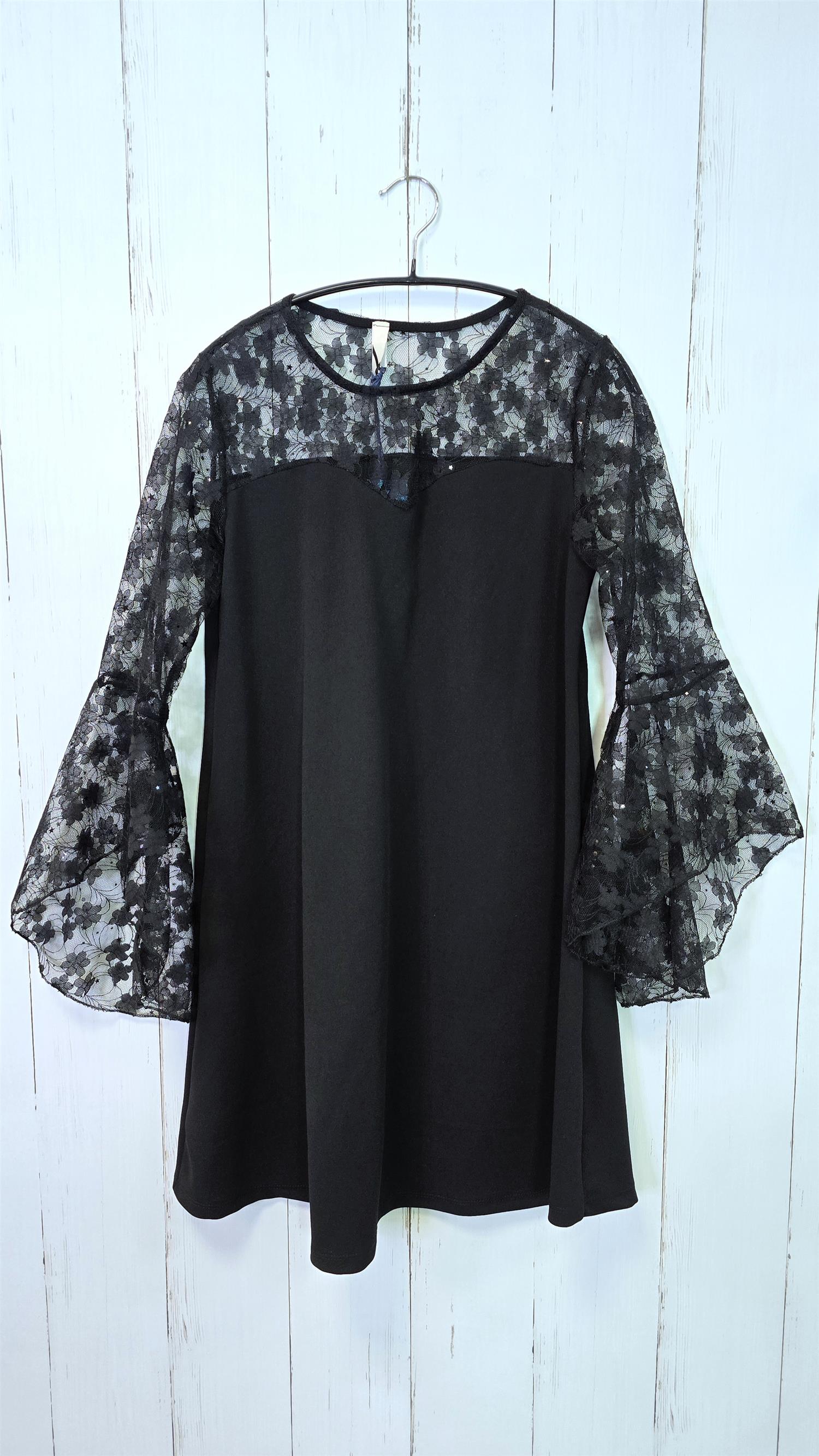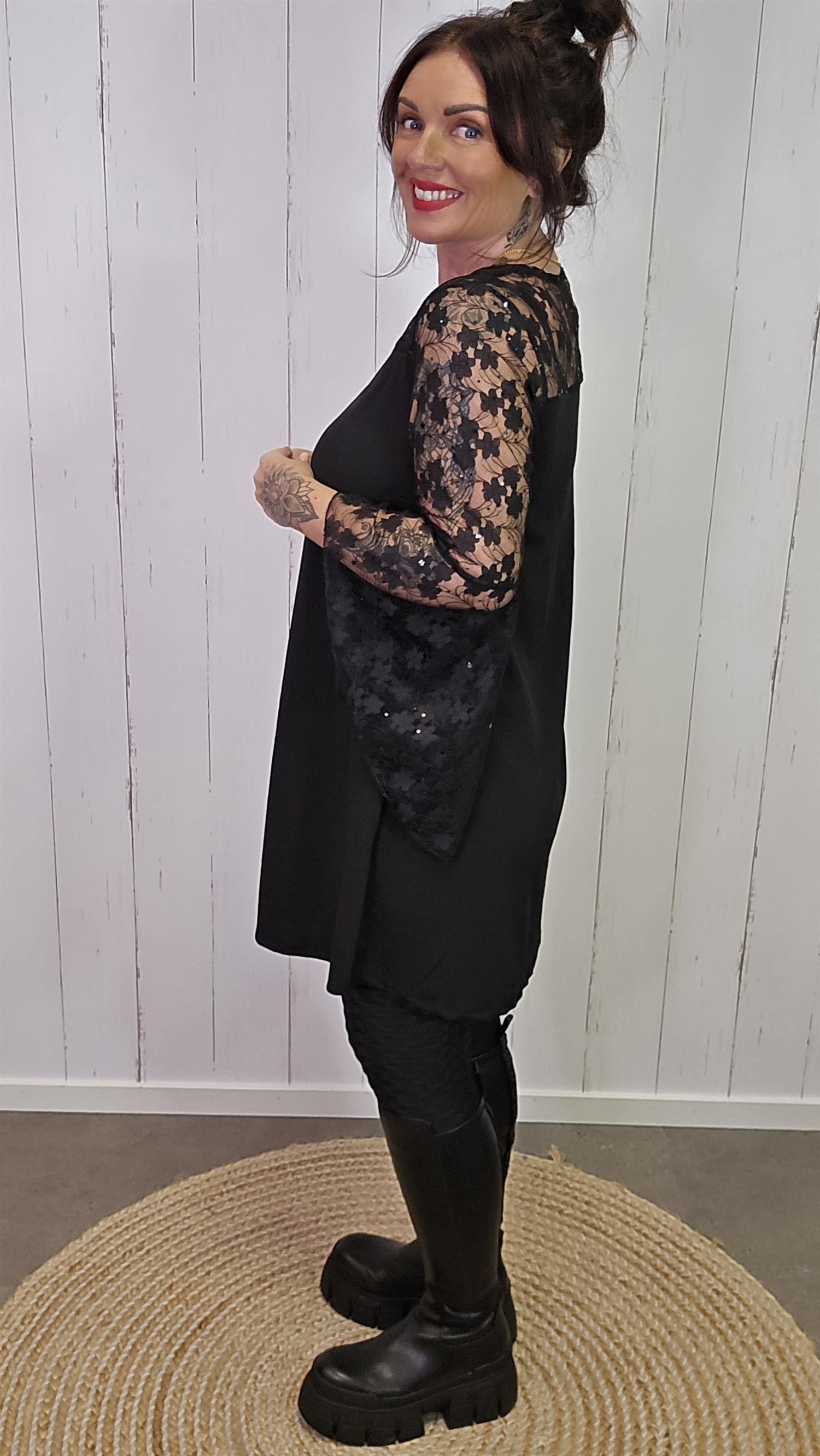 En nydelig blondekjole med gjennomsiktig blondestoff øverst og på ermene. Den har vide, lekre trompetermer som gir et elegant og luftig uttrykk. Blonden har små stjerner og sirkler vevd inn i blomstermønsteret – en ekstra vakker detalj som gjør denne kjolen helt spesiell. Passformen er rett og behagelig med lett stretch i stoffet.