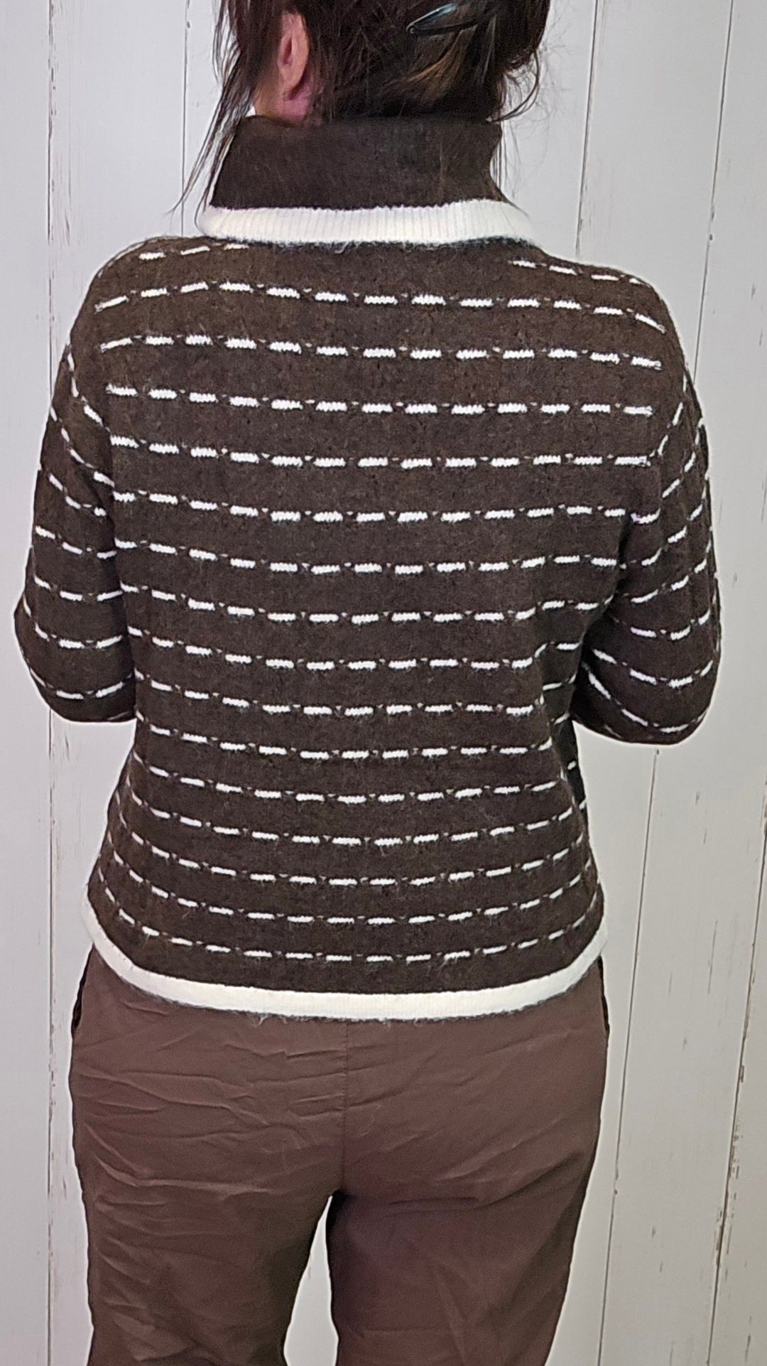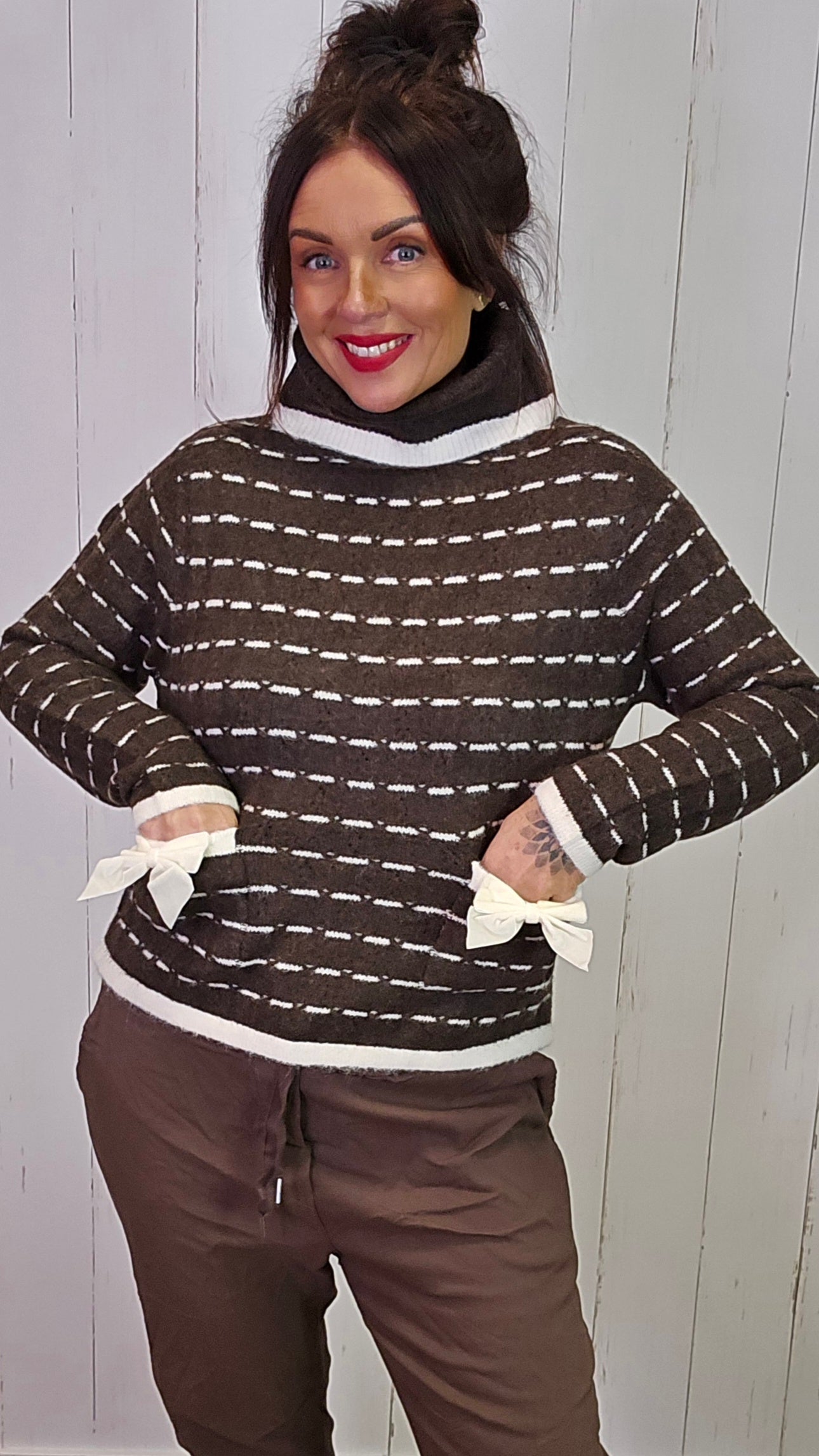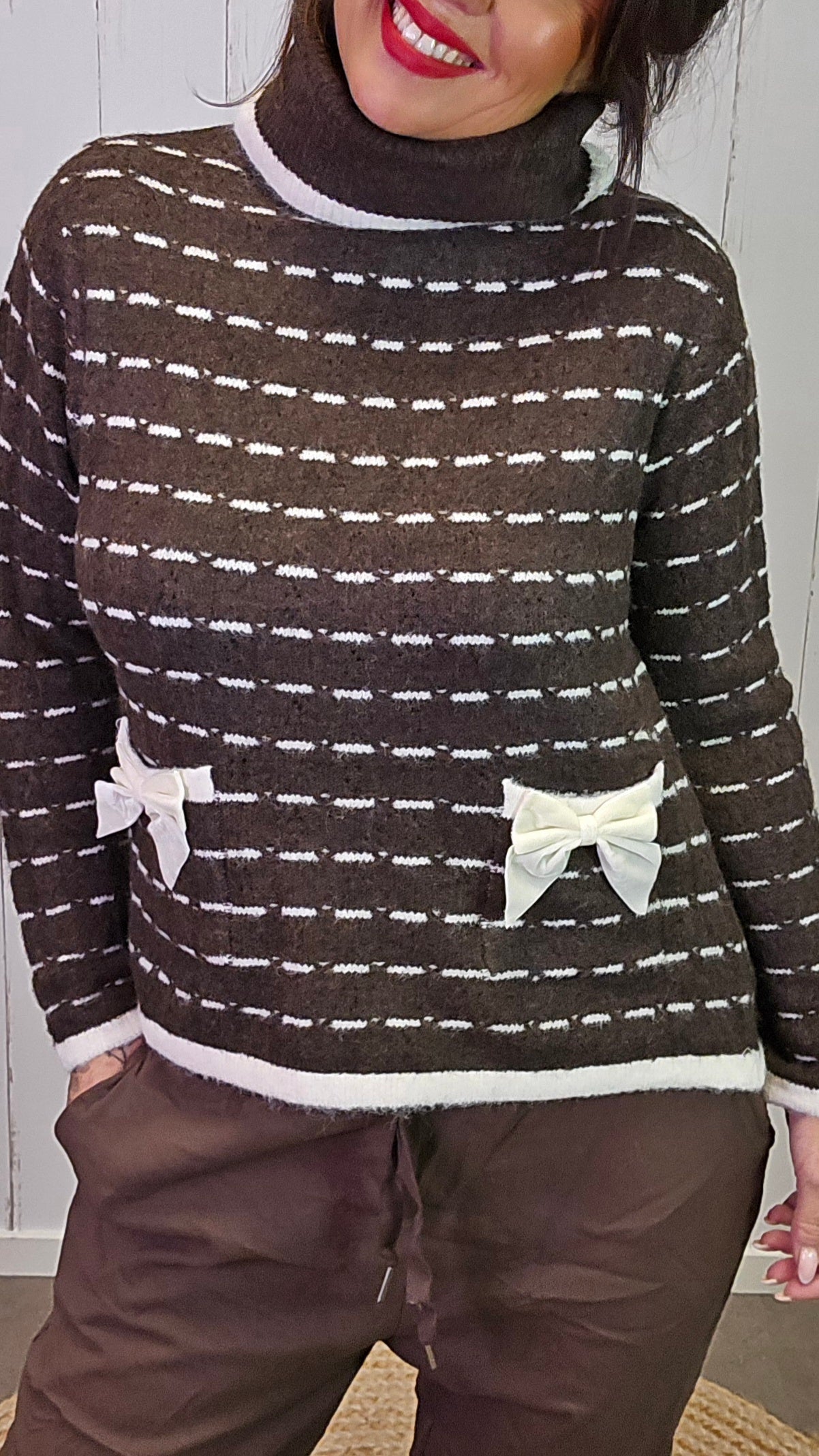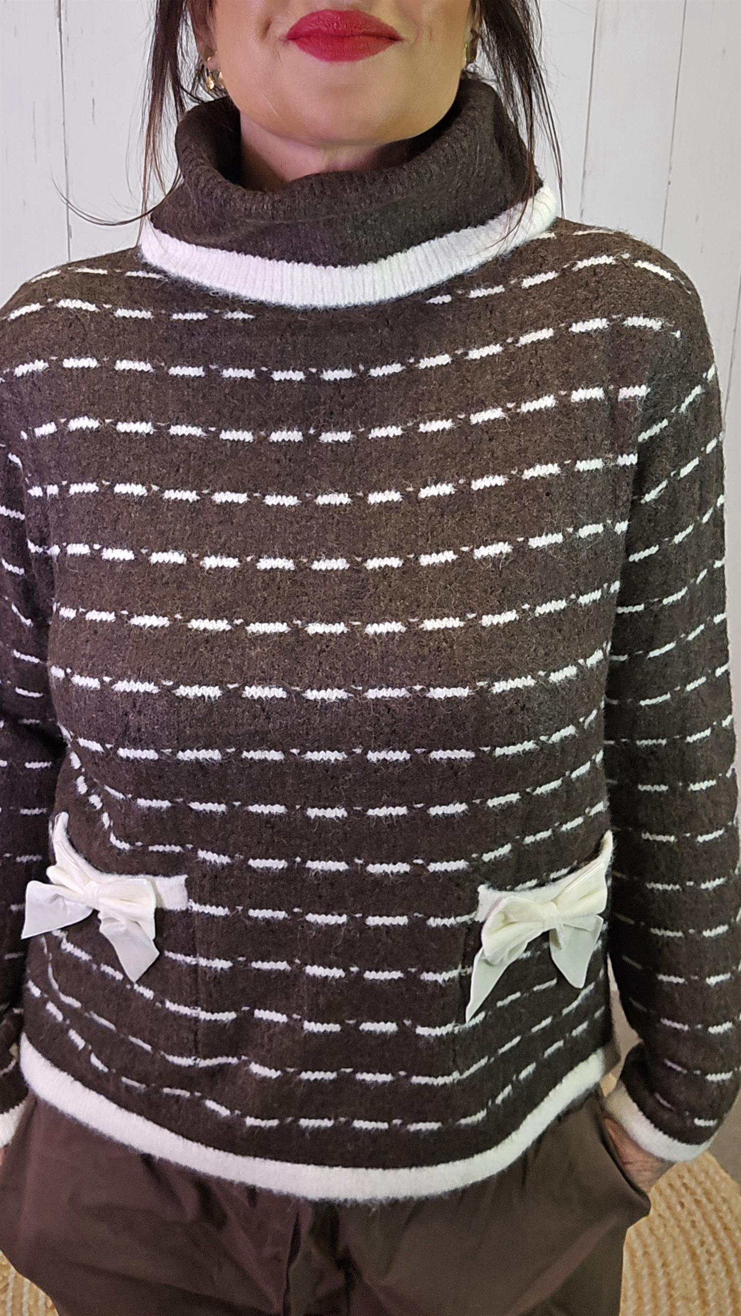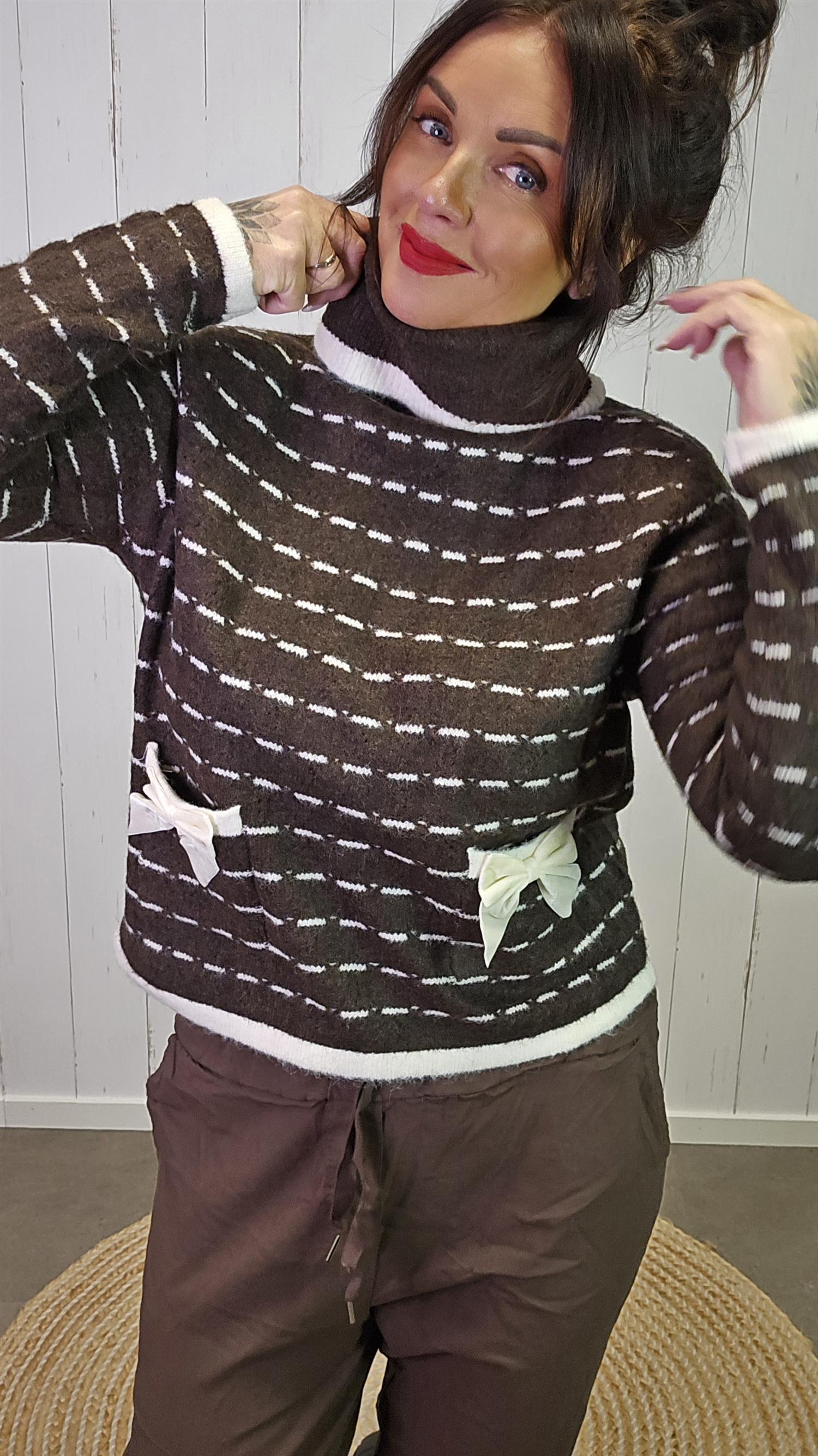 Myk og behagelig høyhalset genser med horisontale striper i brunt og hvitt. Genseren har en løs passform, dekorative sløyfer foran og små lommer bak sløyfene som gir et søtt og unikt preg. Høyhalsen har en myk, oppbrettet kant som gir ekstra komfort og varme.