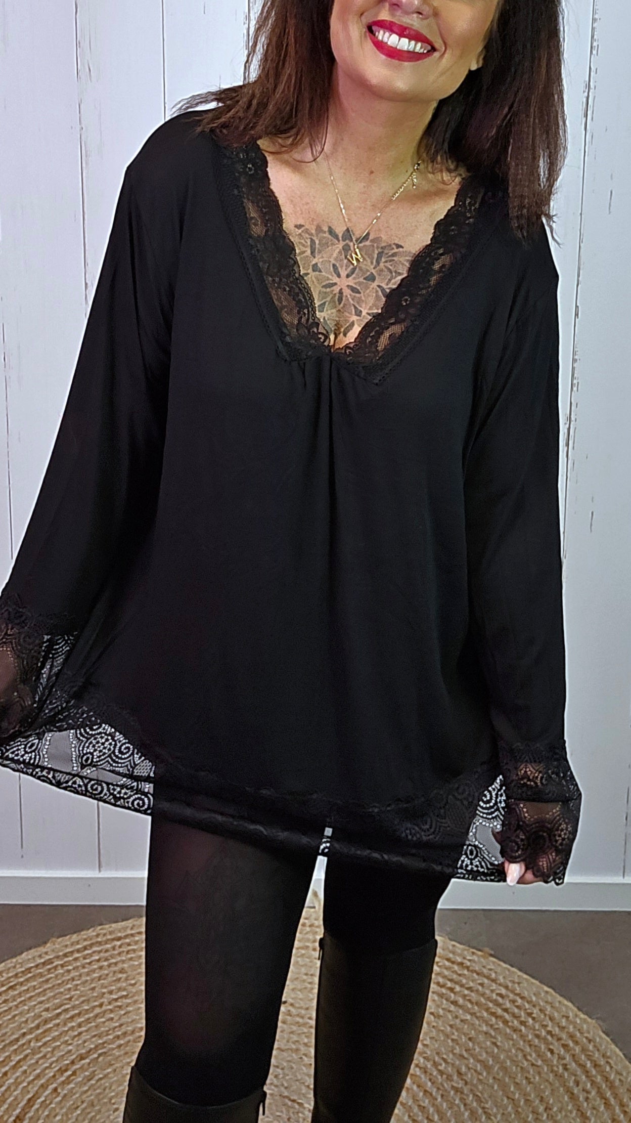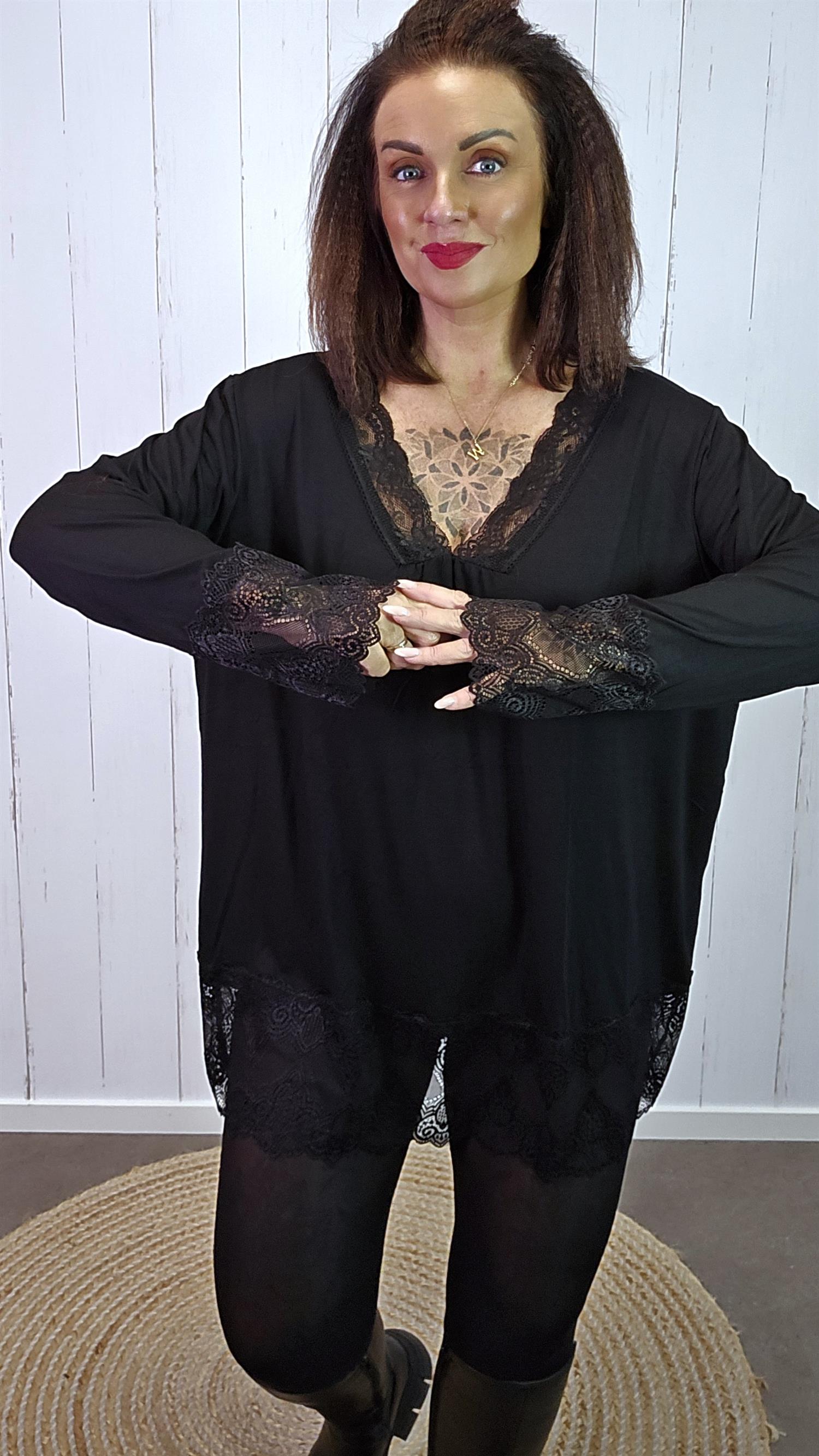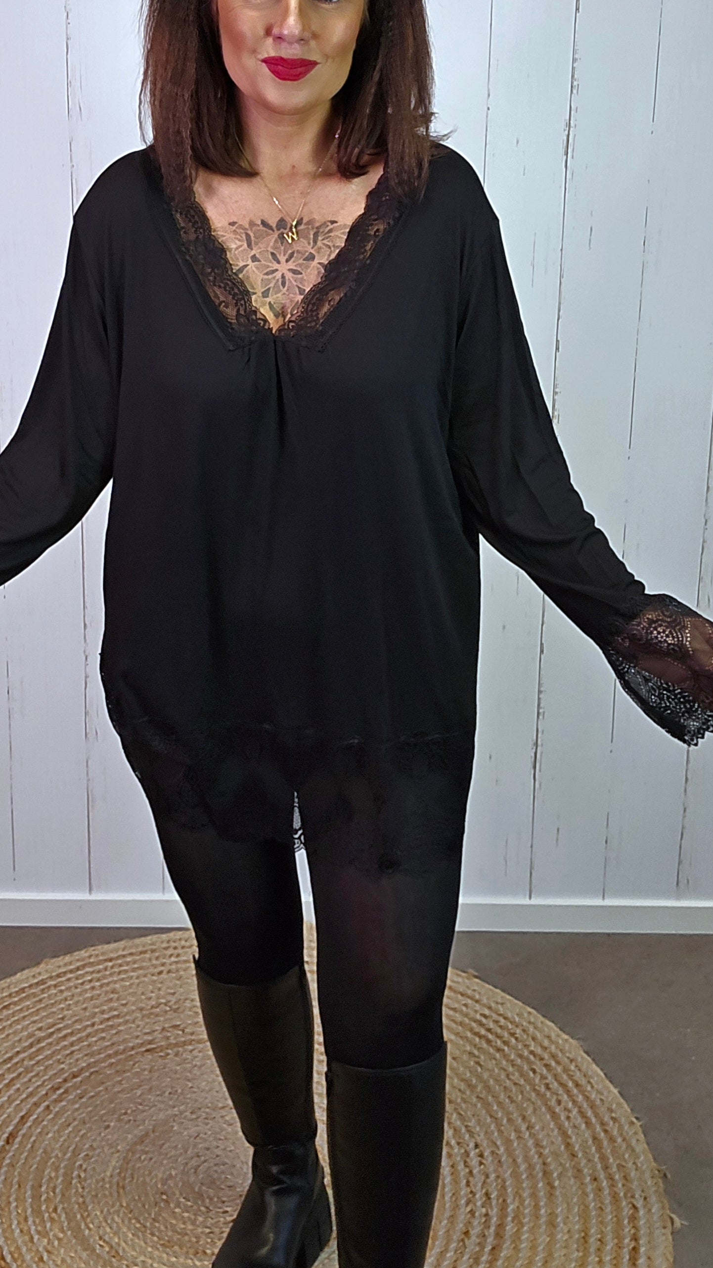 Frenchy topp er en tynn og myk topp med vakre blondedetaljer som gir et feminint og delikat uttrykk. Den har en dyp V-hals, lange ermer og et mykt fall som legger seg pent mot kroppen. Blonden nede på ermene og nederst på plagget gjør den ekstra fin både alene og som base under strikkede gensere eller jakker.