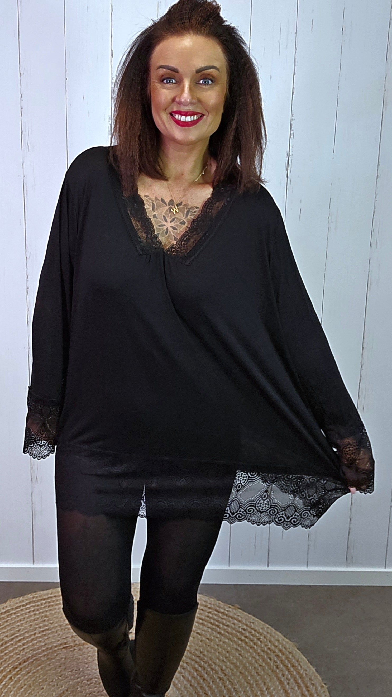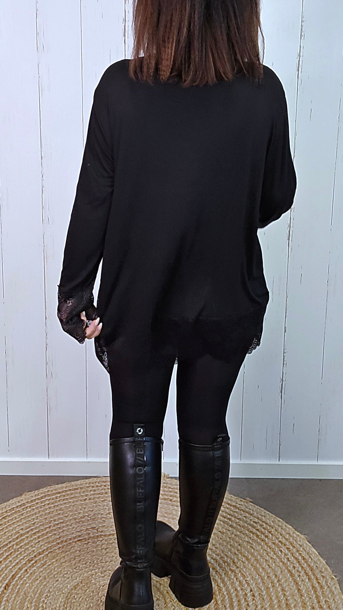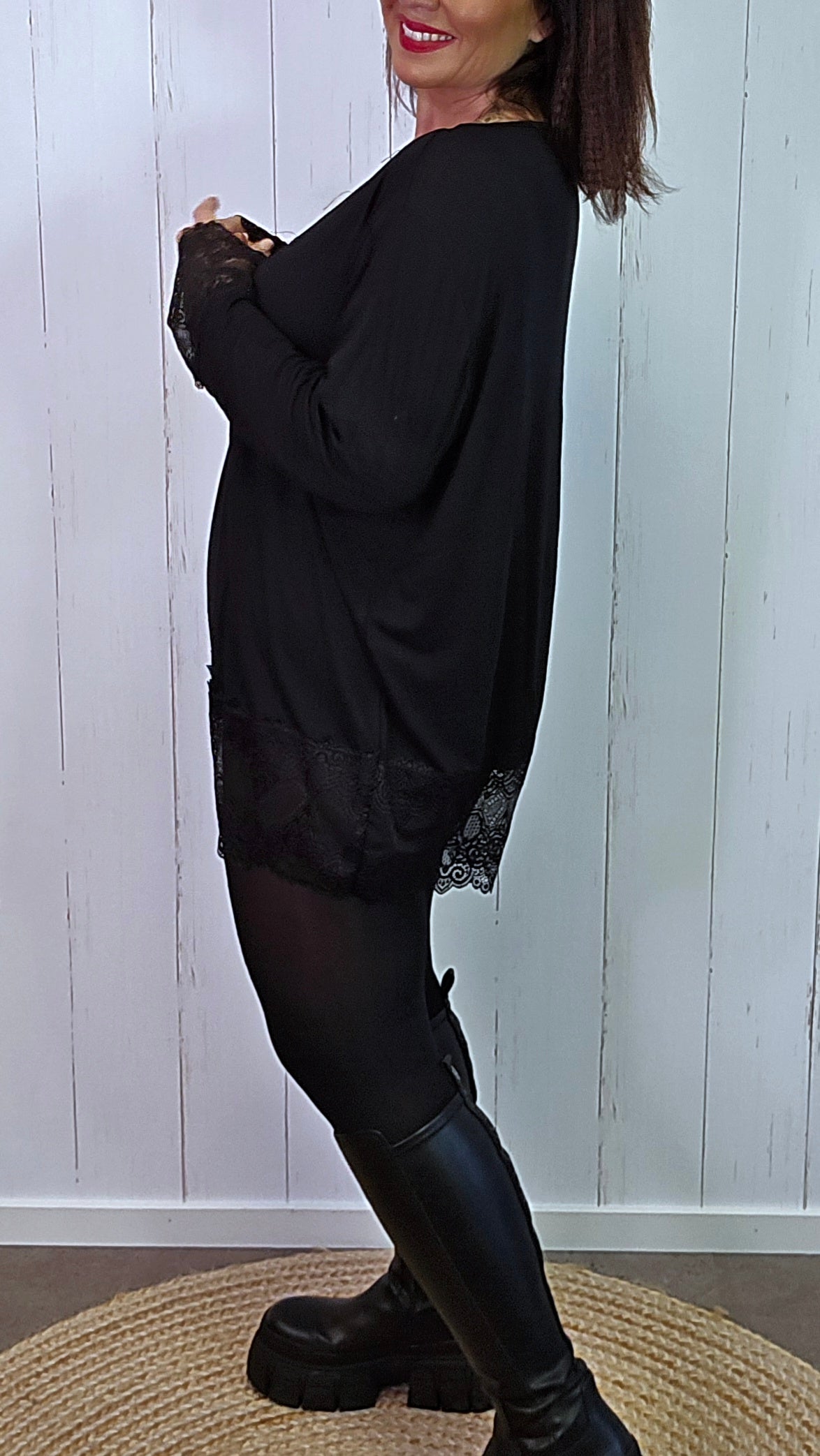 Frenchy topp er en tynn og myk topp med vakre blondedetaljer som gir et feminint og delikat uttrykk. Den har en dyp V-hals, lange ermer og et mykt fall som legger seg pent mot kroppen. Blonden nede på ermene og nederst på plagget gjør den ekstra fin både alene og som base under strikkede gensere eller jakker.