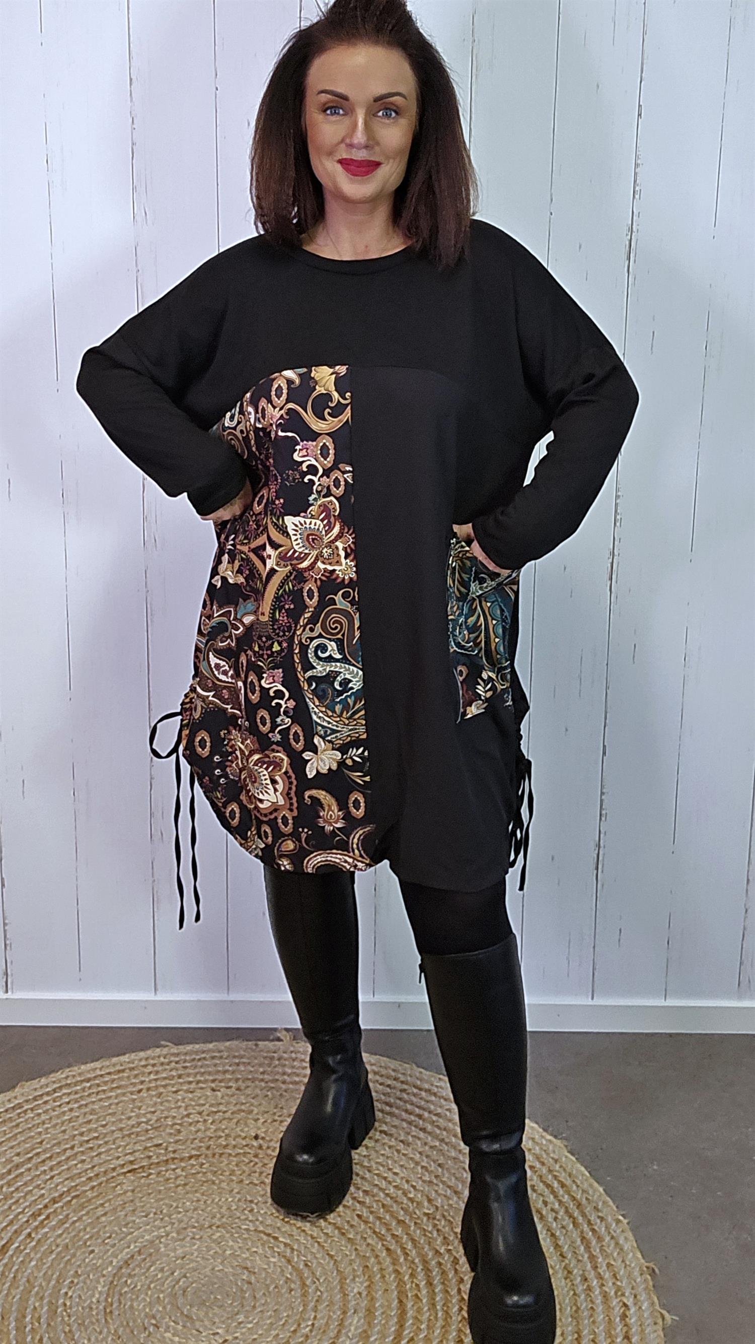 Molly kjole er en unik og stilfull modell som kombinerer komfort med et spennende design. Overdelen er ensfarget og myk, mens nederdelen har flotte mønstrede partier som gir kjolen et særpreget uttrykk. Den har lange ermer, en dekorativ glidelåslomme i front og justerbare snøringer nederst på begge sider – slik at du kan tilpasse lengden og fasongen etter ønske.