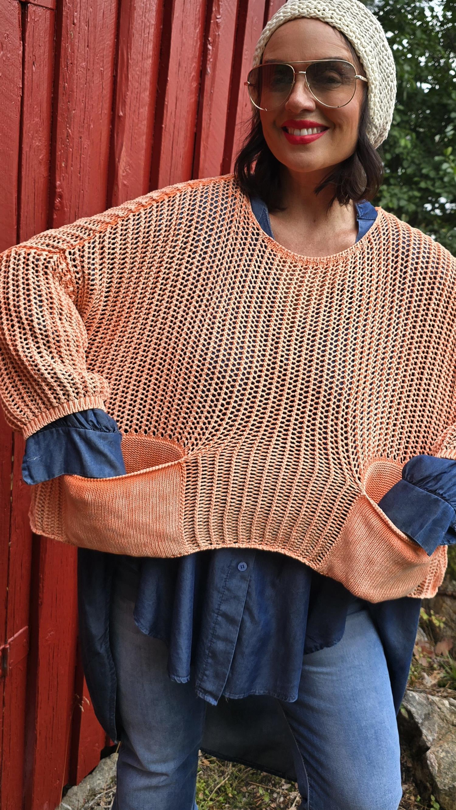 Råkul kortare genser med lommer i front. Den har vasket effekt. Vid modell.Den har rund hals och långa armar. Kanonfin med singlet eller skjorta under.
