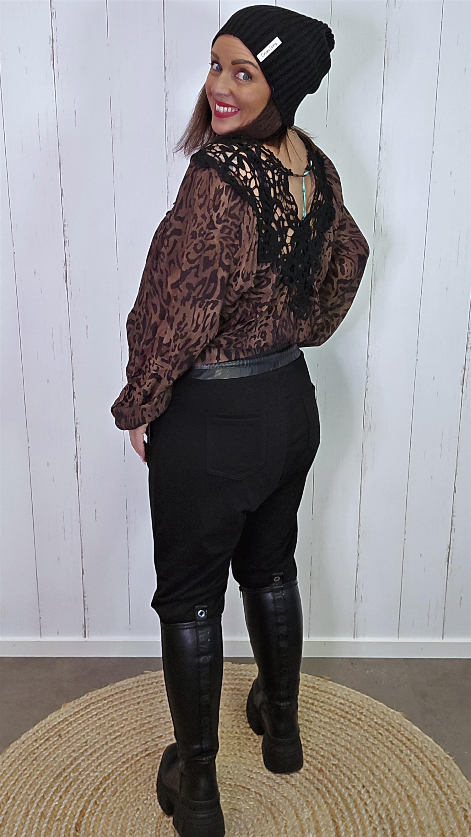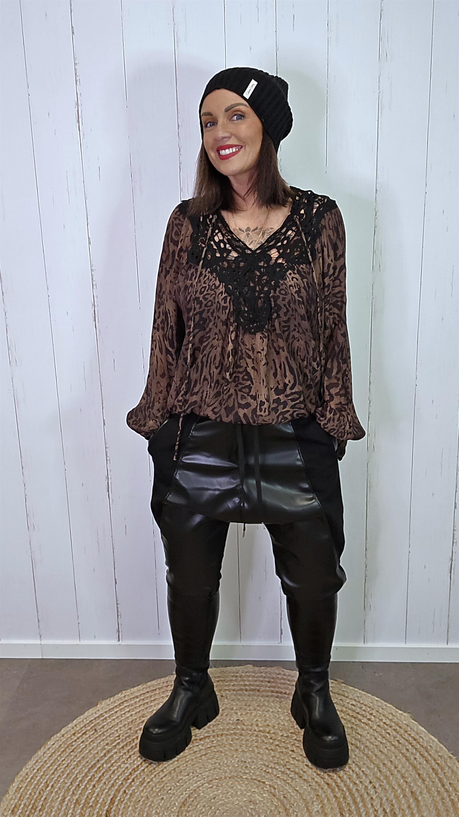 Tøff og moderne bukse med kombinasjon av myk stoffkvalitet og skinnlook-detaljer foran. Modellen har løs passform med lav skritt og strikk i midjen med snøring for optimal komfort. De bakre lommene gir en casual touch, mens kontrasten mellom de ulike teksturene gjør buksen trendy og anvendelig året rundt.