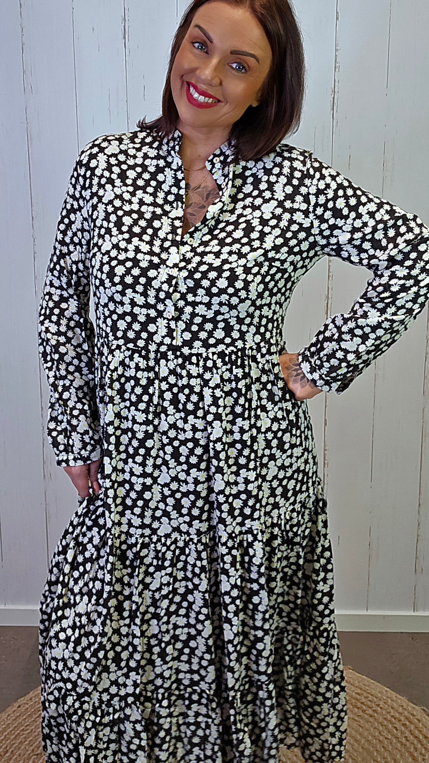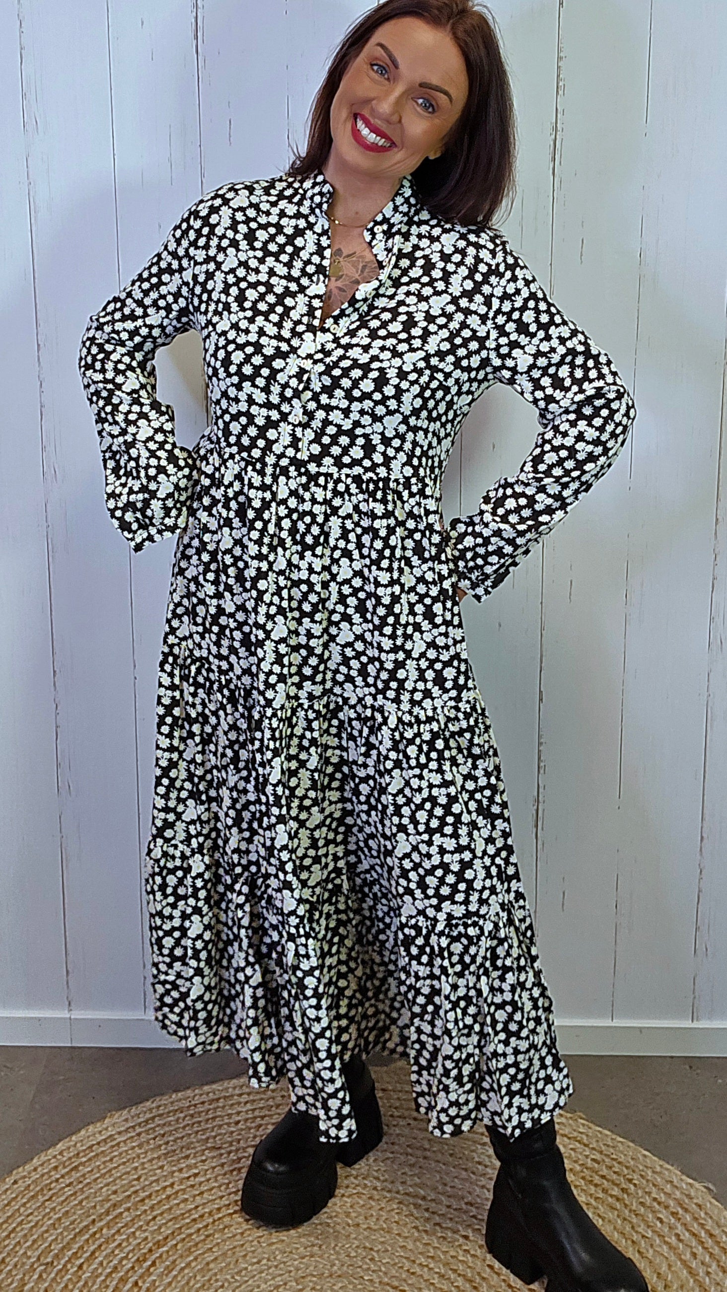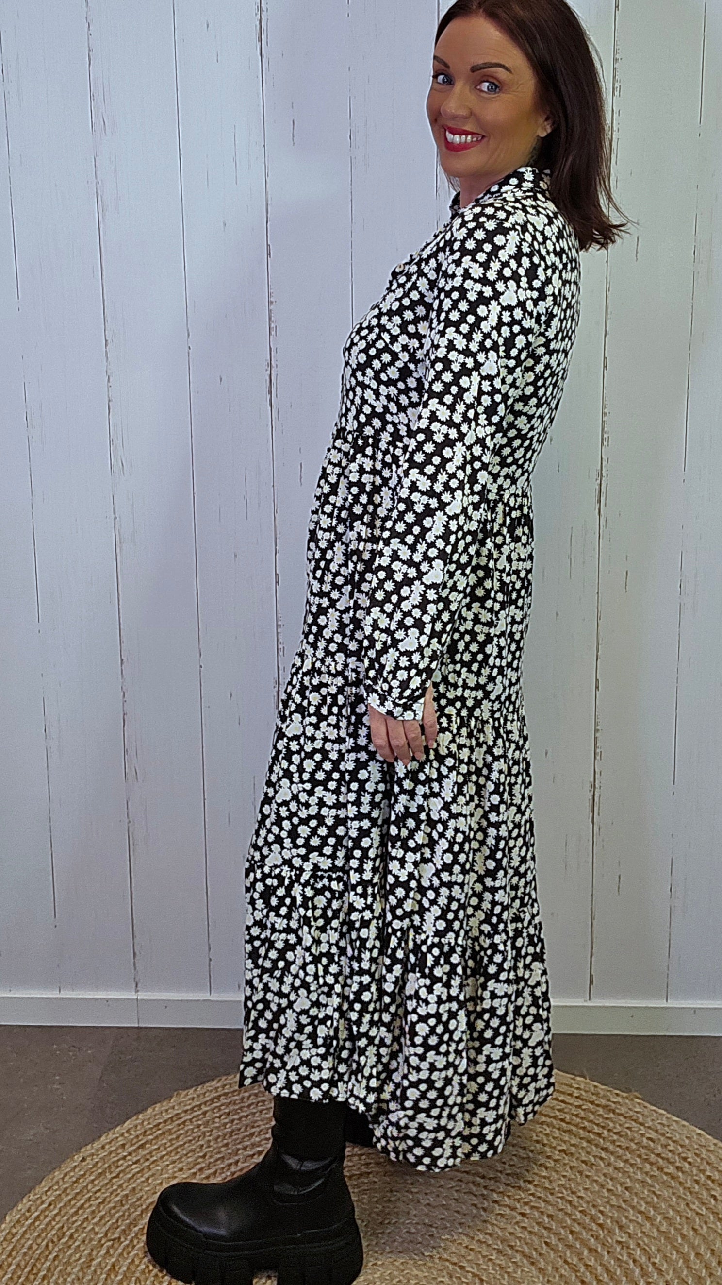 Eva kjole er en nydelig og feminin langkjole med delikat blomsterprint i hvitt og gult mot sort bunn. Den har knappestolpe foran, lange ermer med mansjett og lett vaffelstrikk i livet som gir en flatterende passform. Kjolen har et luftig fall og et klassisk snitt som gjør den både komfortabel og elegant til hverdags og fest.