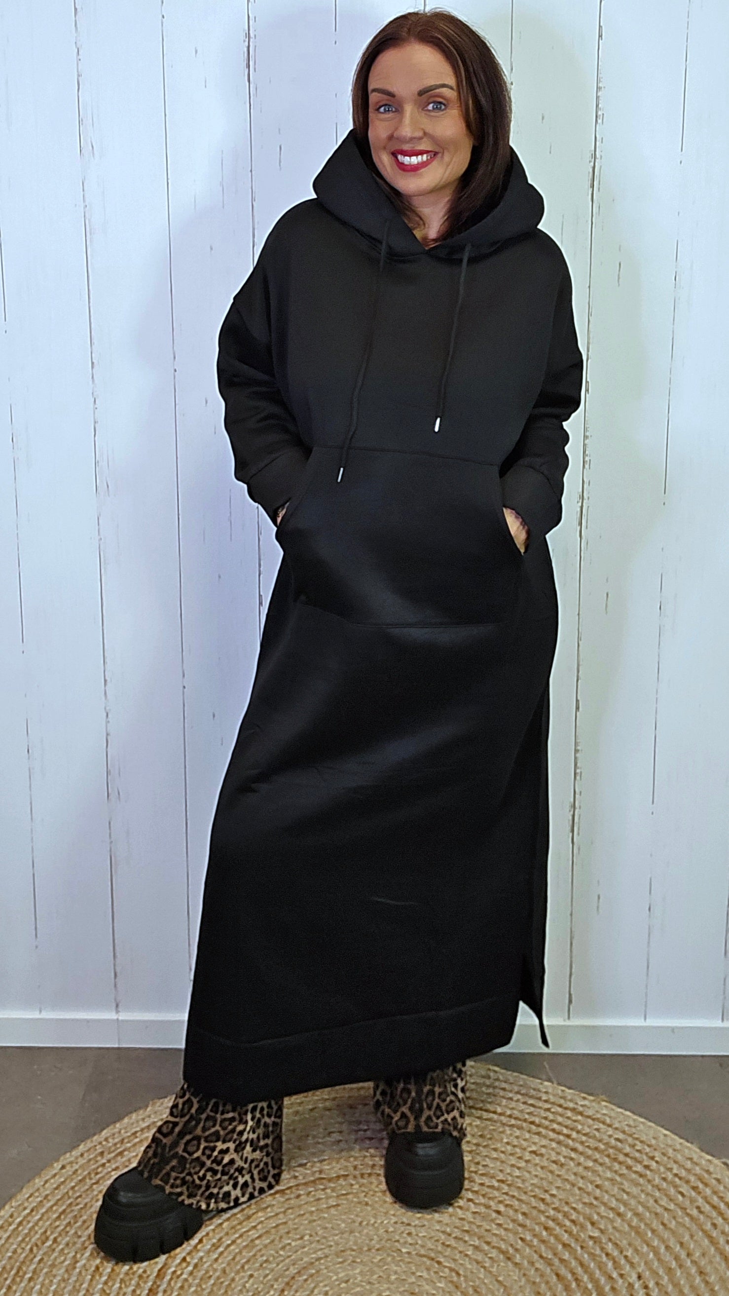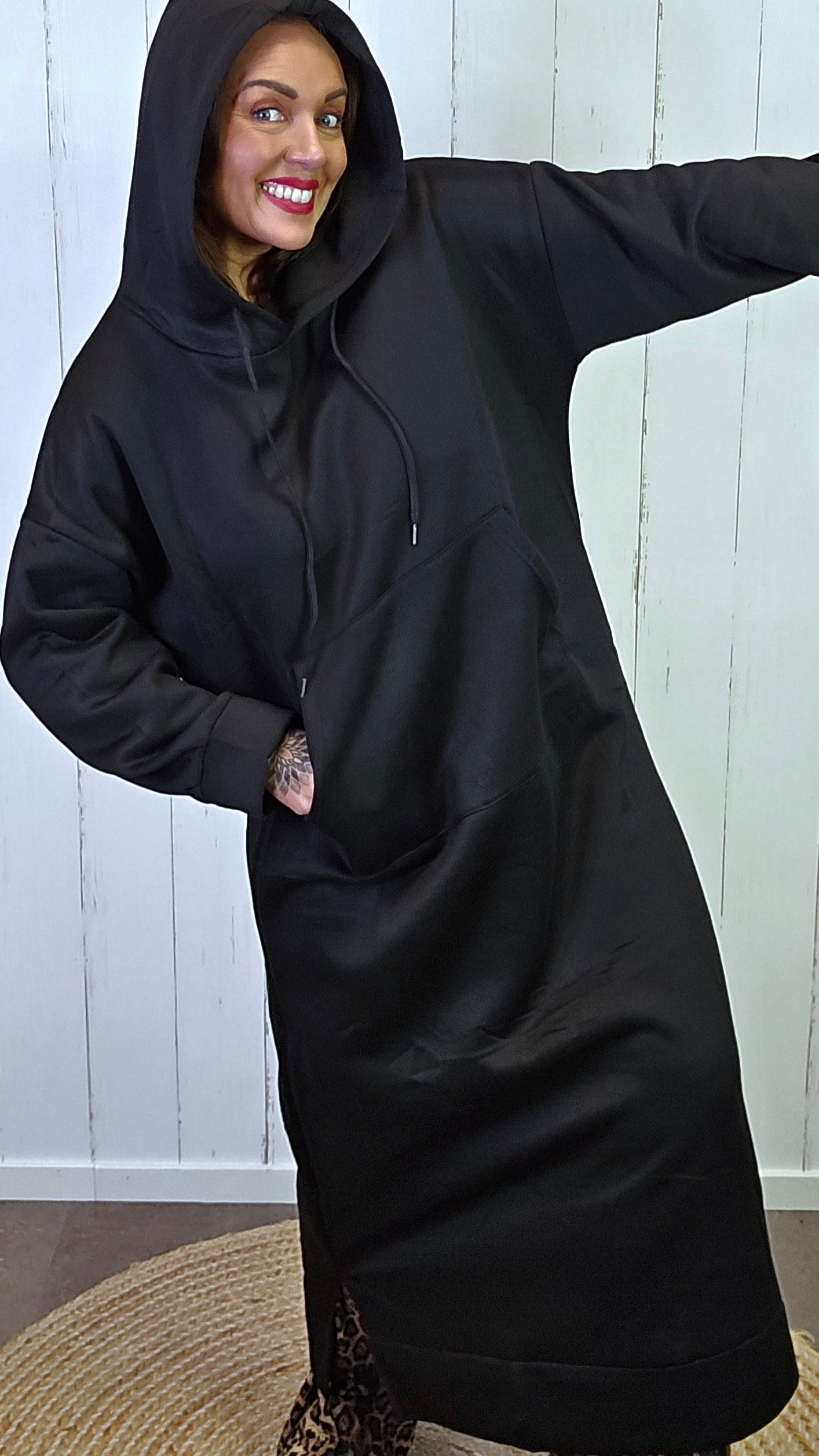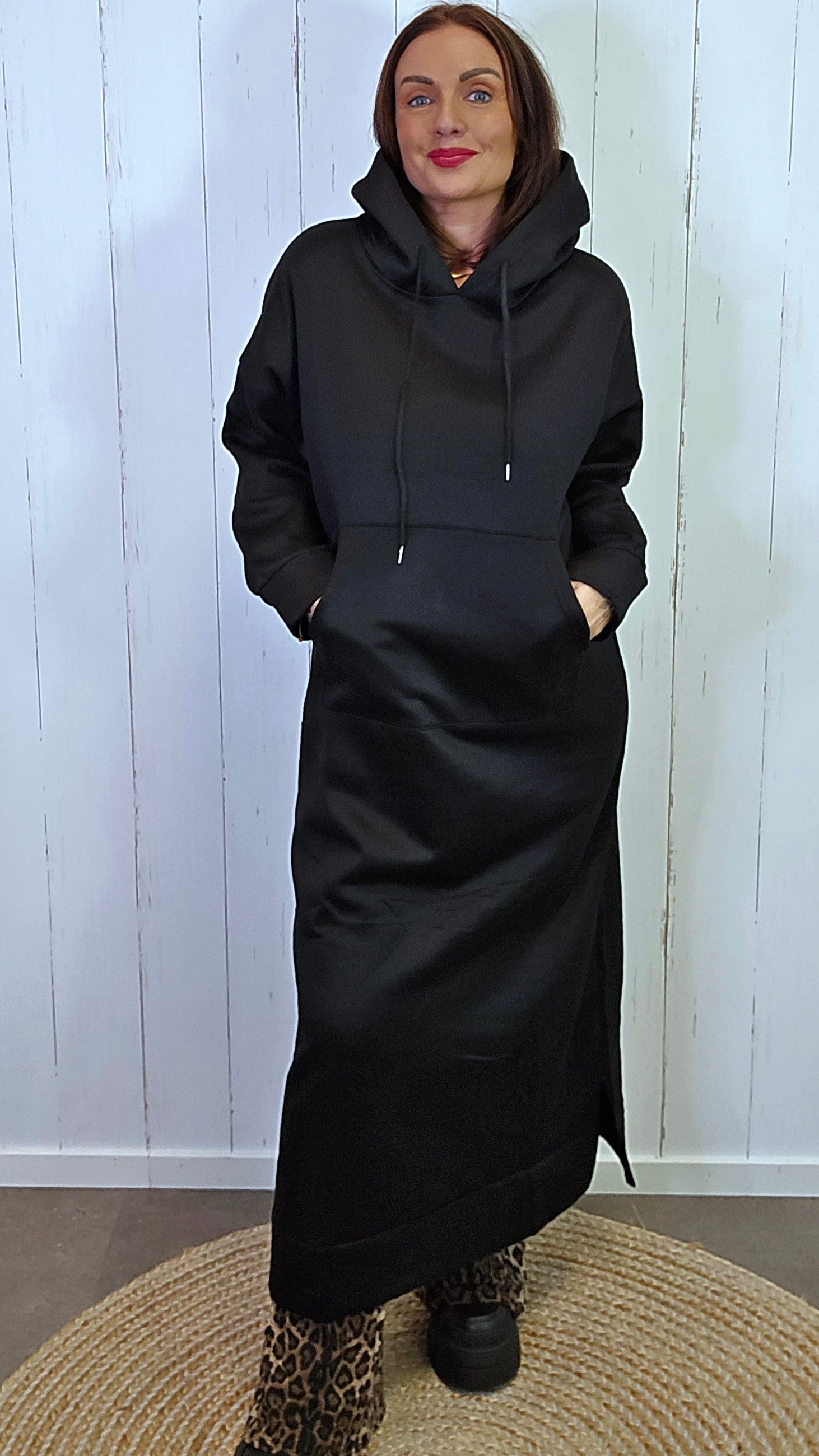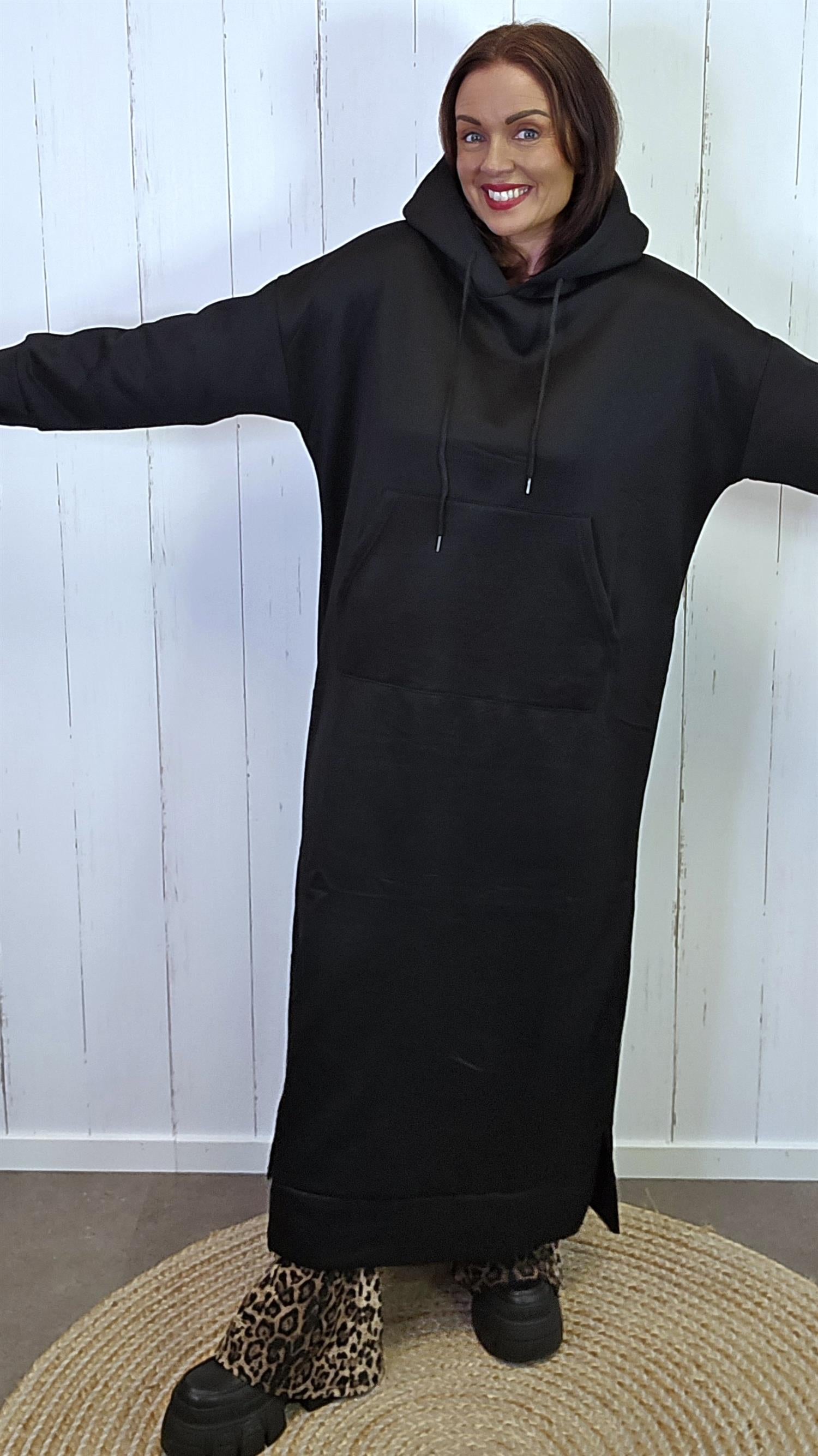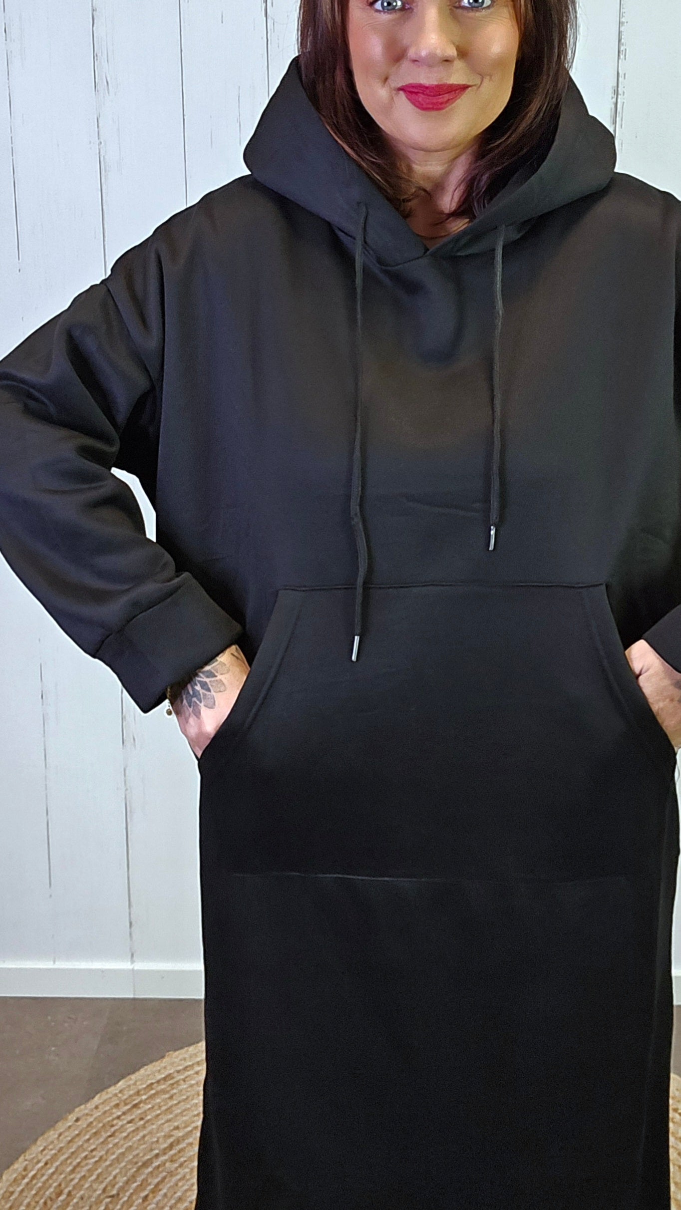 Lina kjole kombinerer komfort og stil i ett og samme plagg. Den har en løs, avslappet passform med hette, snøring og kengurulomme i front som gir den et sporty og moderne uttrykk. Kjolen har lange ermer med mansjettdetaljer og splitt nederst i sidene for ekstra bevegelsesfrihet. Et perfekt valg til både hverdags og reisedager. Flossad på insiden.
