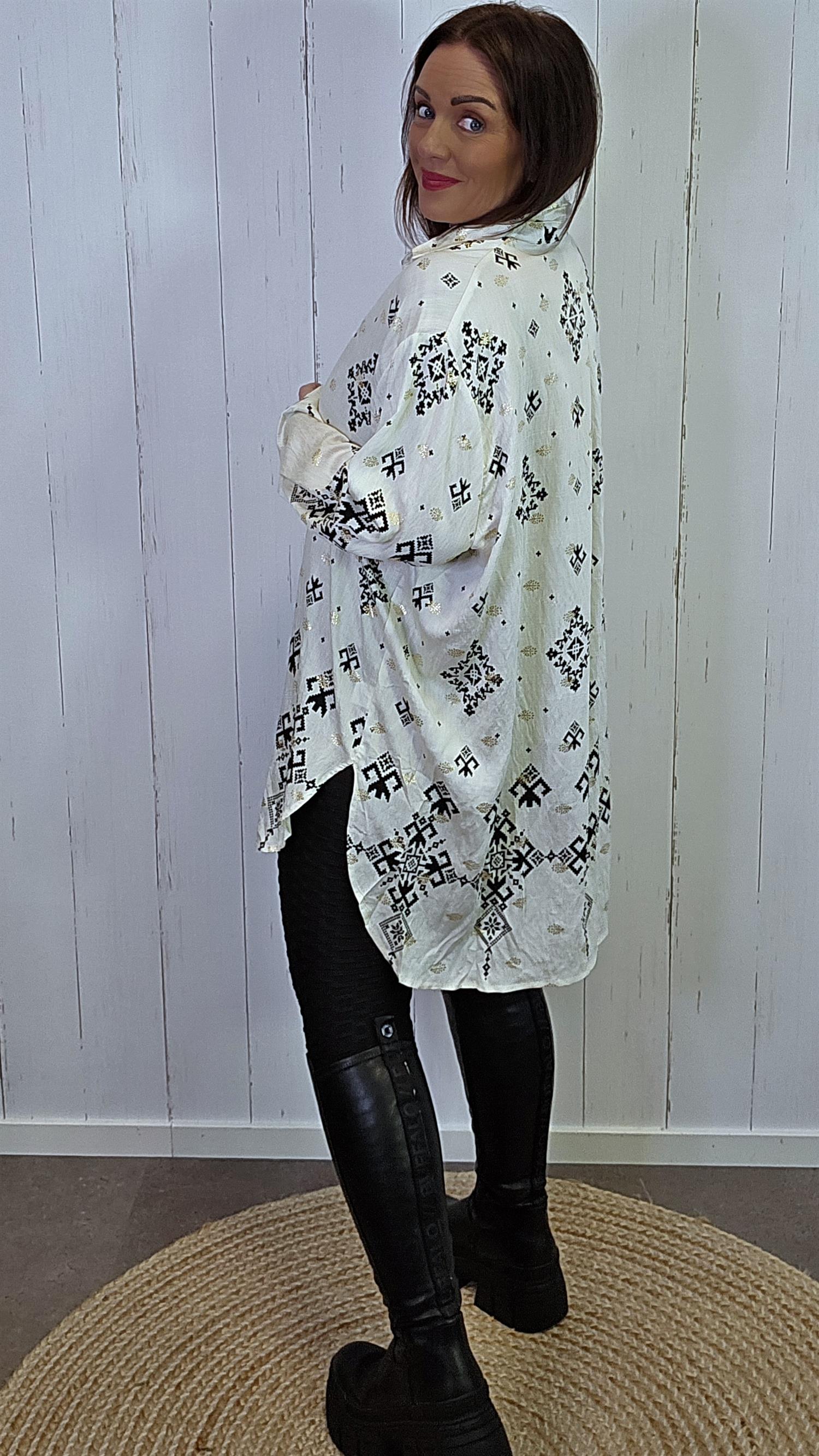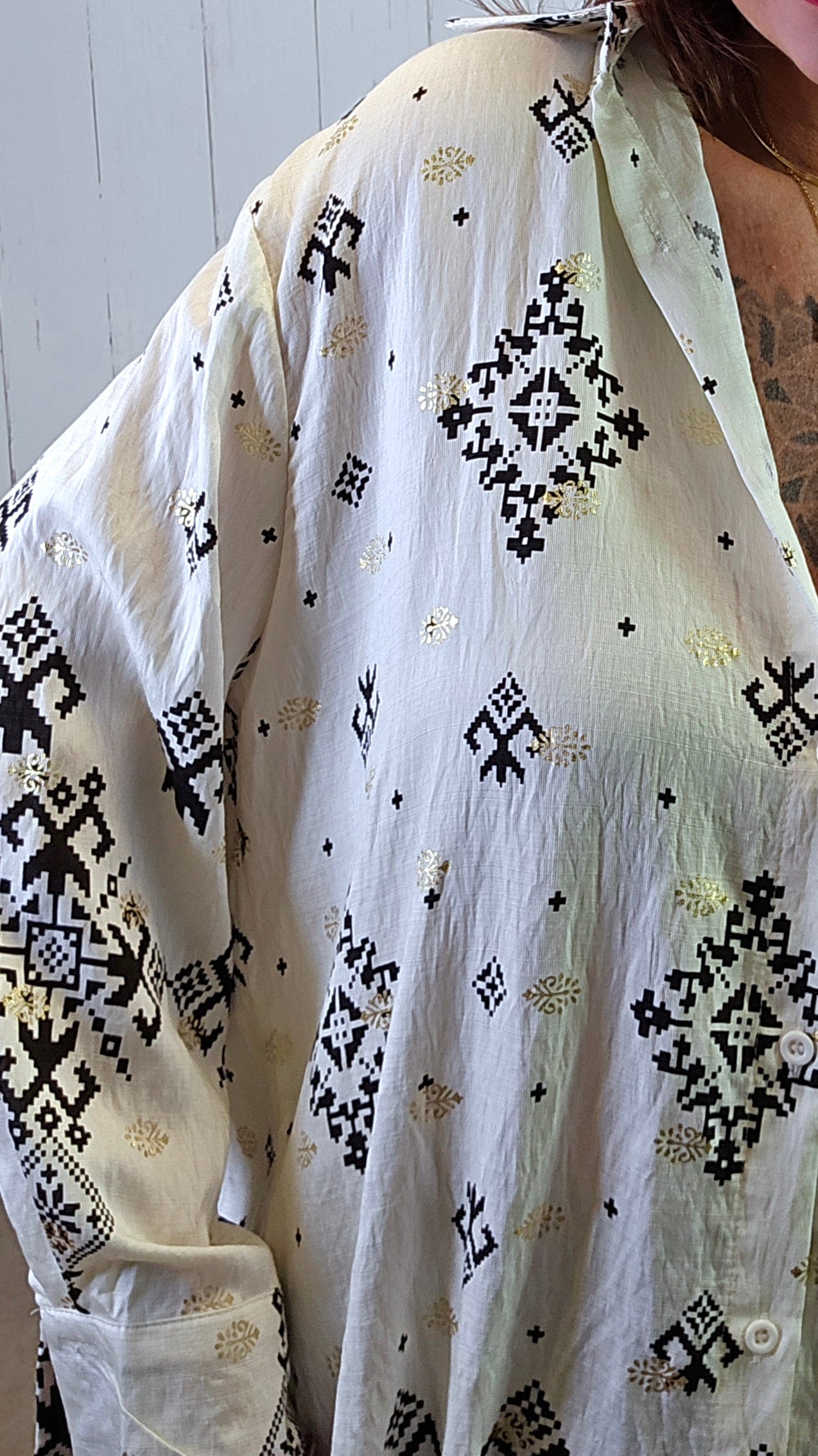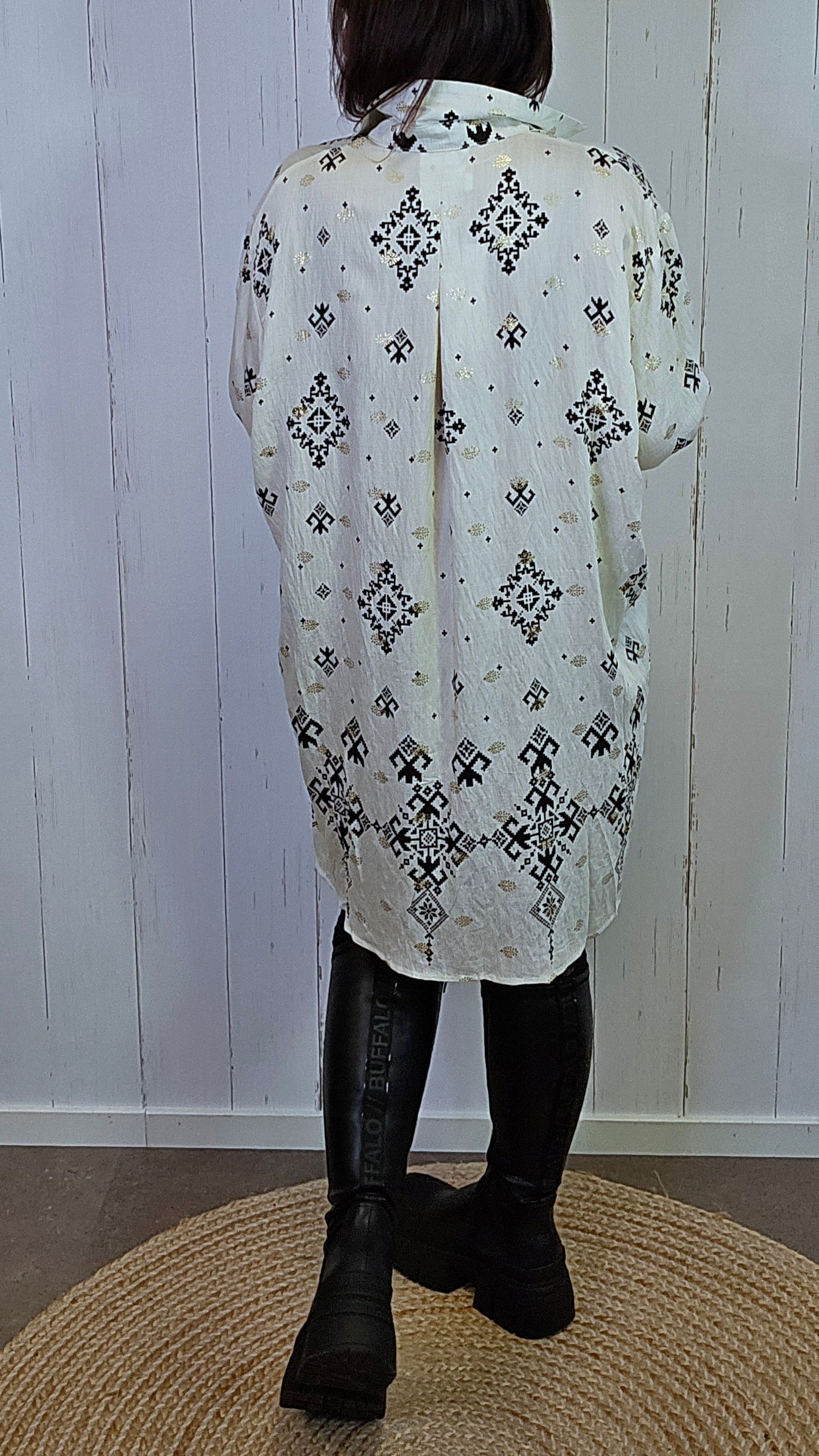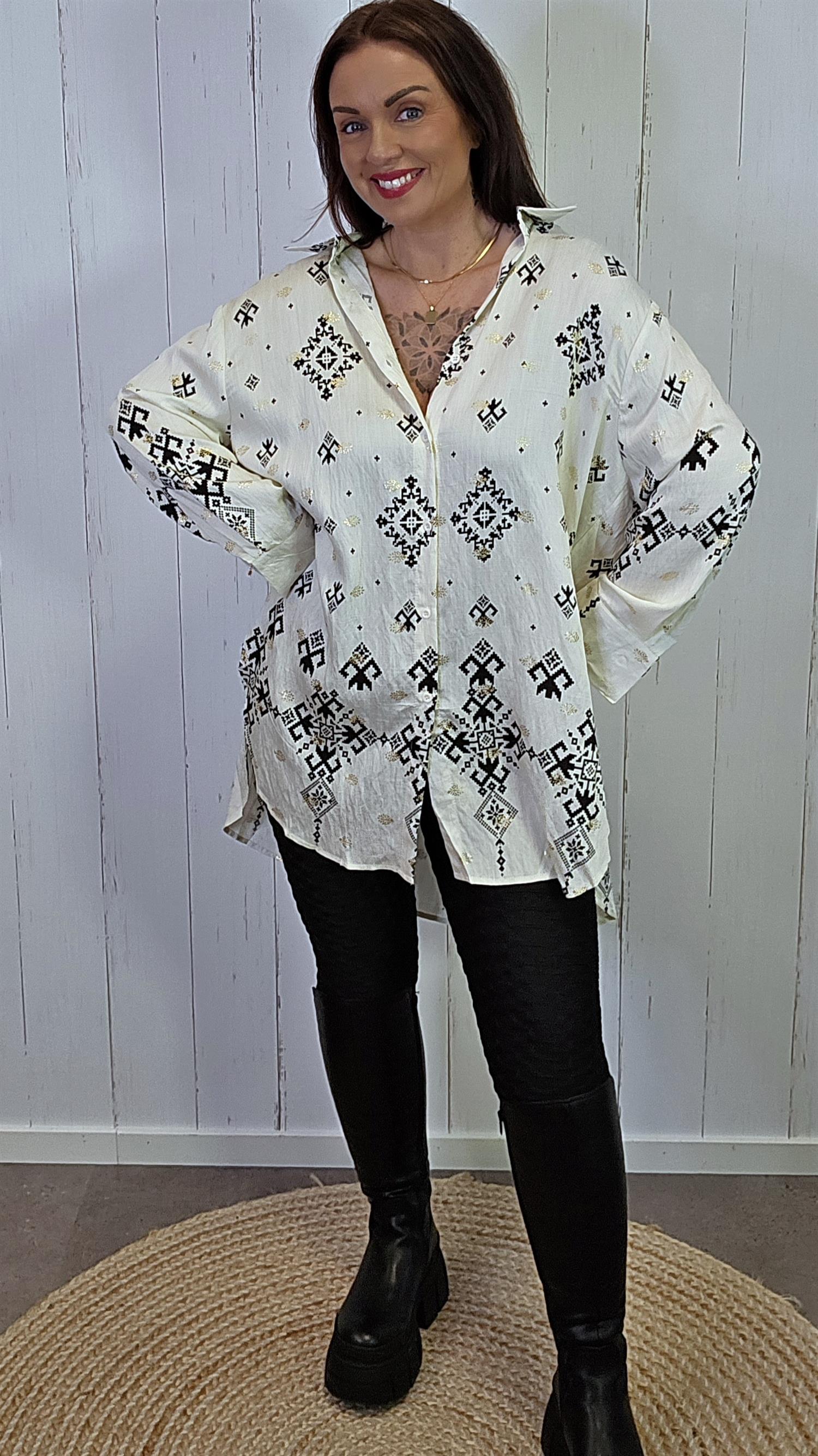Mila skjorte er en unik og dekorativ langskjorte i beige med sorte og gyldne broderiinspirerte mønstre. Den har klassisk krage, knappelukking foran og lange ermer med mansjett. Det lette stoffet faller pent og gir et eksklusivt uttrykk med et hint av bohemsk eleganse.