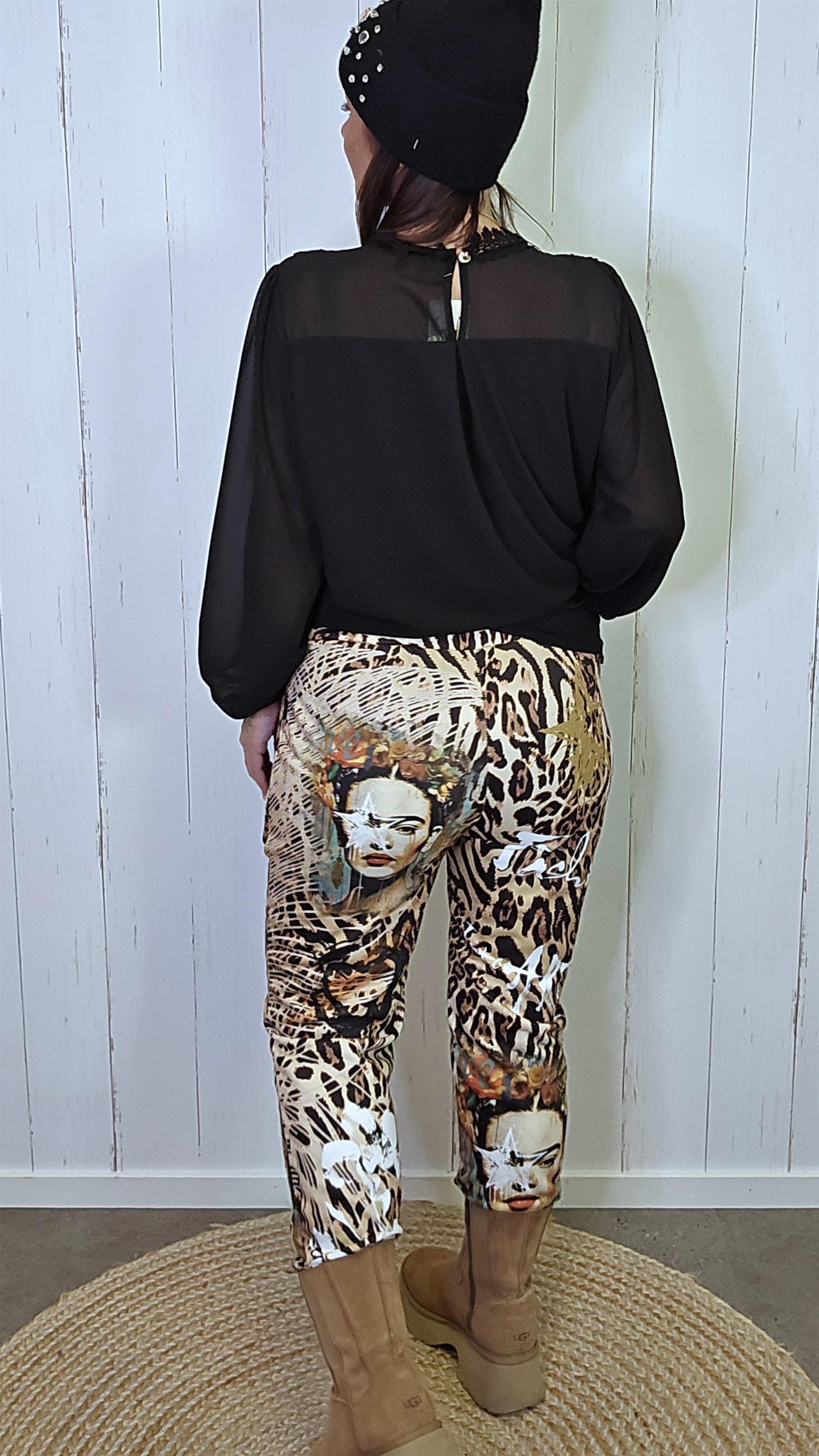 Stilsikker bukse i myk og lett kvalitet med leopardmønster og unikt kunstnerisk print. Modellen har strikk i livet for god komfort og passer både til en avslappet hverdagsstil og til mer uttrykksfulle antrekk.