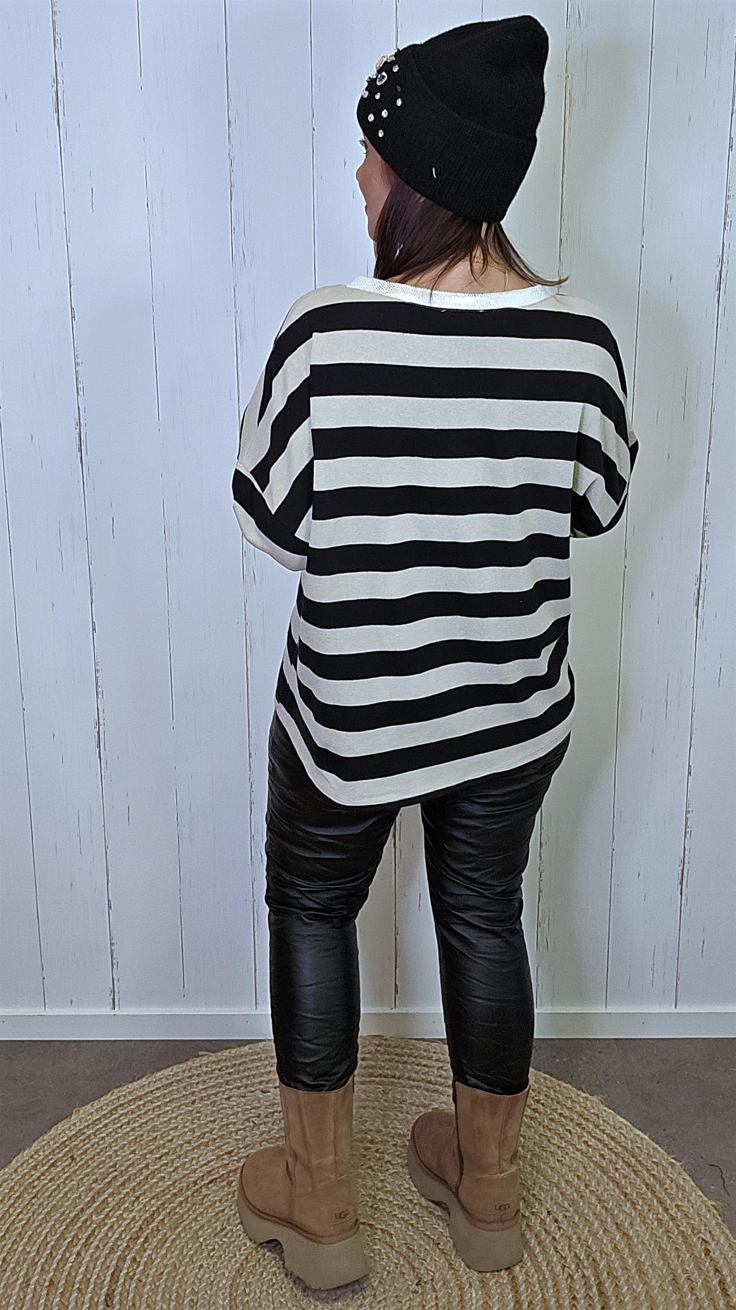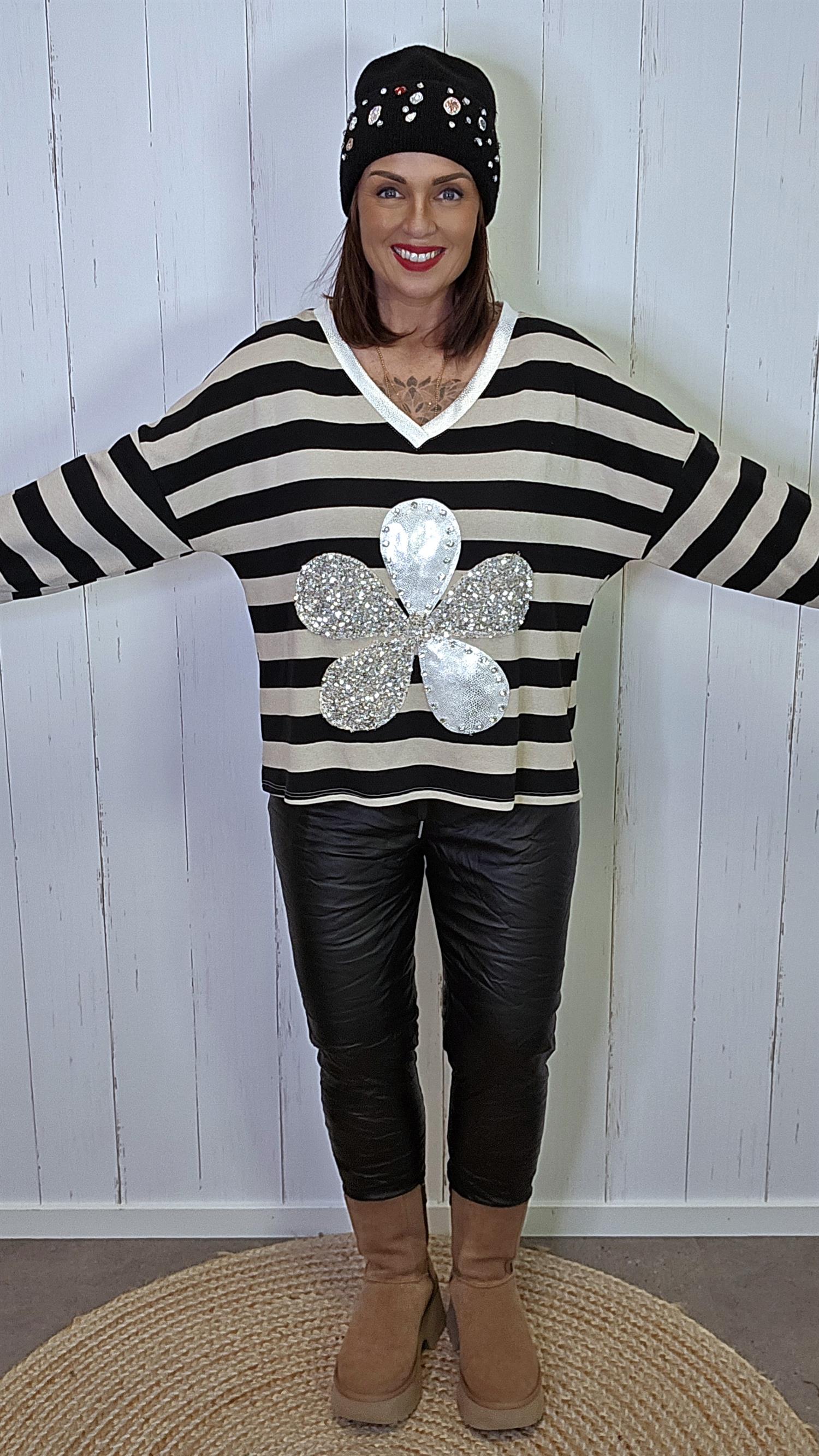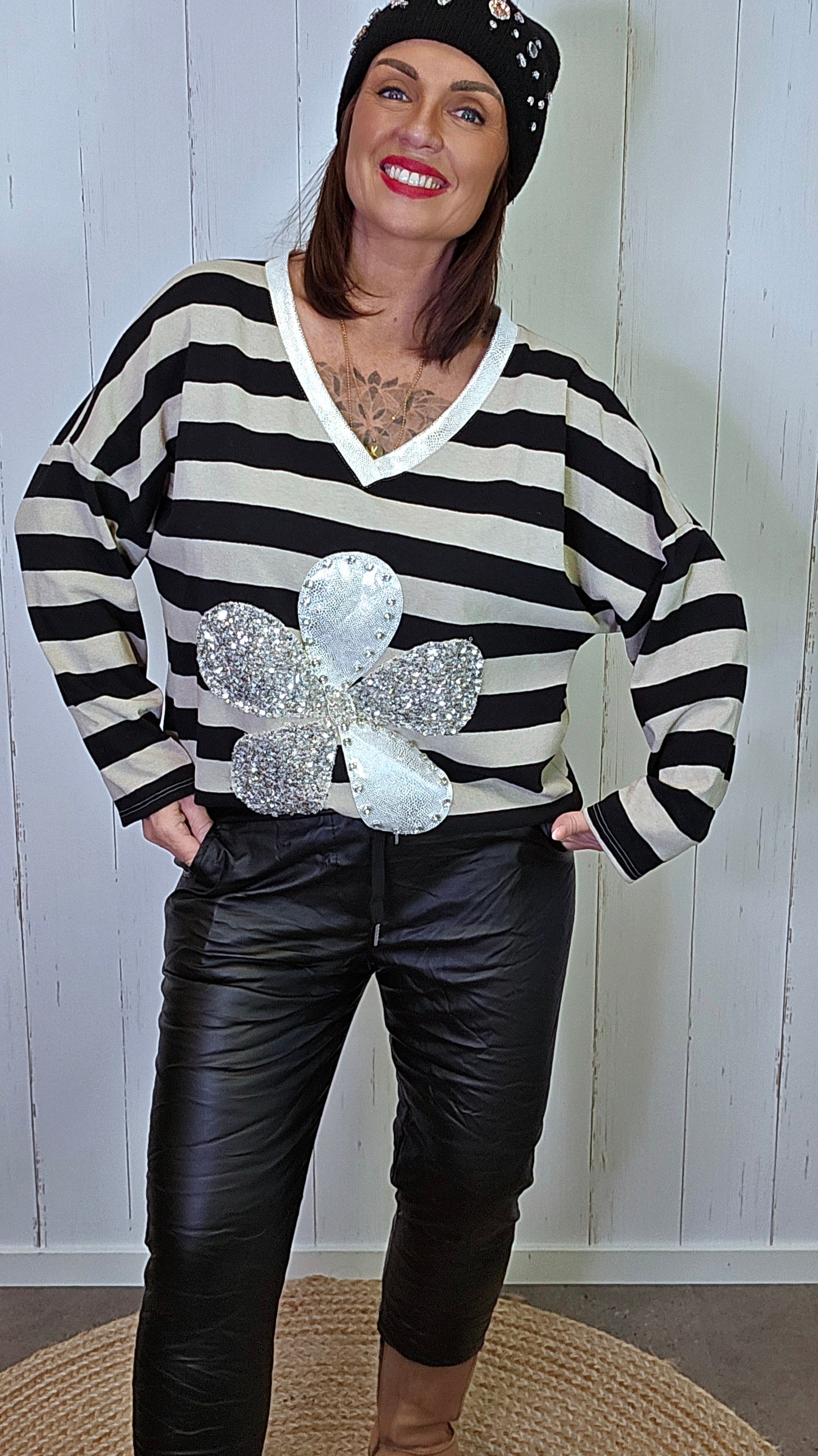 Myk og behagelig genser i sort og beige striper med V-hals og et dekorativt blomstermotiv foran i glitrende paljetter og skinn-detaljer. Den lette kvaliteten gjør den perfekt både alene og under jakker eller blazere.