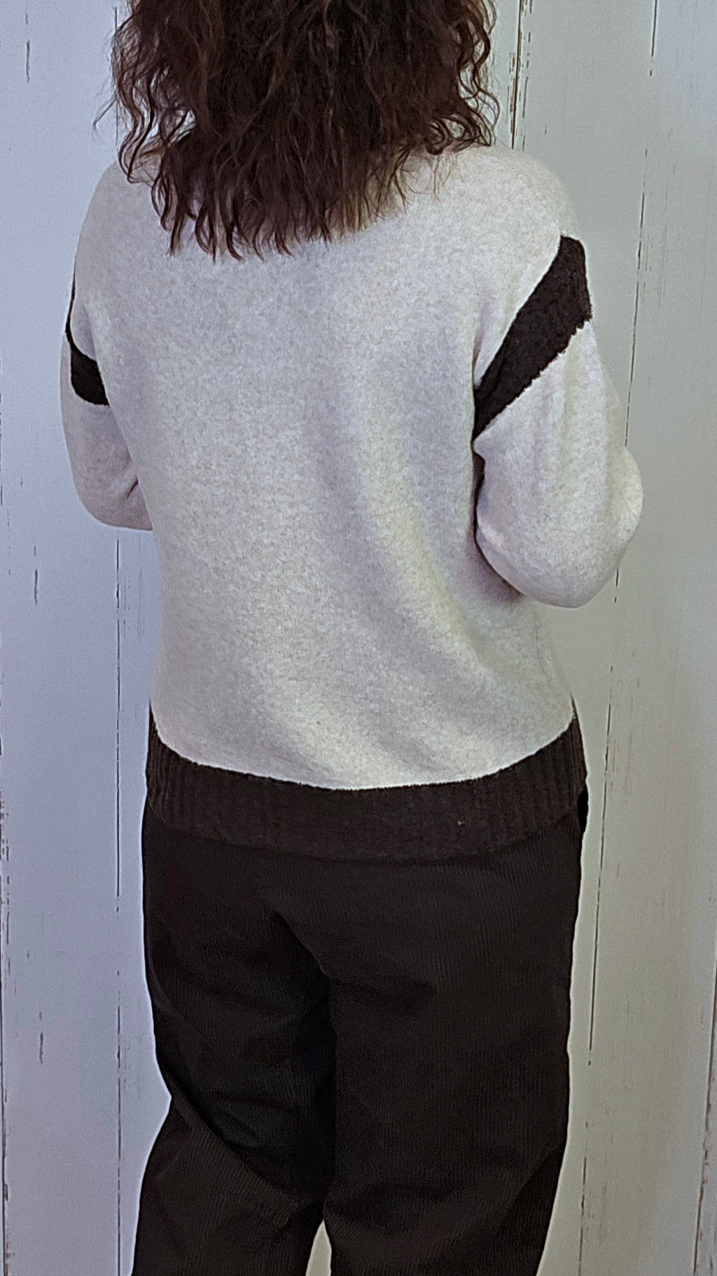 Myk og trendy genser i beige med kontrastfelt i dyp brun. Den har høy, ribbestrikket hals og dekorative SOHO-bokstaver foran i strukturert stoff med sømdetaljer som gir et eksklusivt uttrykk. Genseren har et avslappet snitt med nedfalne skuldre og ribbestrikkede kanter på ermer og nederkant for en komfortabel og moderne passform.