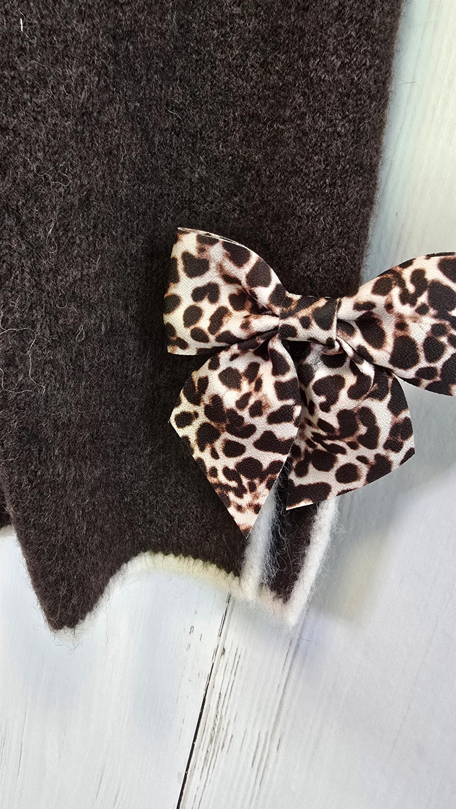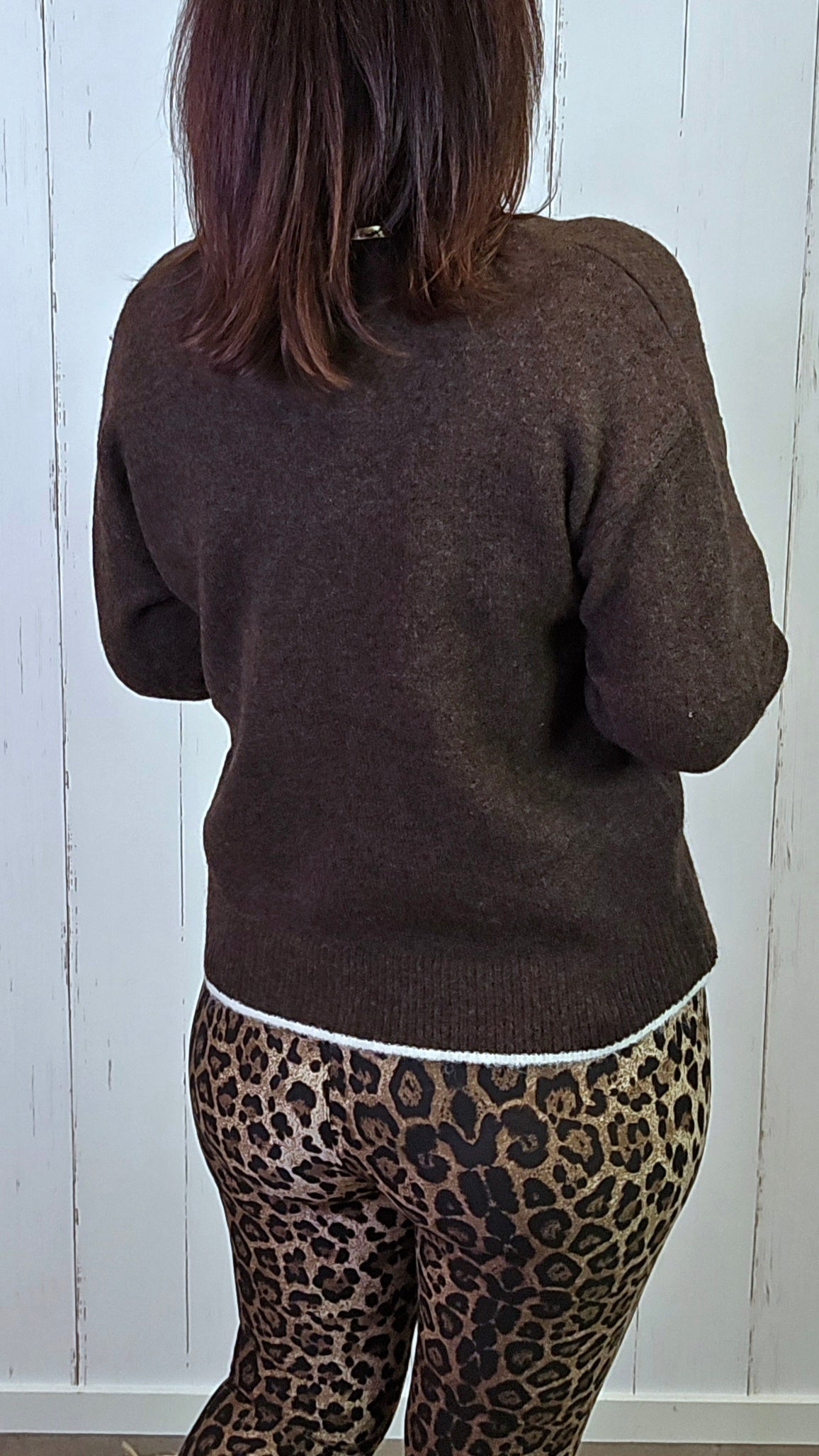 Myk og feminin genser i dyp brun med store, dekorative bokstaver foran i leopardmønster med teksten LOVE YOURSELF FIRST. Genseren har en dyp V-hals og lekre detaljer som små splitter nederst på ermene og på sidene, samt sløyfer i matchende leopardmønster. De hvite kontrastkantene langs ermene og nederst gir et friskt og eksklusivt preg.