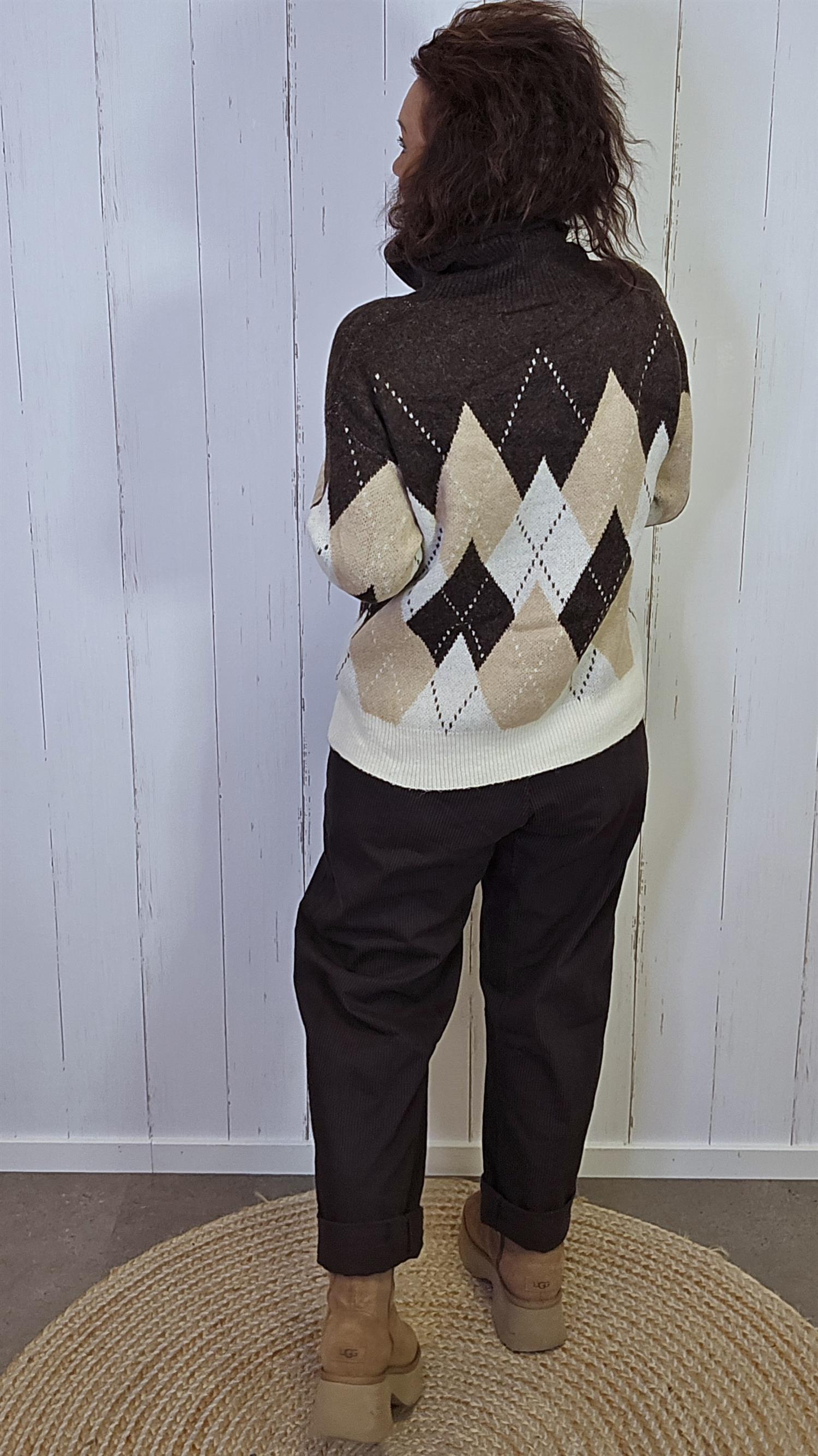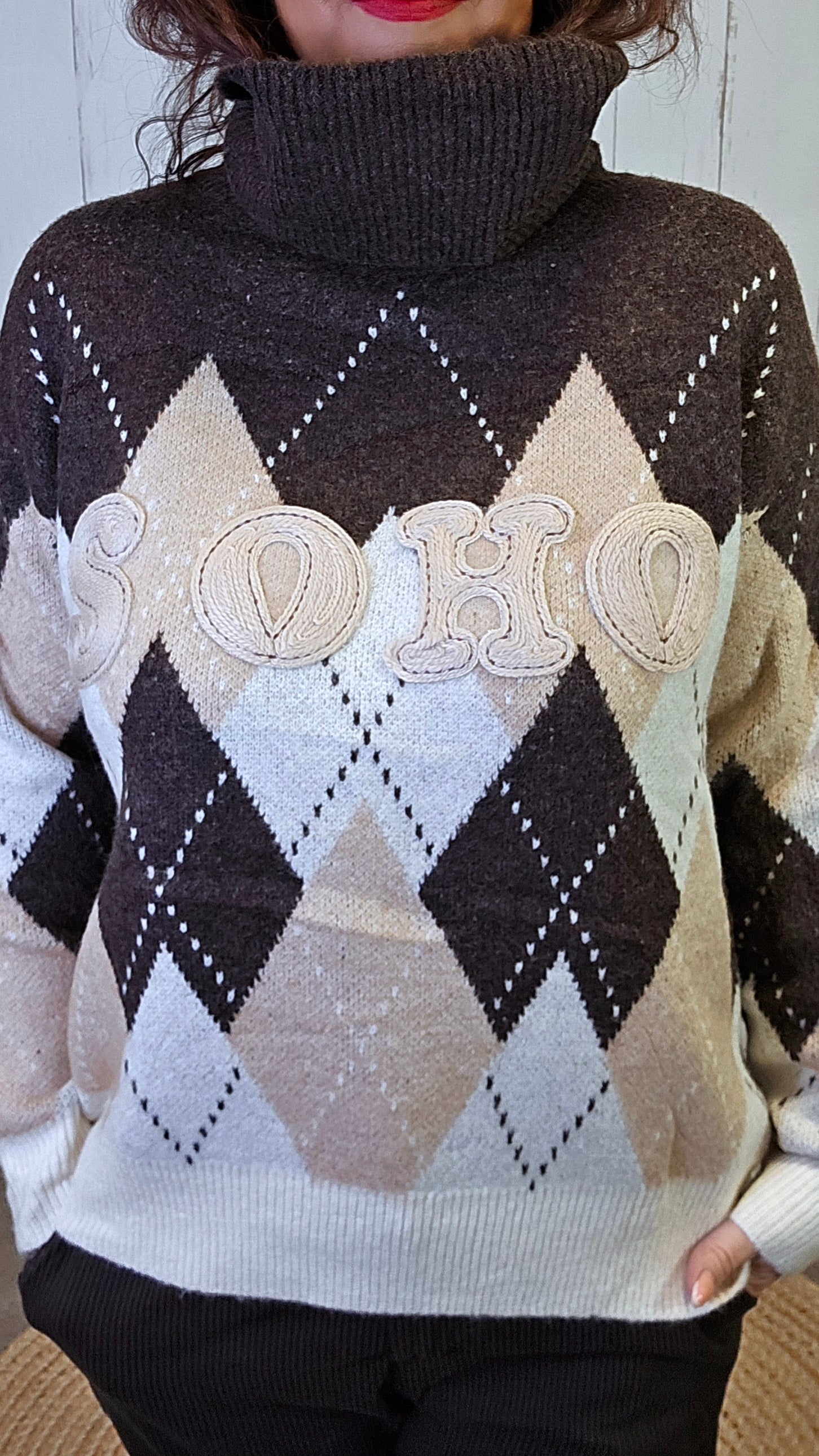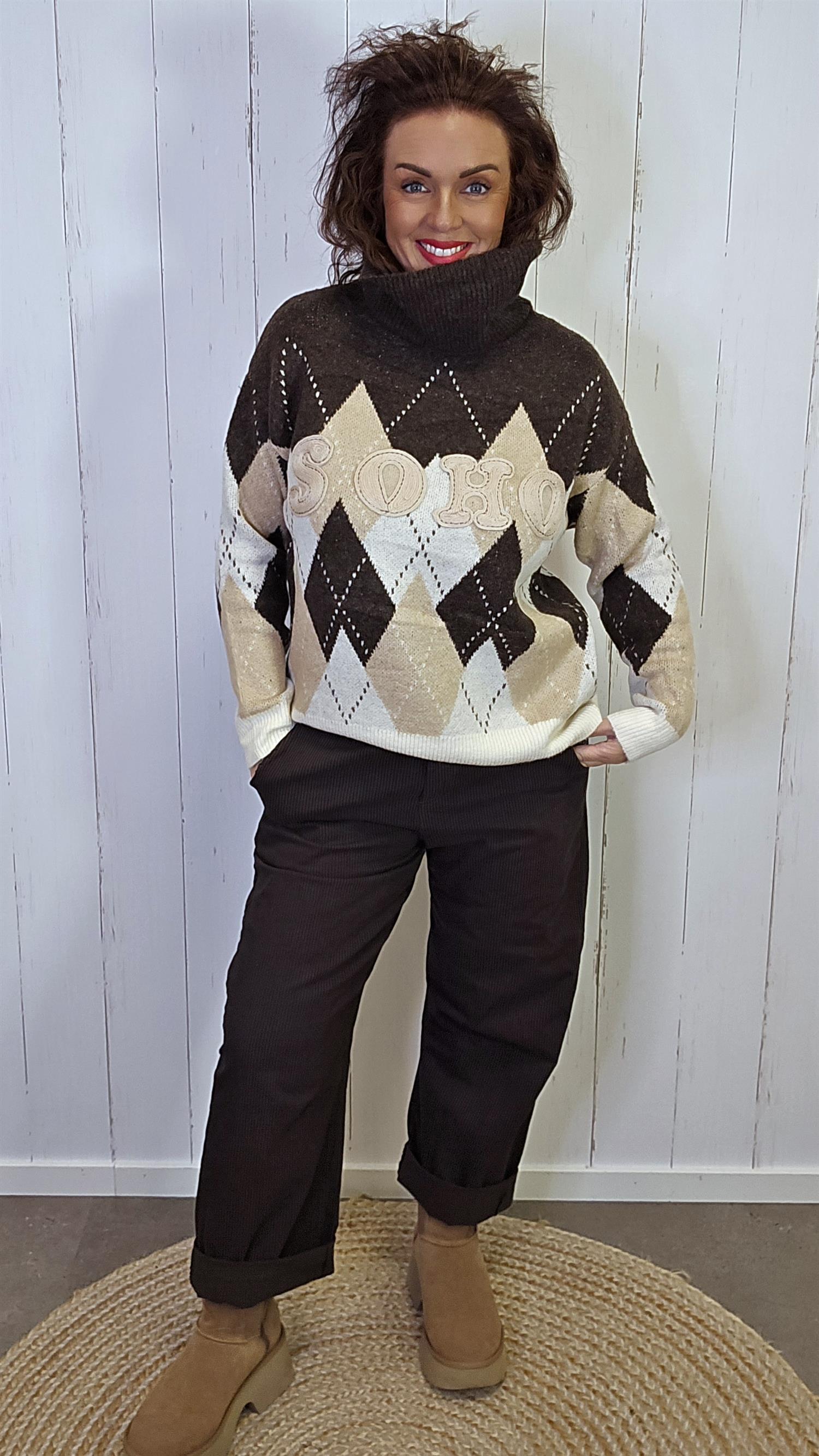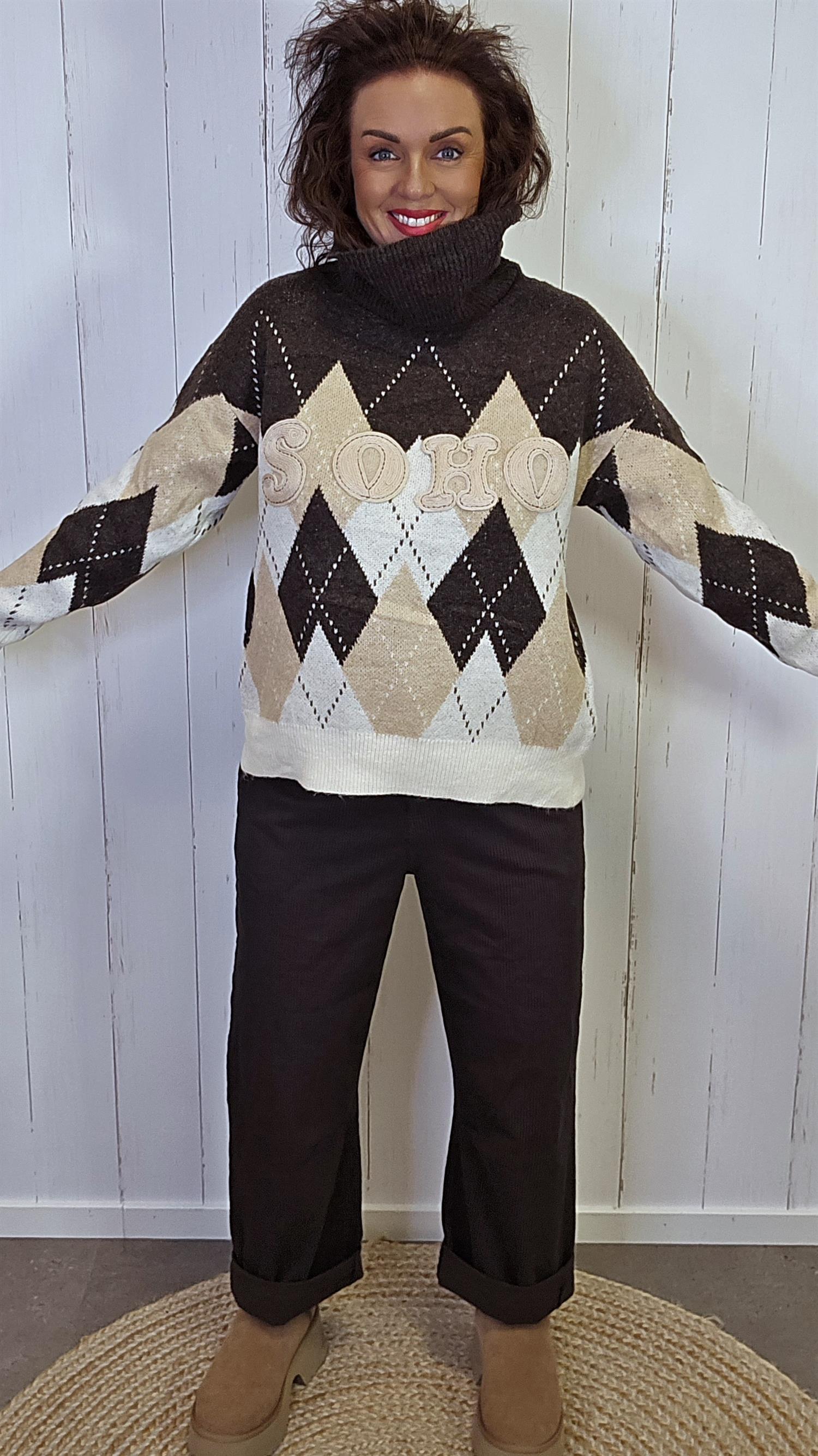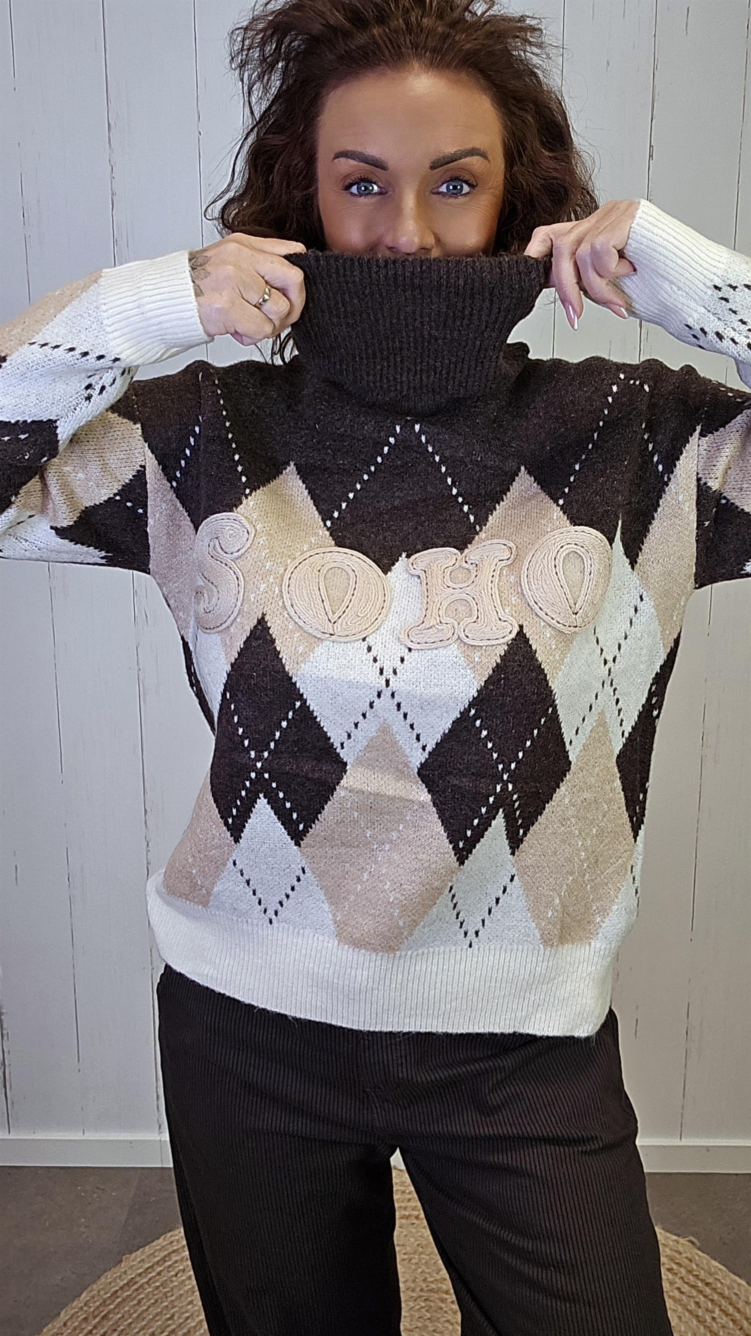 SOHO Mønstret Genser i brun kombinerer klassisk ruter med en moderne og leken touch. Genseren har et vakkert rutemønster i jordnære toner av brun, beige og krem, og teksten “SOHO” i myke bokstaver på brystet som gir et sporty preg. Den har høy hals med løs polokrage og lange ermer med ribbestrikkede kanter. En lun, myk genser som både varmer og skiller seg ut med sin unike design.