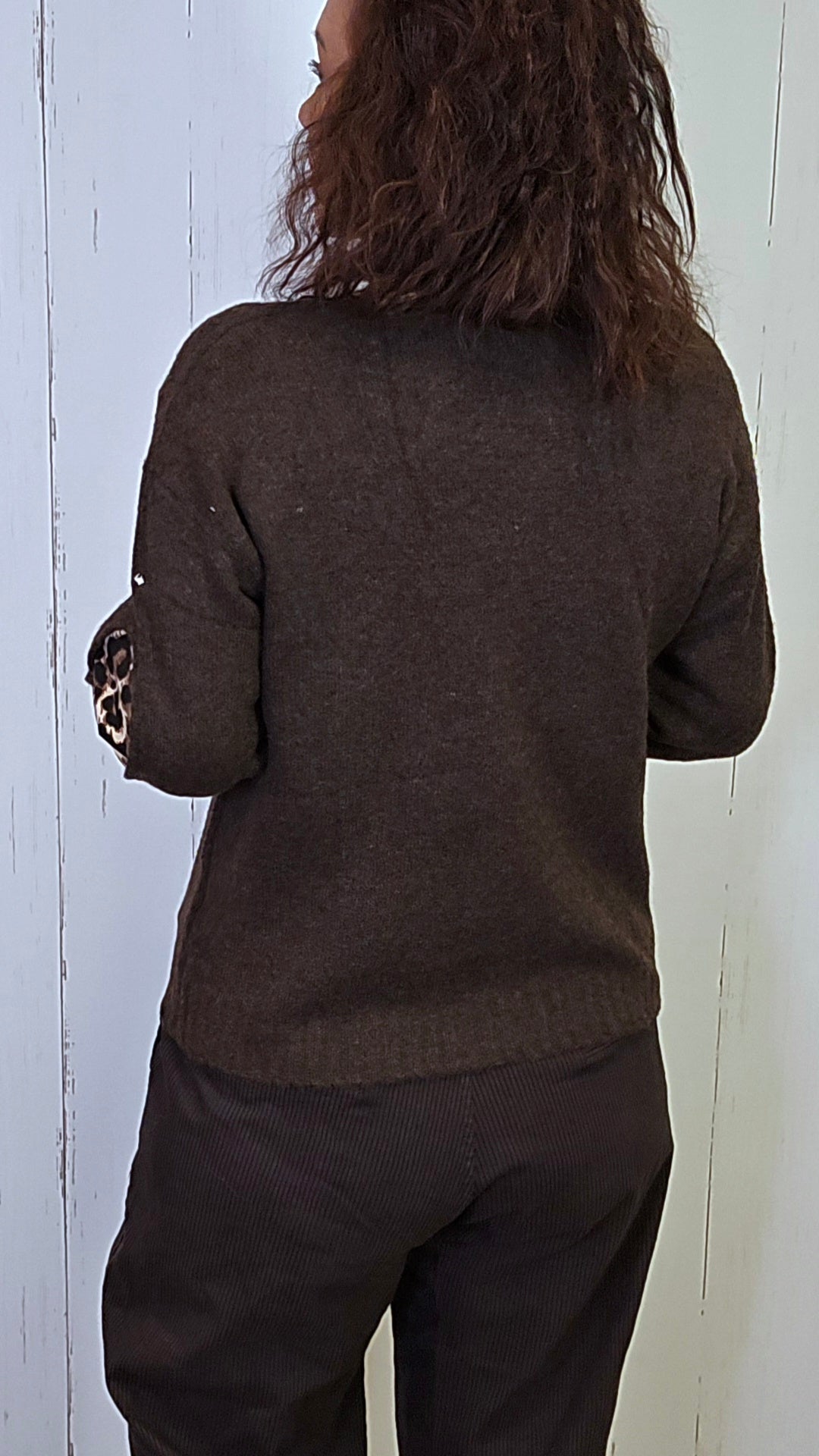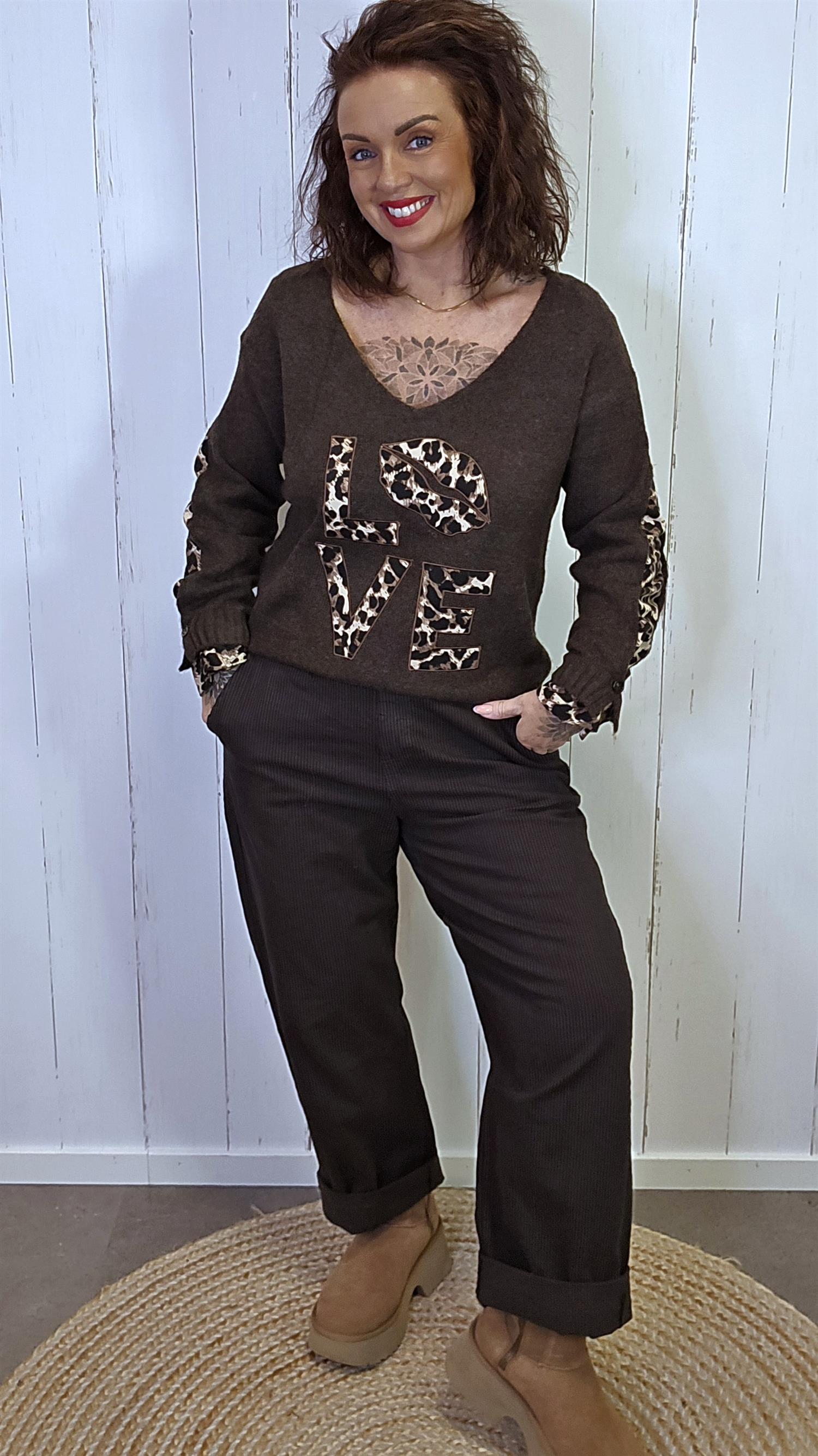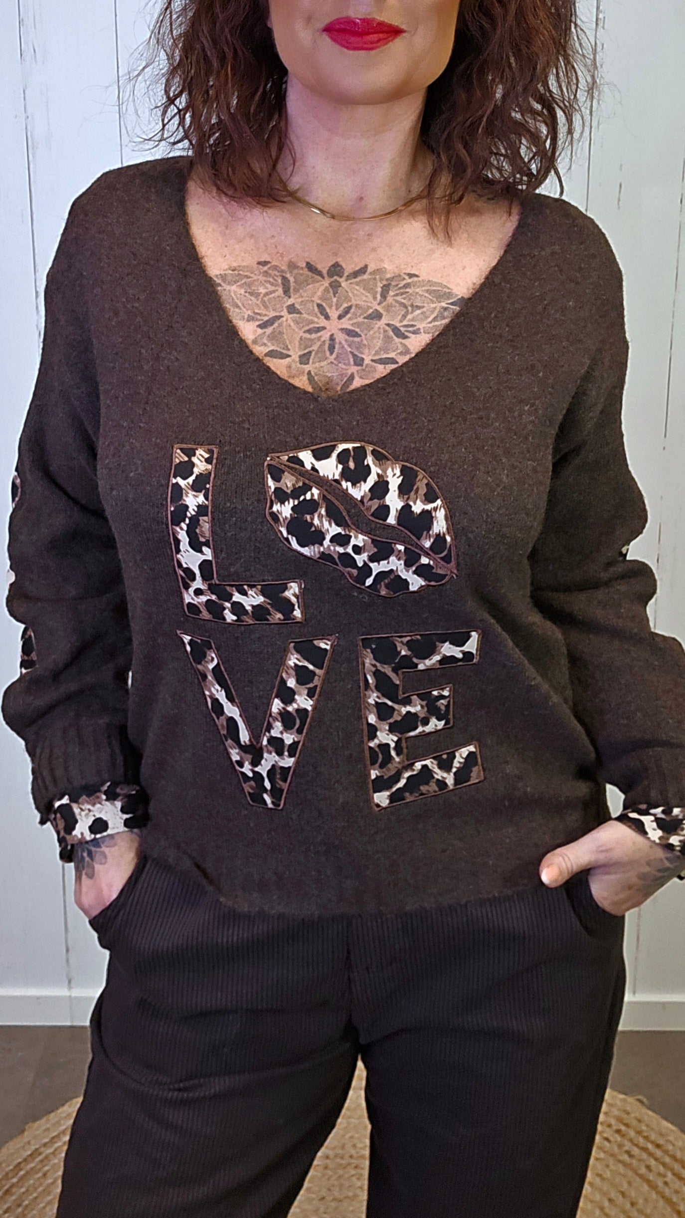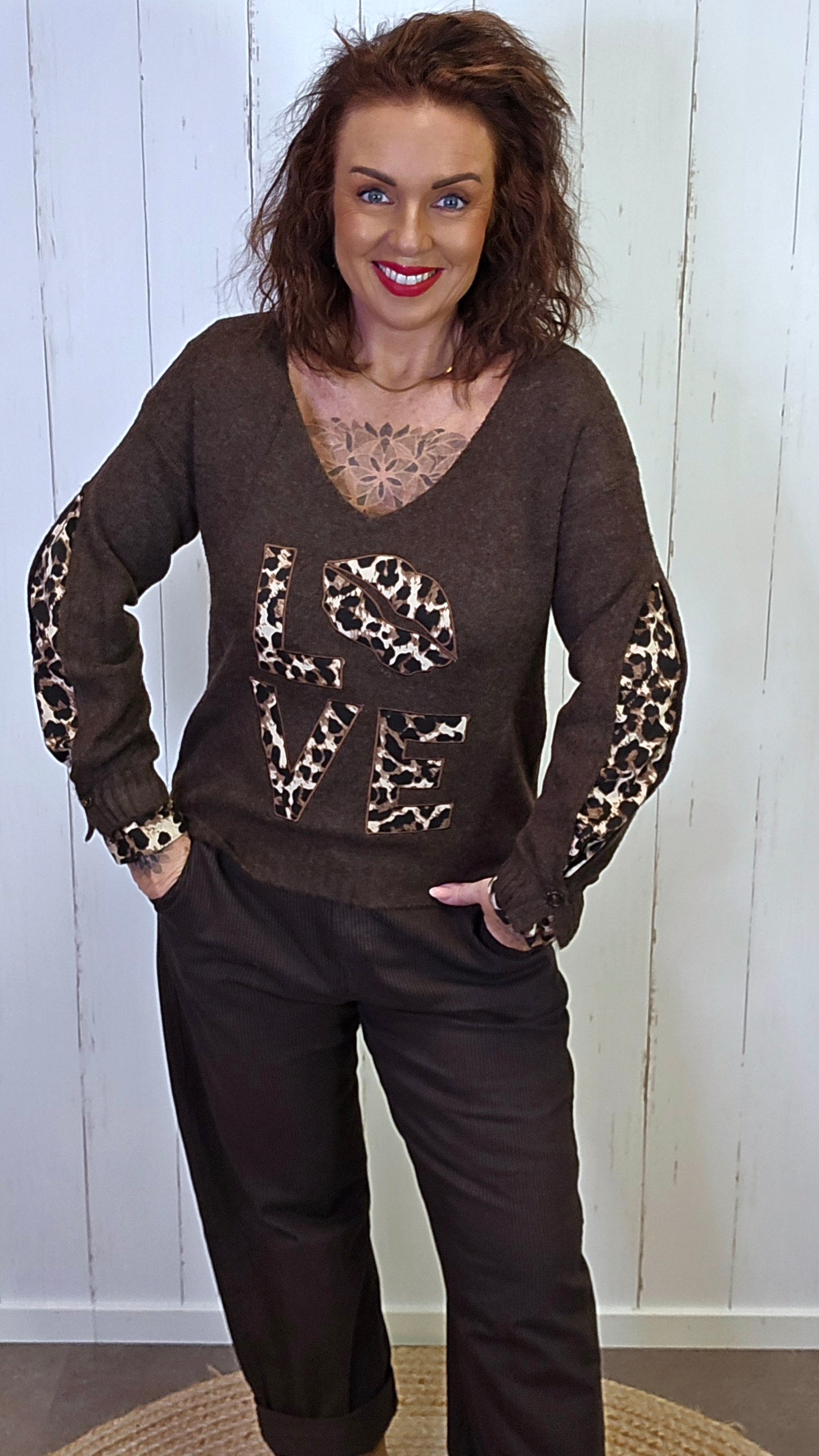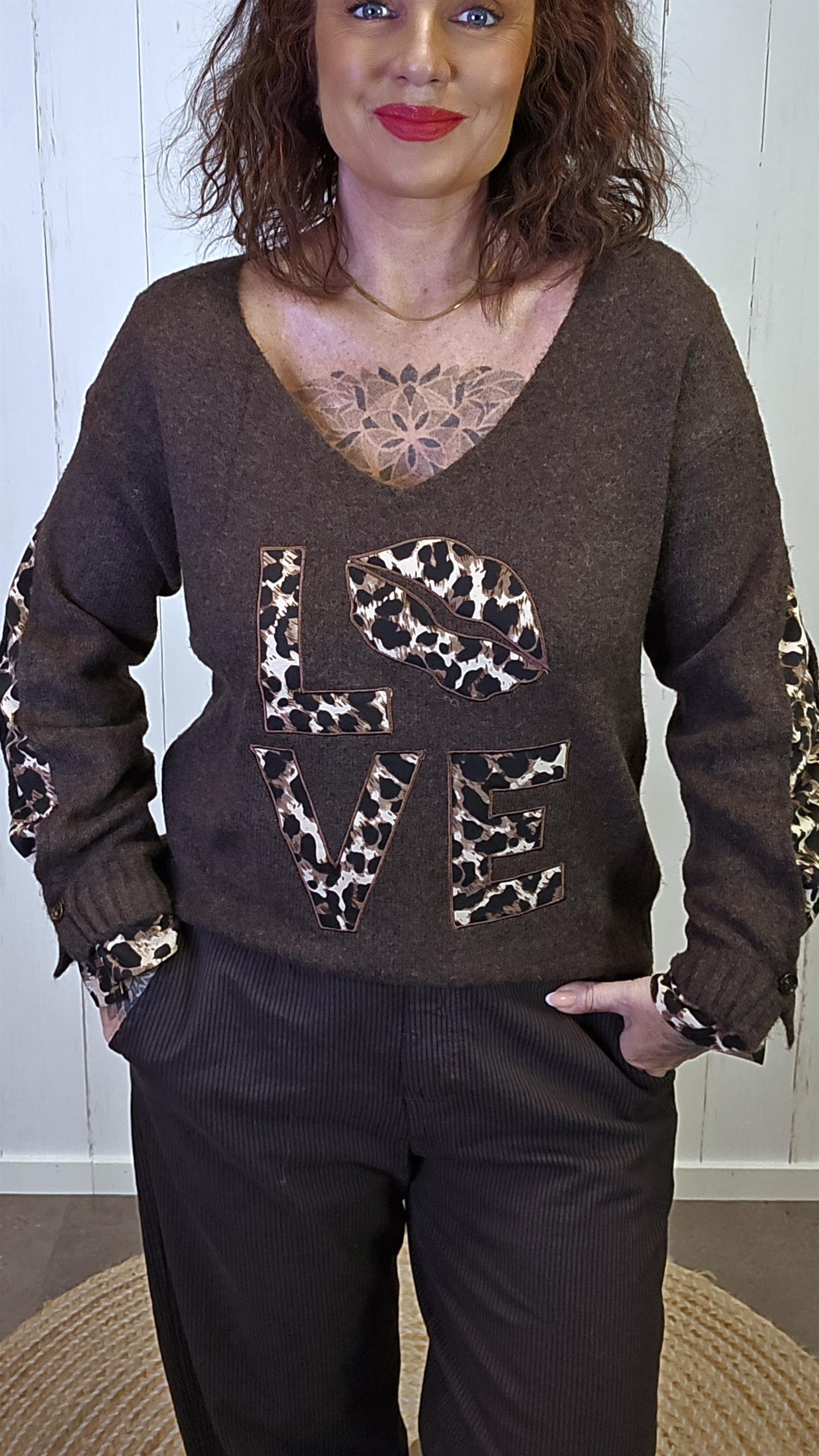 Love Genser i brun er en myk og behagelig genser med lekre leoparddetaljer som gir et feminint og moderne uttrykk. Den har dyp V-hals og teksten “LOVE” i leopardmønster på brystet, som virkelig fanger blikket. Langs ermene finner du leopardfelt som strekker seg fra albuen og ned, og mansjettene er pyntet med knapp og små leoparddetaljer for en gjennomført stil. Passformen er avslappet og lett buet nederst for et flatterende fall.